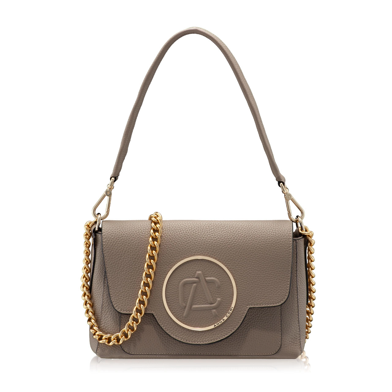 Geanta #TANIA este accesorizată cu emblematica monogramă Anna Cori evidențiată cu un detaliu auriu aduce un plus de strălucire. Această geantă poate fi purtată pe umăr prin mânerul detașabil din piele naturală sau poate fi purtată crossbody datorită lanțului de umăr.
