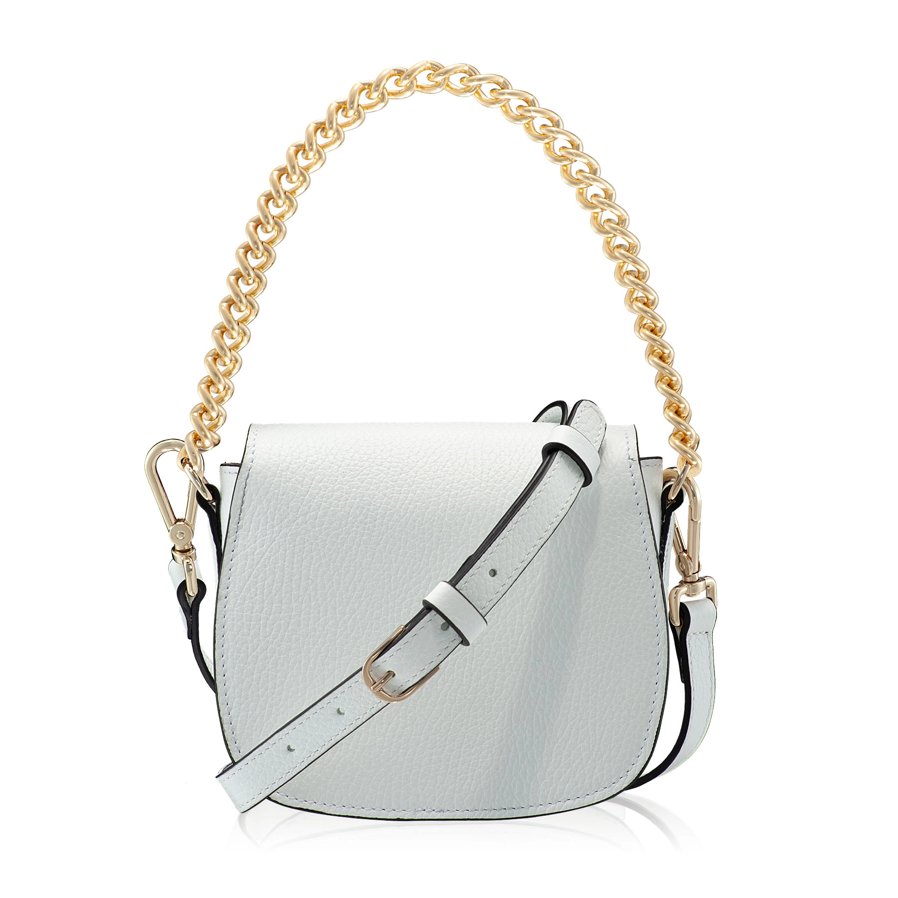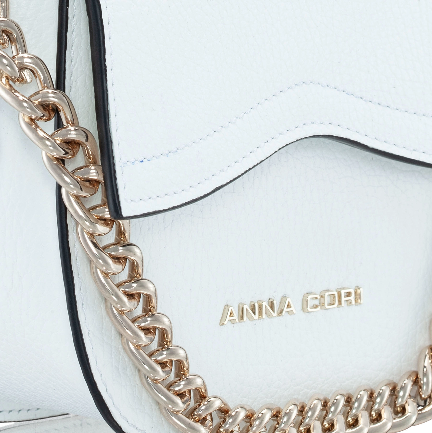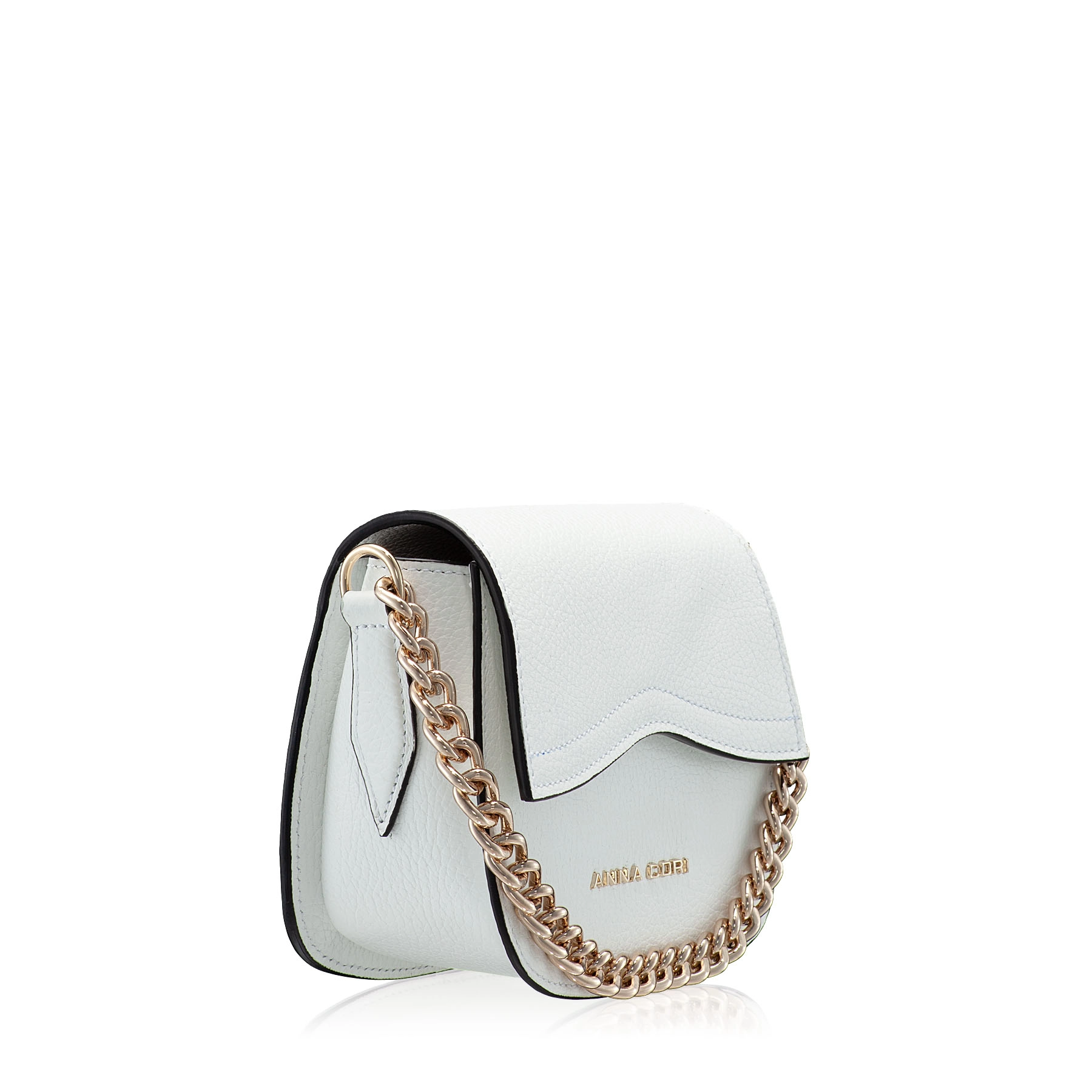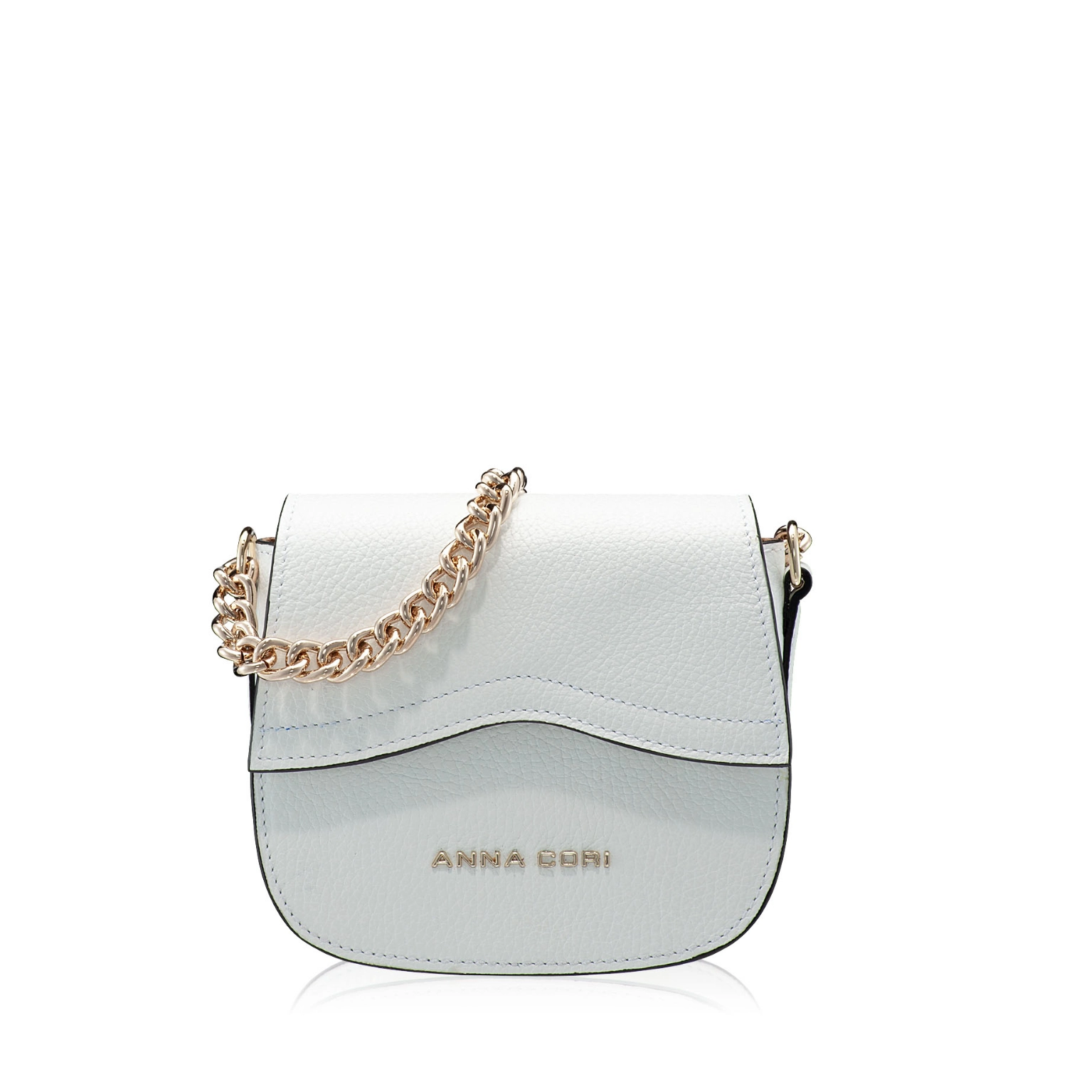 The #NEVADA mini bag is made of natural leather, with a fine texture and accessorized with the Anna Cori logo. It features a gold metal chain and a genuine leather strap for crossbody wear.