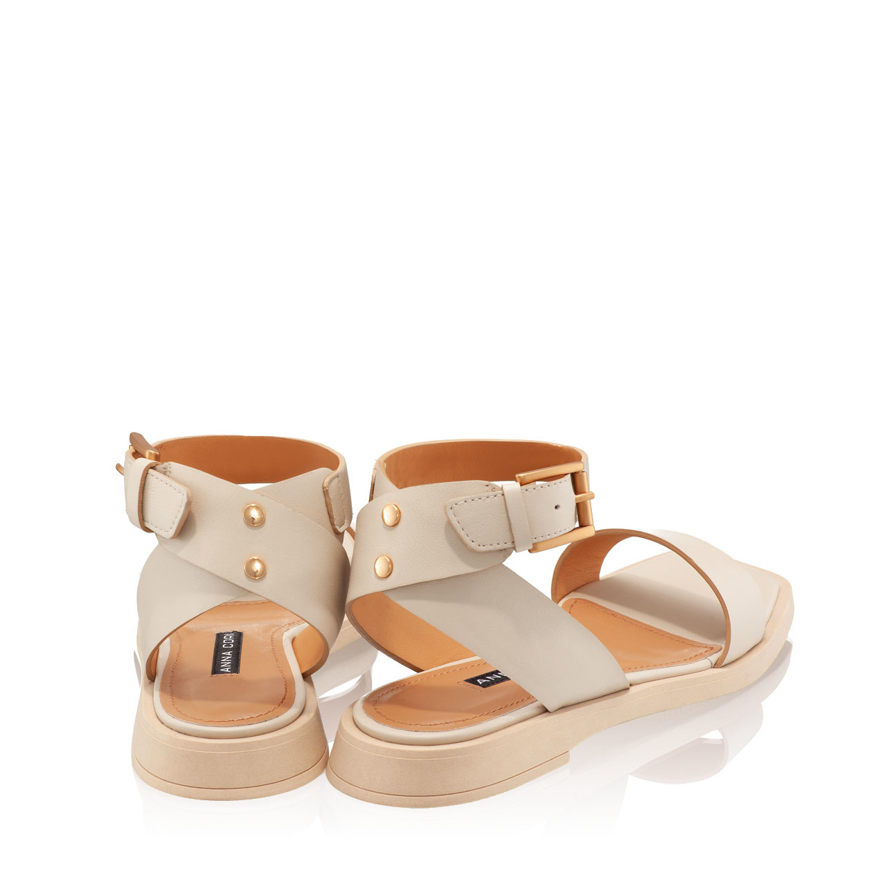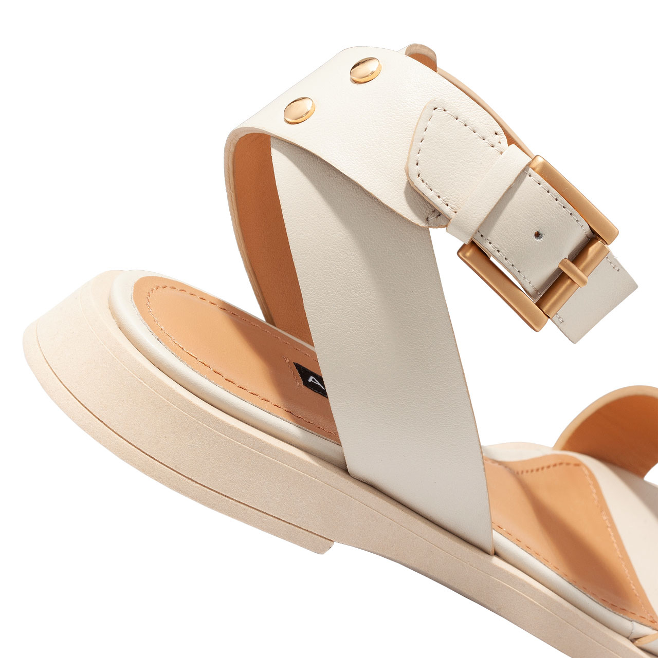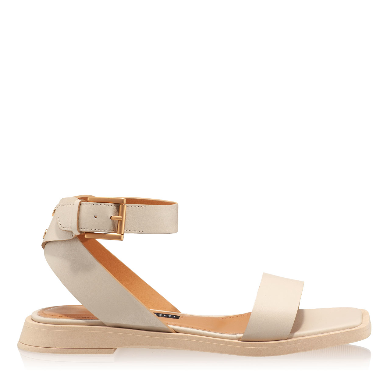 -natural leather-leather lining-straps details-buckle closure-gold color buckle-flat sole