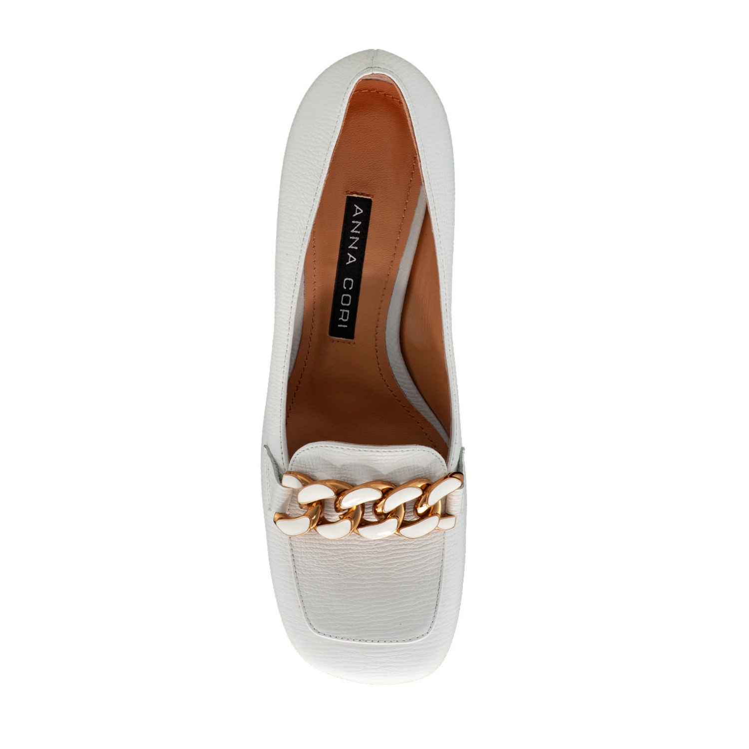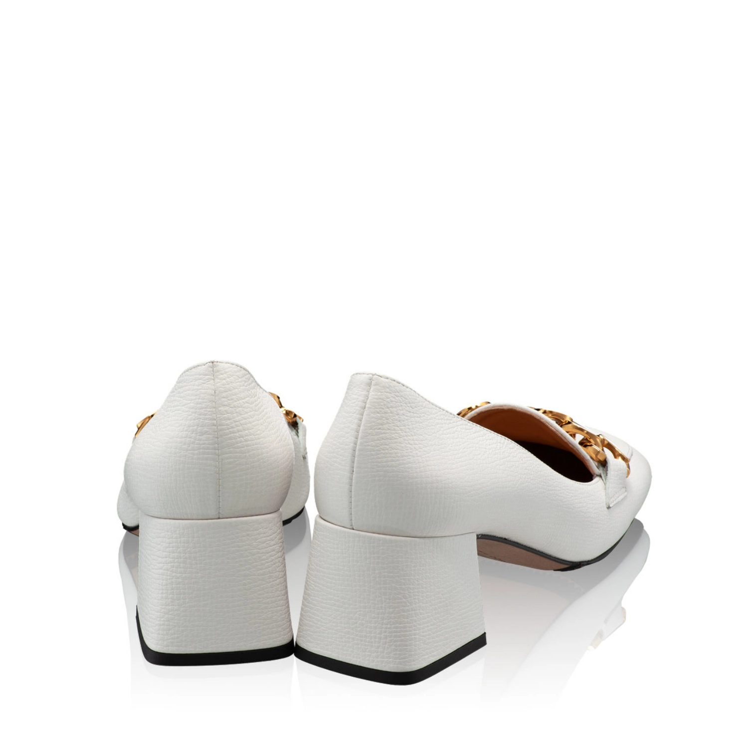 Classic in their simplicity, #LUCINDA shoes are made of natural calf leather and accessorized with a gold metal chain. It features an easy-to-wear heel in a square shape with an medium height of 55mm.