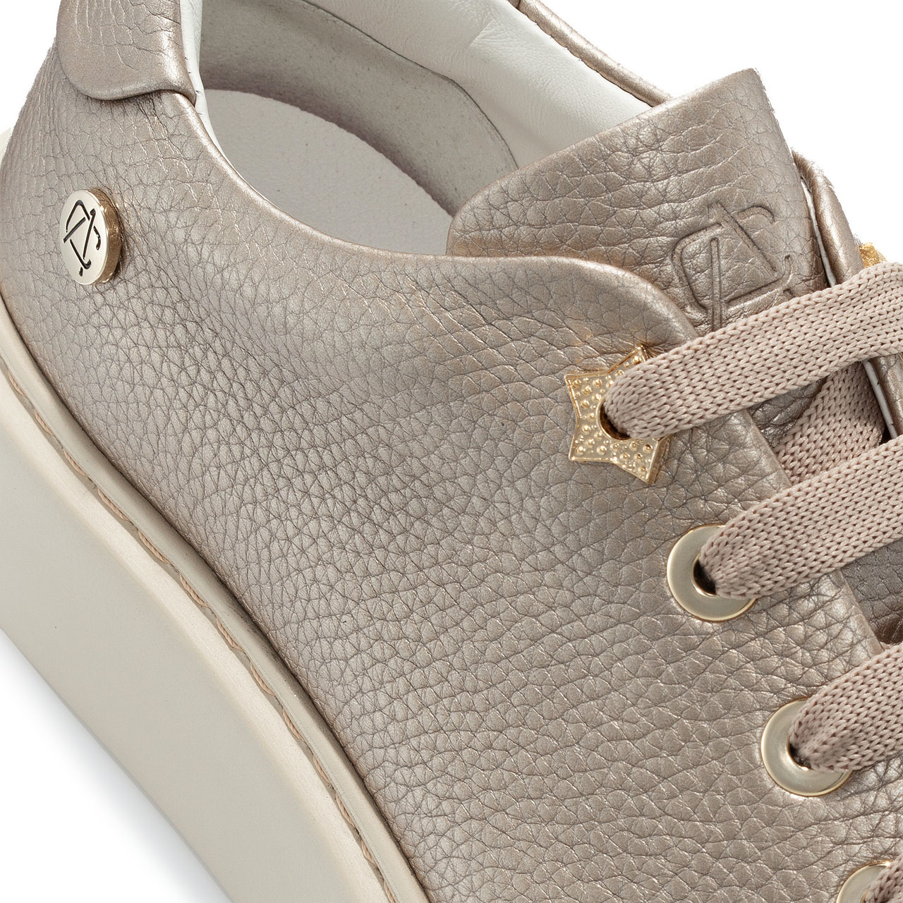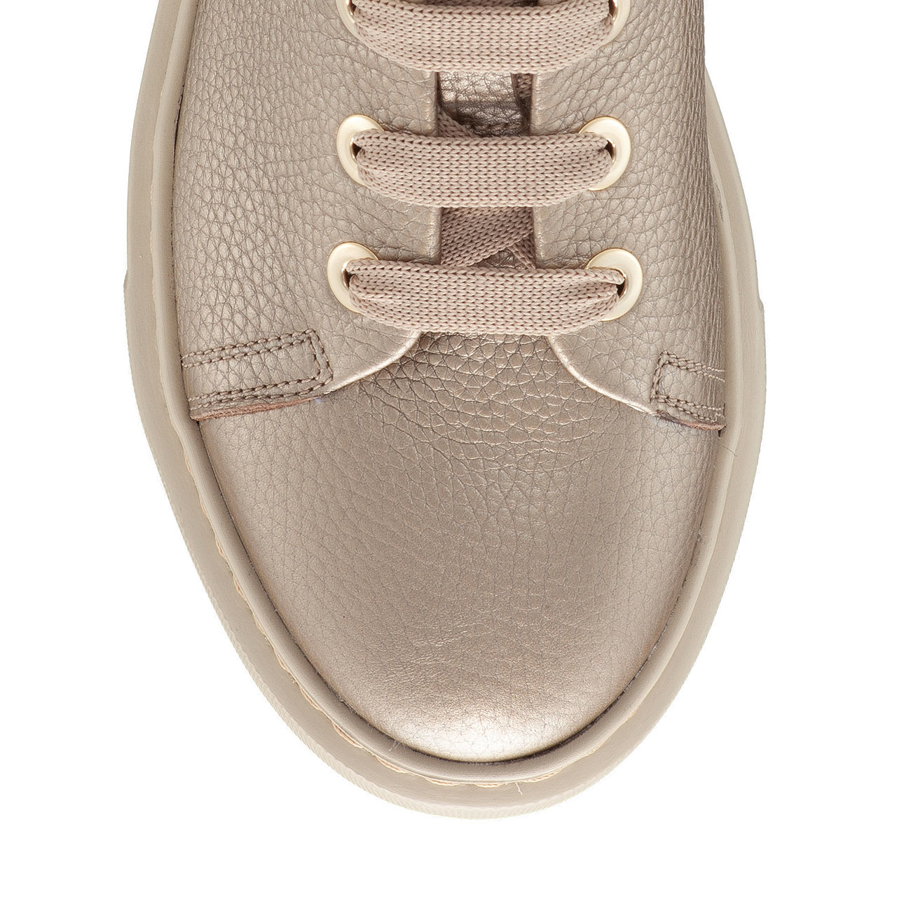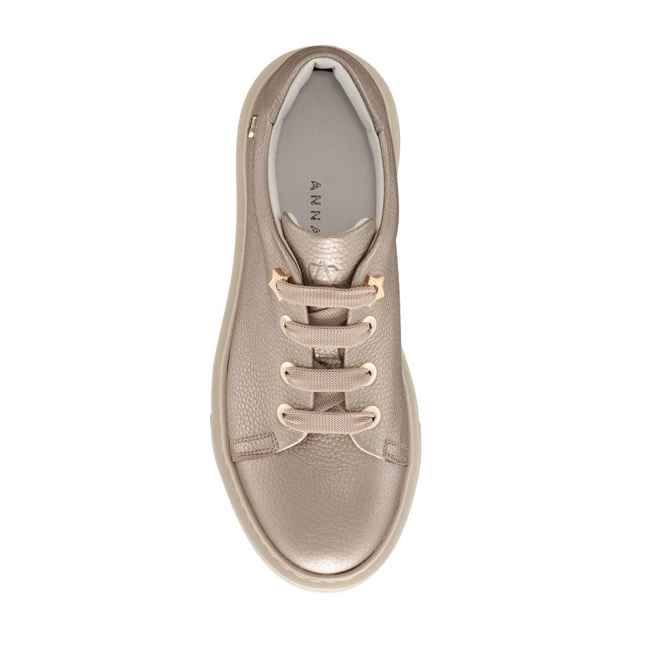 - natural leather- leather lining- lace-up closure- Anna Cori monogram accessory- gold color accessory
