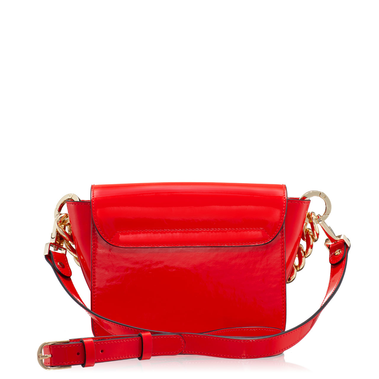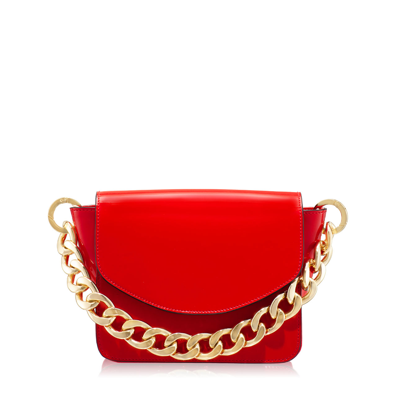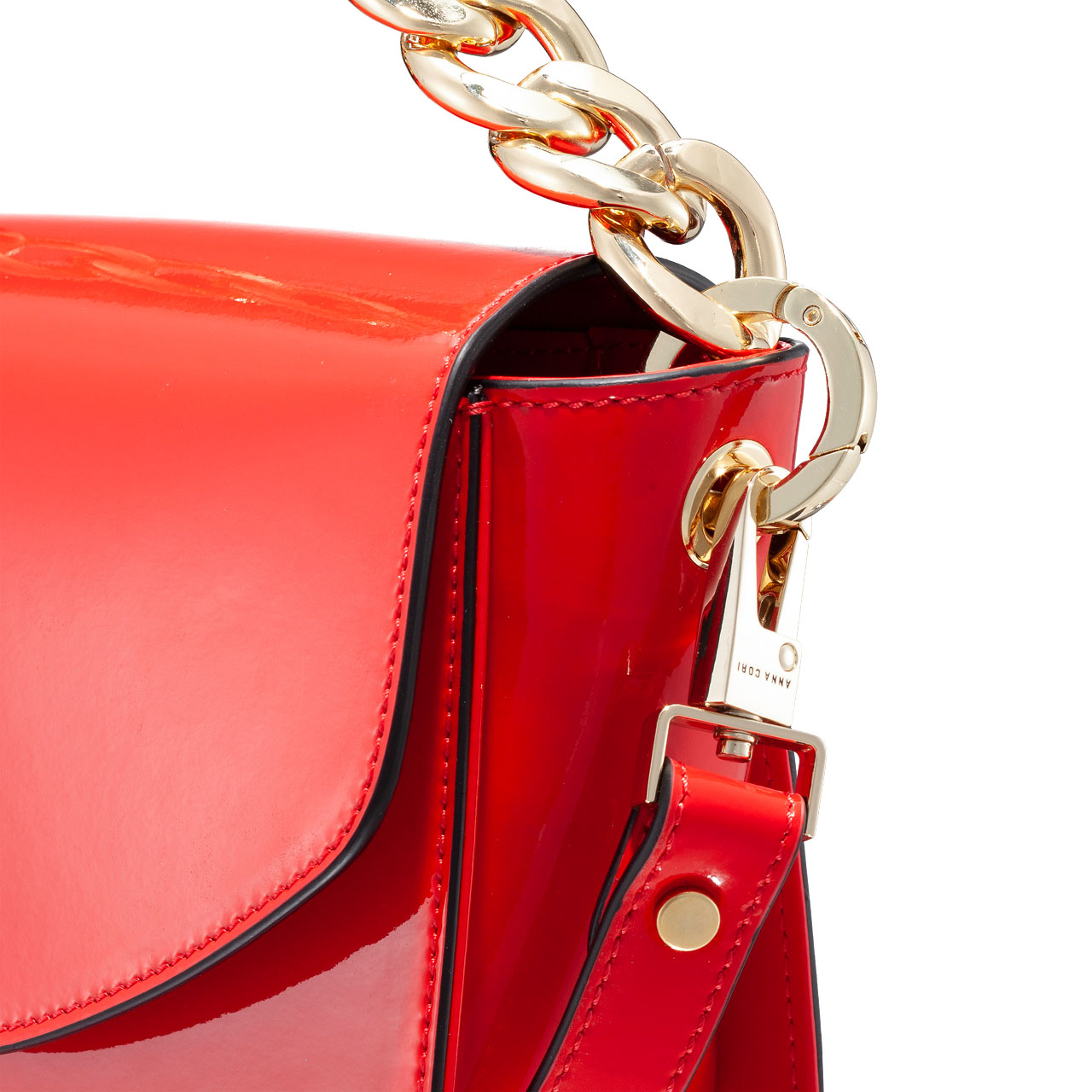 -natural patent leather-one compartment-two interior pocket-personalised with ANNA CORI logo-magnet snap closure-gold color accessory-adjustable and detachable shoulder strap
