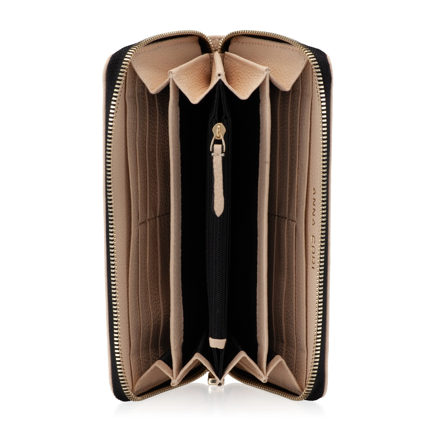 -natural leather-4 internal compartments-8 card holders-one internal zipper pocket-zipper closure