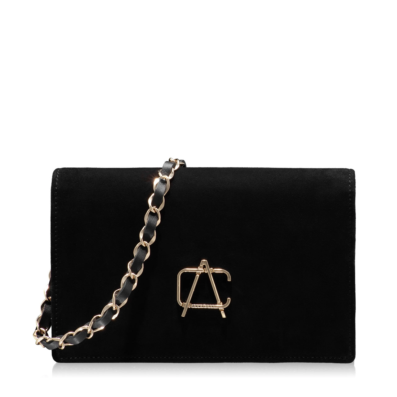 -suede leather-two compartments-one interior zipper pocket-six card holders-personalized with ANNA CORI monogram-magnet closure-detachable shoulder strap
