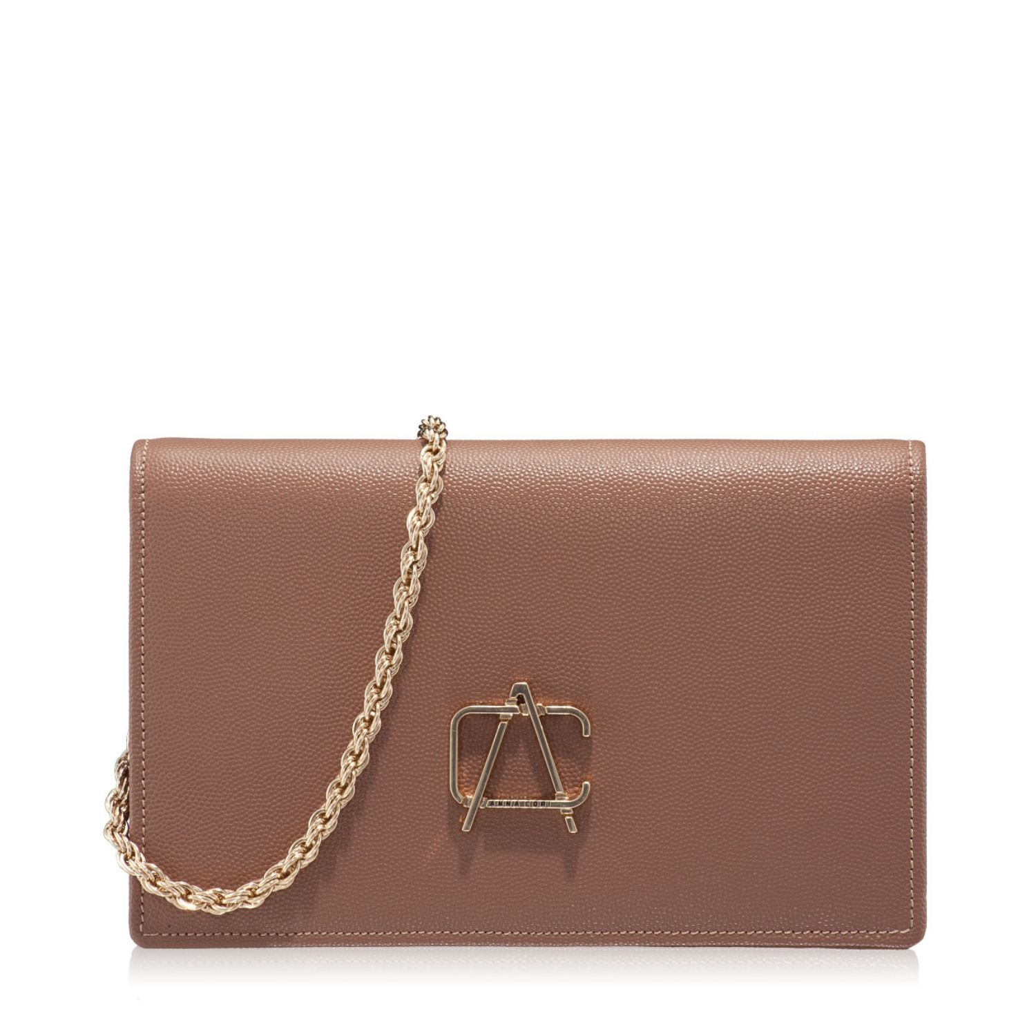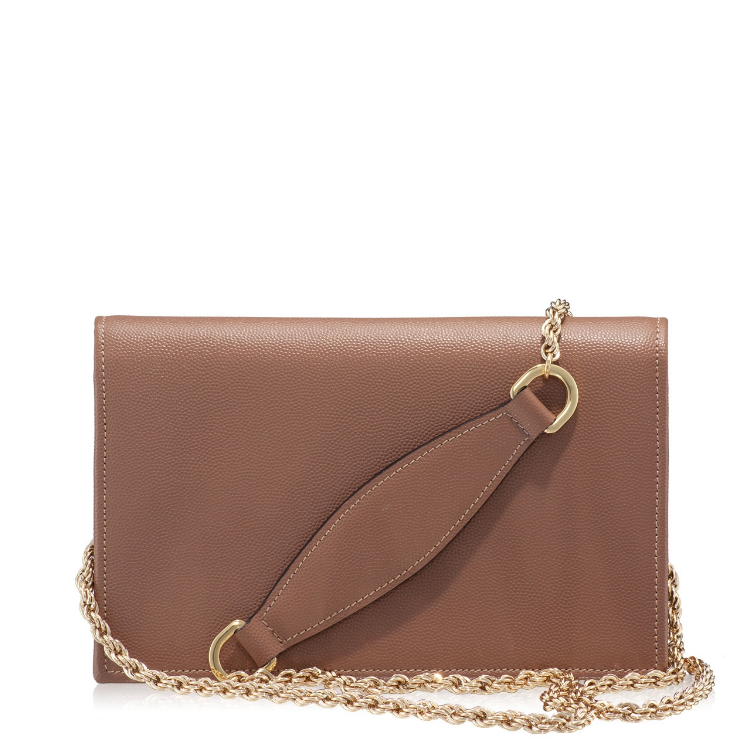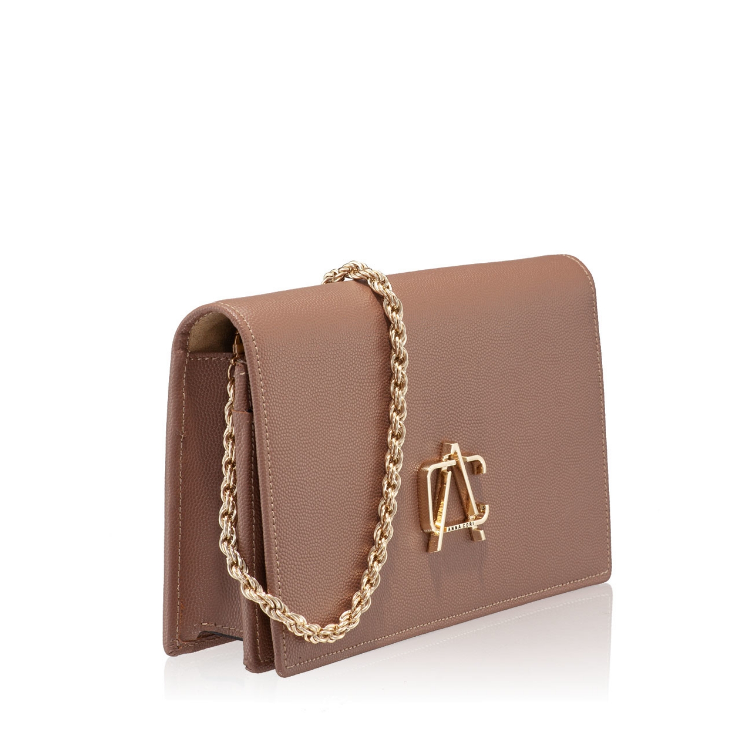 -natural stamp leather-two compartments-one interior zipper pocket-six card holders-personalised with ANNA CORI monogram-magnet closure-detachable shoulder chain strap