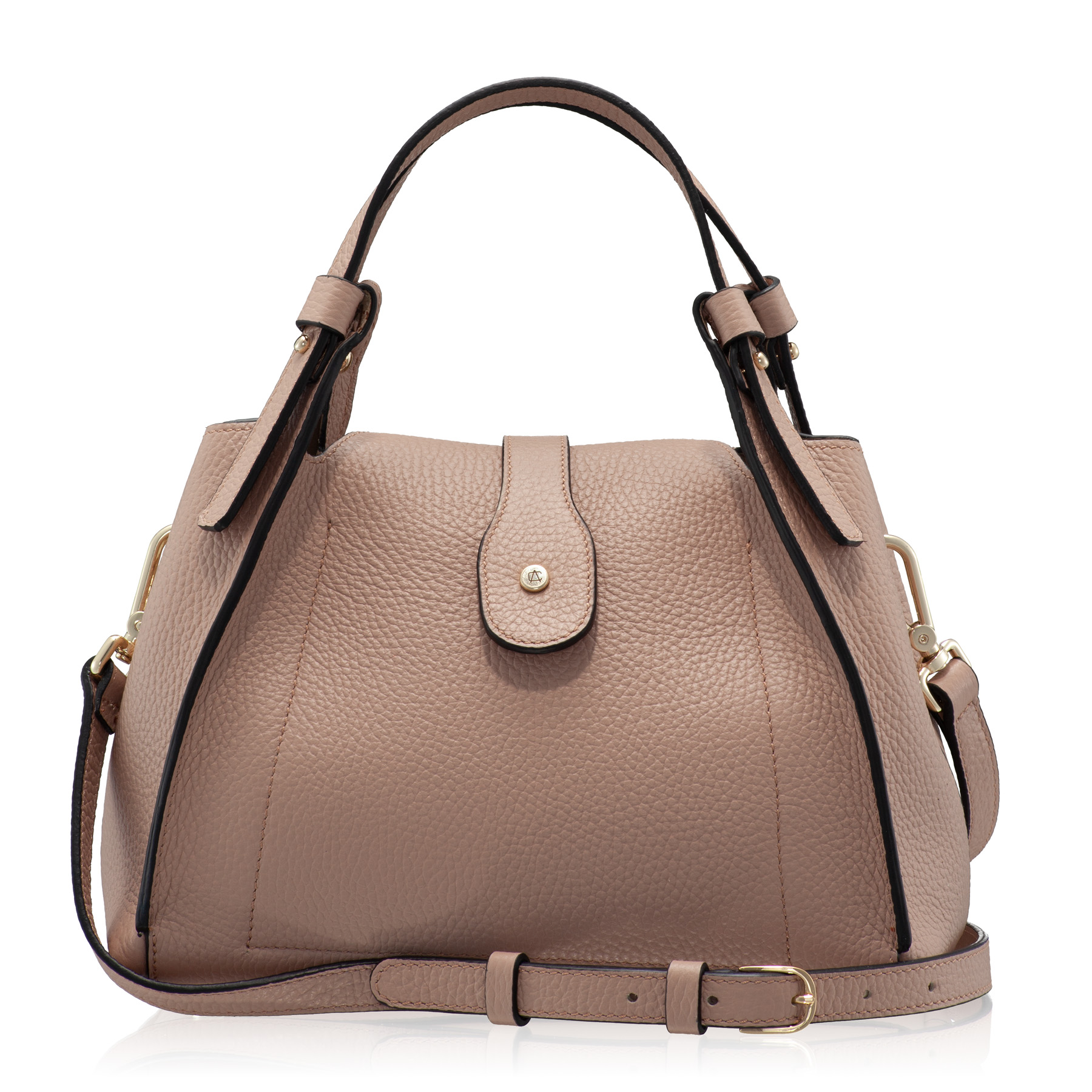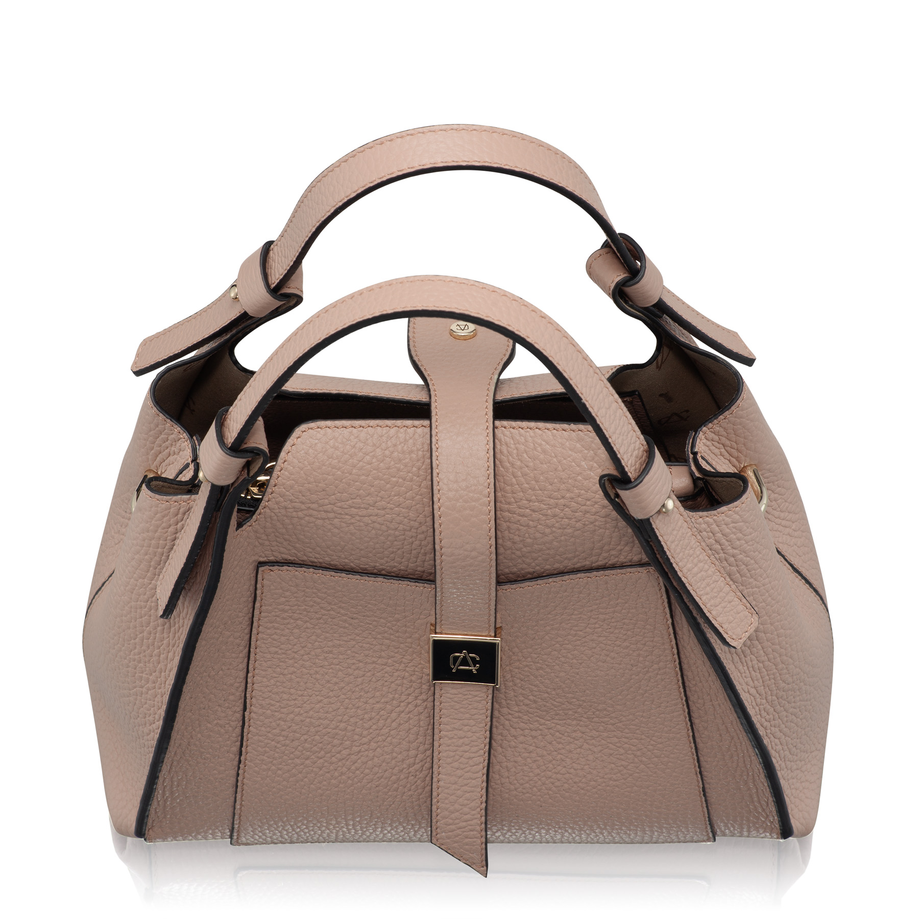 Crafted from high-quality genuine leather, this handbag stands out with its durable bottalato texture and sophisticated design. It features two interior compartments, an interior zip pocket, and a front exterior pocket.