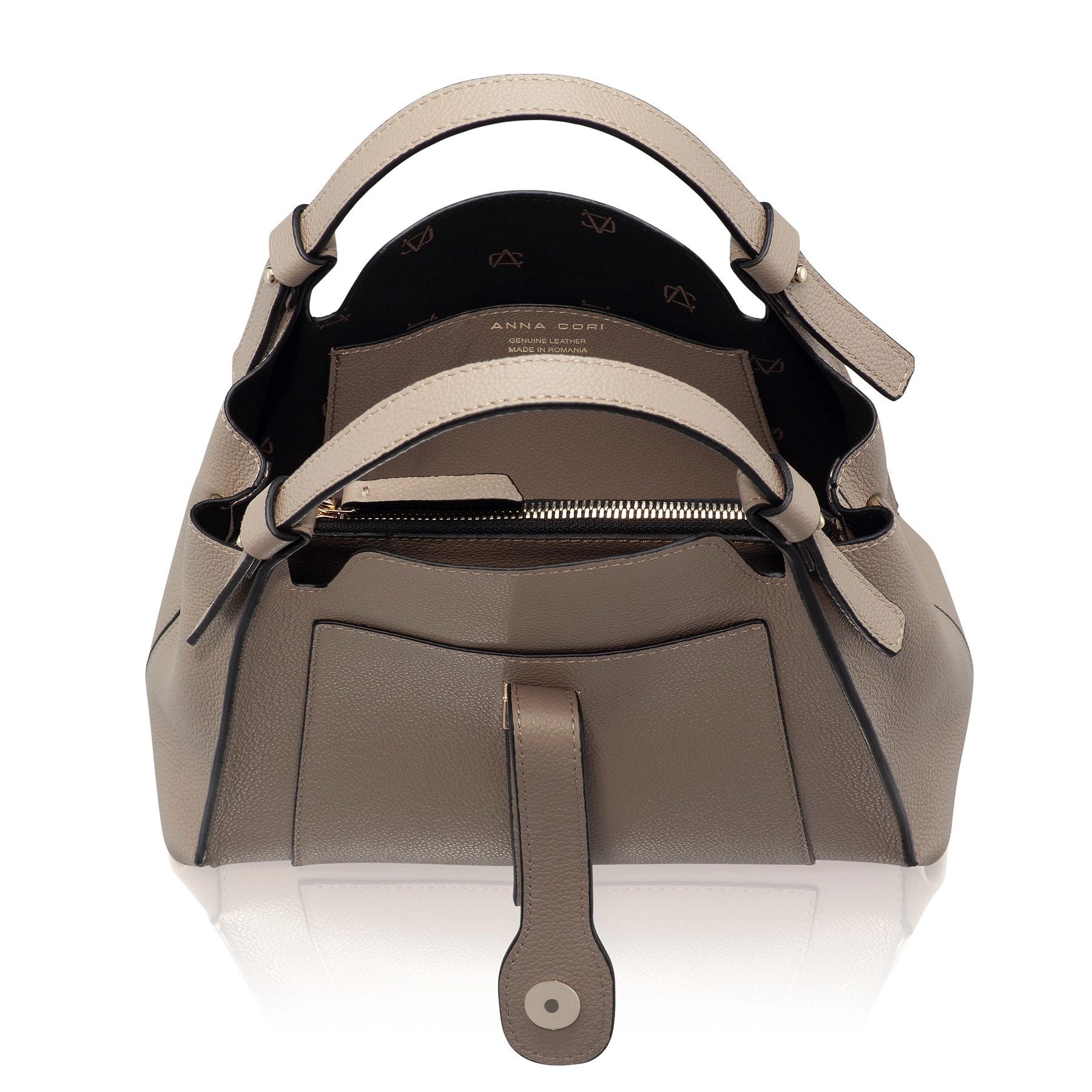 The bag is accessorized with the Anna Cori monogram, and the shoulder strap is both adjustable and detachable.