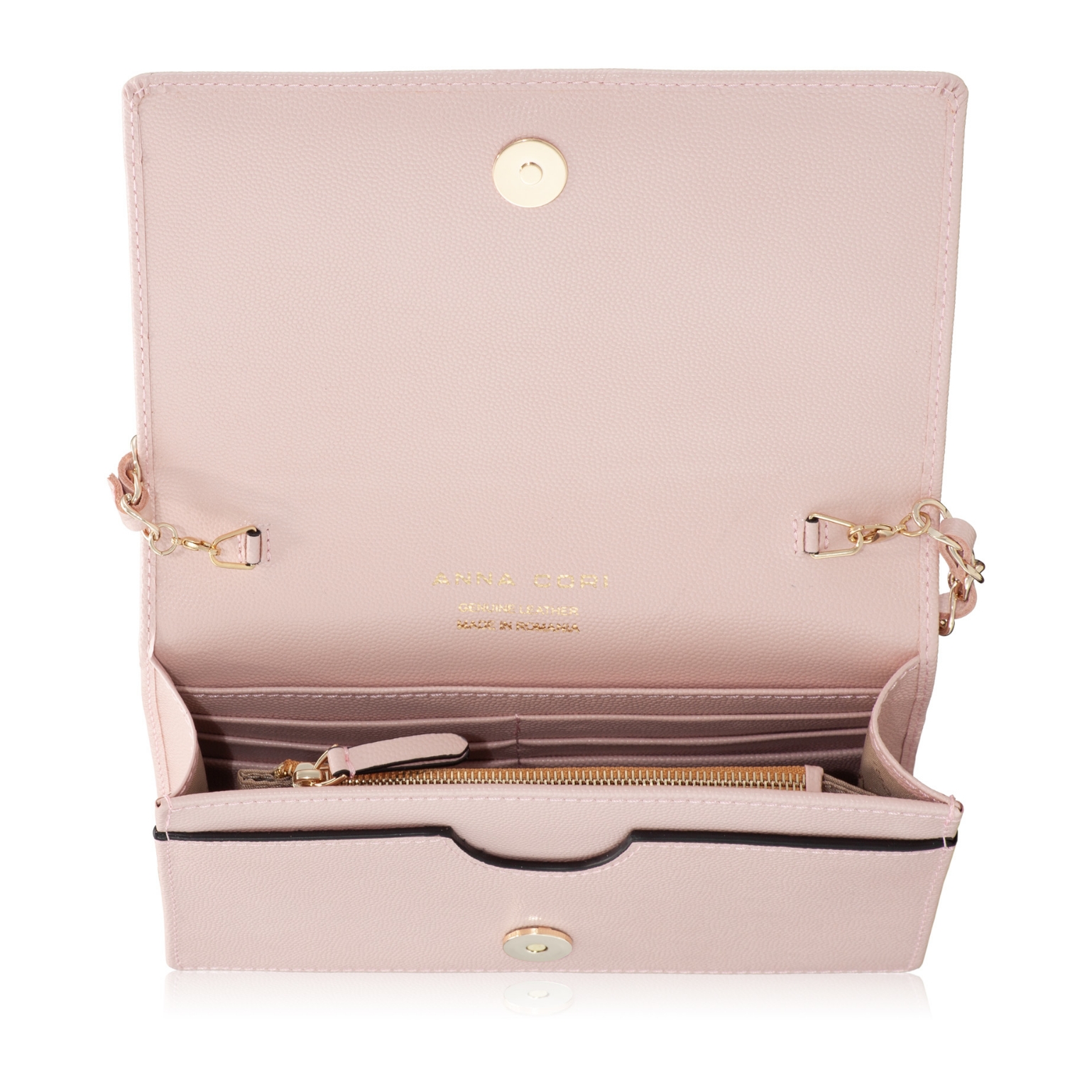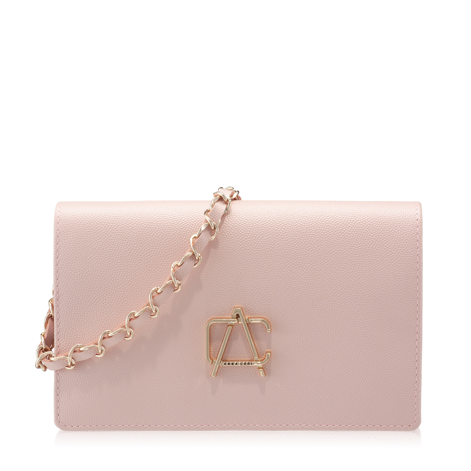 The ARNA envelope bag is an Icon Anna Cori model thanks to the elegance it shows and the diversity of shades in which it is found. It is complexly compartmentalized with two compartments, a central zippered pocket and 6 card holders. The Anna Cori monogram in gold metal manages to add an extra touch of elegance.