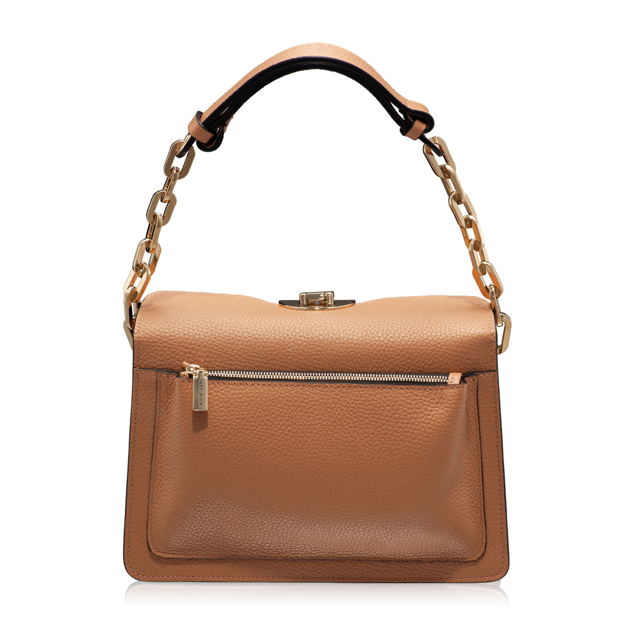 With its sophisticated shape, the Felicia bag reinterprets the contemporary design with the classic one. A compact bag, but at the same time large enough, which emphasizes elegance. The special detail of this model is expressed by the closure with metal accessory above the bag. The leather handle is easily adjustable and accessorized with metal chain: