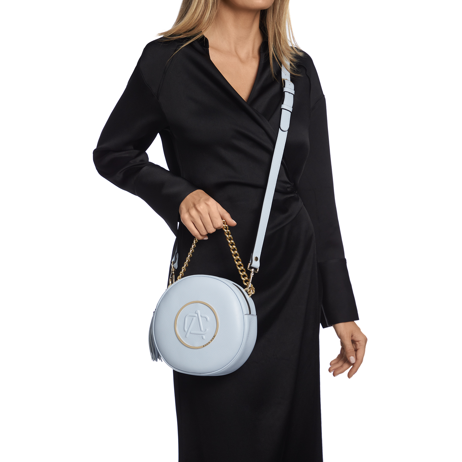 The #TAMARA circle bag, in a timeless, round shape, is made of natural leather and is accessorized with special elements. The golden metallic circle around the Anna Cori monogram, highlights the geometric shape of this bag. The bag features a gold metallic hand chain, a detachable and adjustable crossbody strap, and a genuine leather tassel on the zipper.
