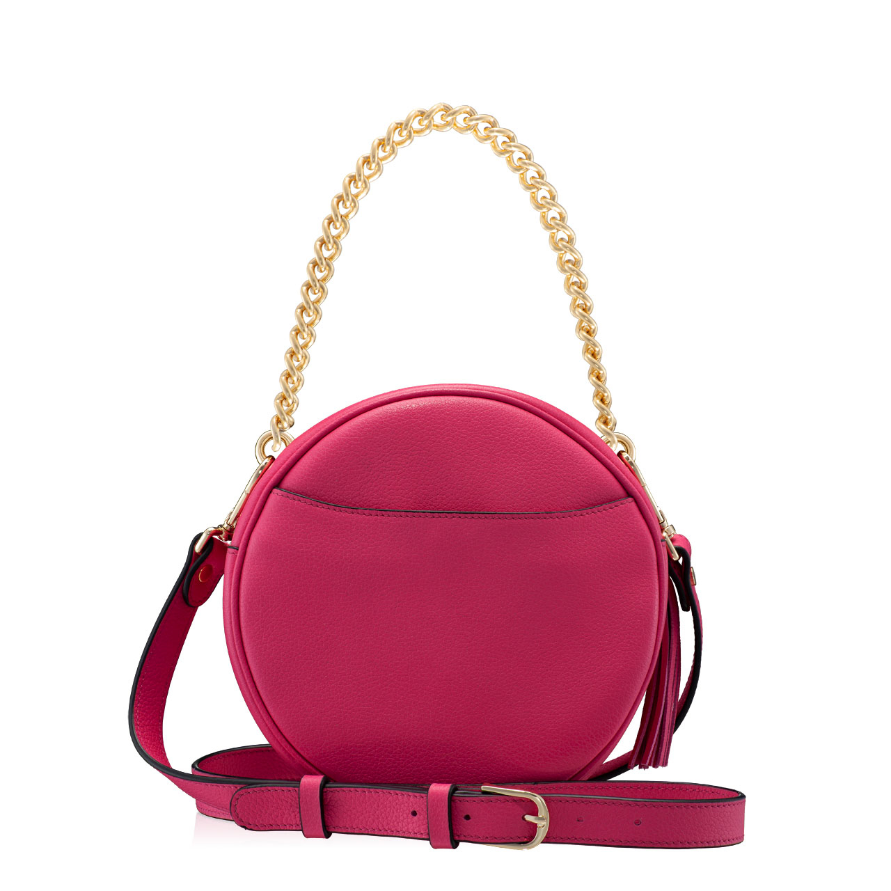 The #TAMARA circle bag, in a timeless, round shape, is made of natural leather and is accessorized with special elements. The golden metallic circle around the Anna Cori monogram, highlights the geometric shape of this bag. The bag features a gold metallic hand chain, a detachable and adjustable crossbody strap, and a genuine leather tassel on the zipper.