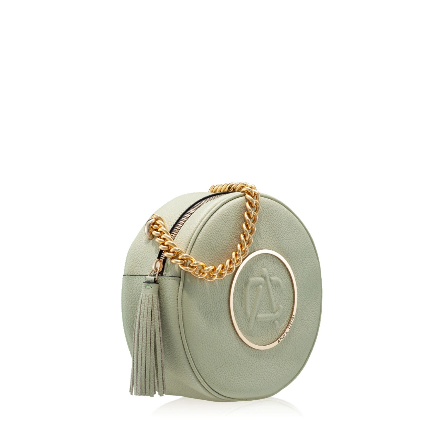 The #TAMARA circle bag, in a timeless, round shape, is made of natural leather and is accessorized with special elements. The golden metallic circle around the Anna Cori monogram, highlights the geometric shape of this bag. The bag features a gold metallic hand chain, a detachable and adjustable crossbody strap, and a genuine leather tassel on the zipper.