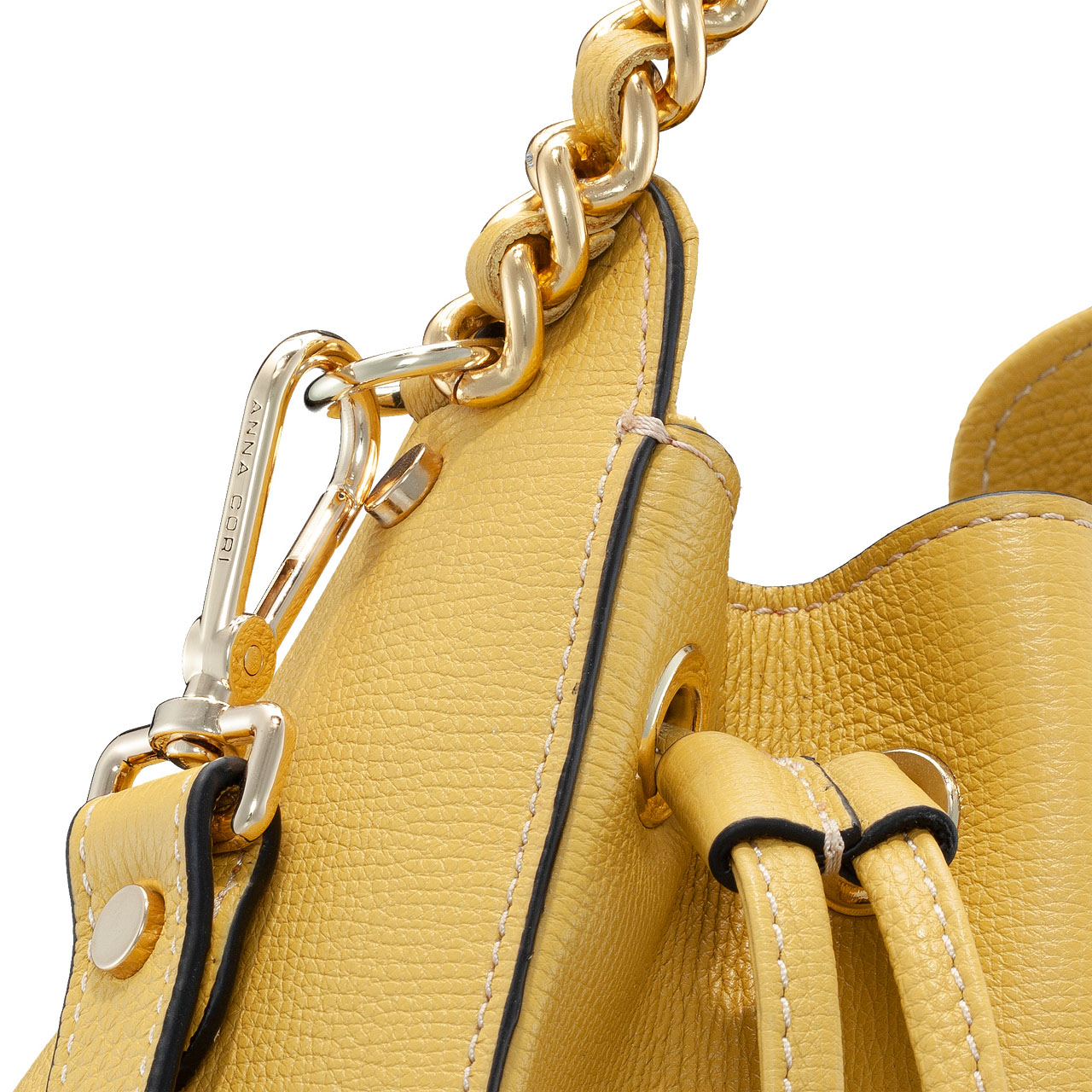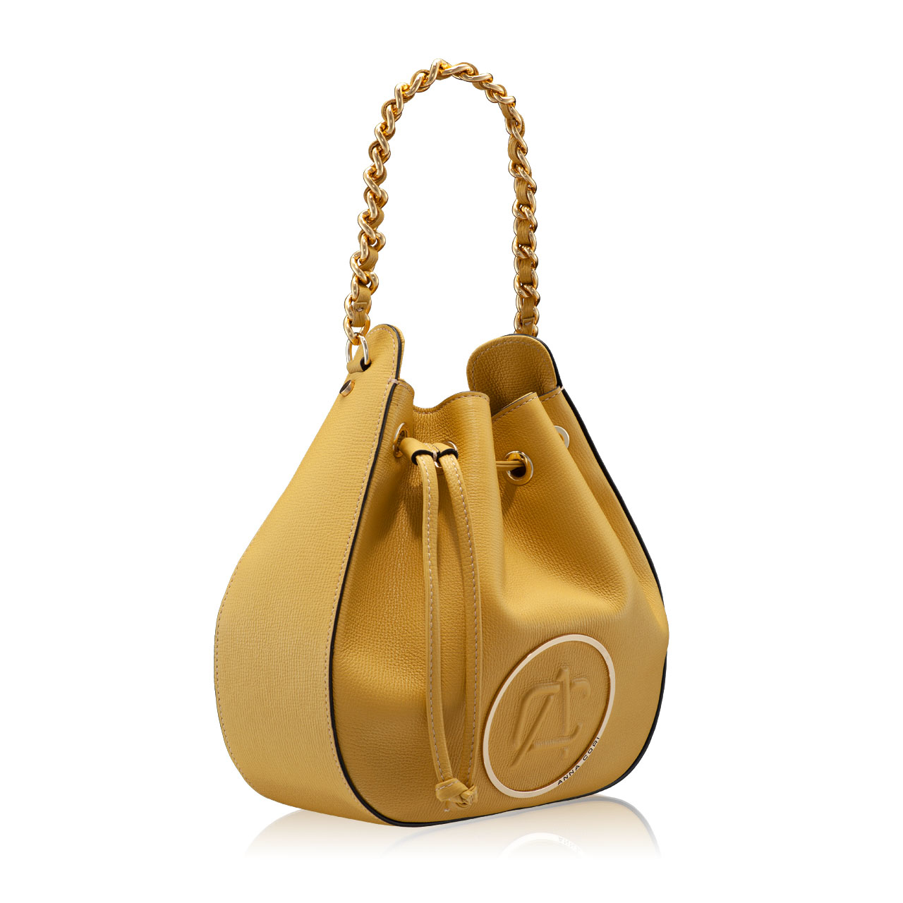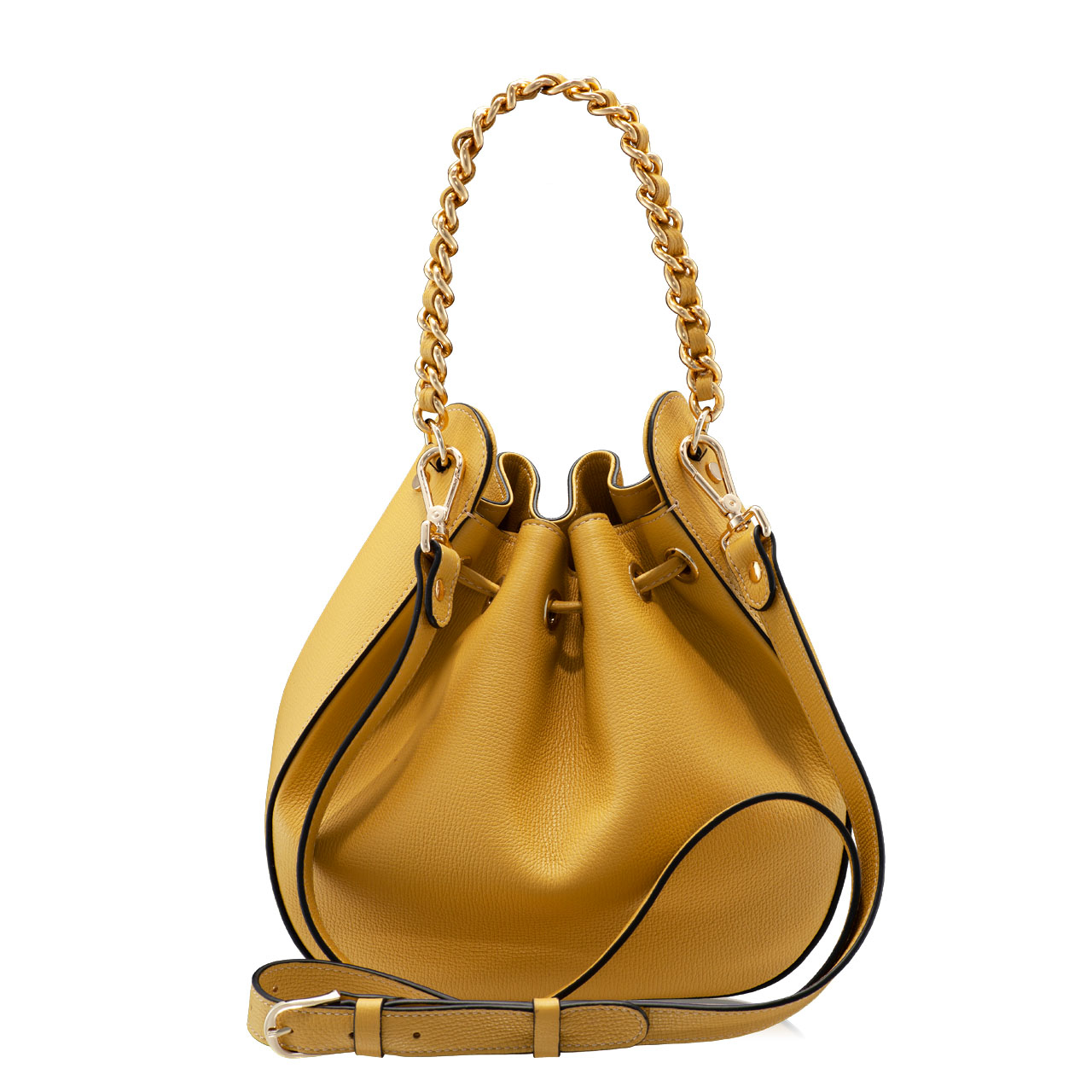 Crafted from soft calf leather, the #THEA bucket bag has a distinctive shape defined by a drawstring closure and gold accessories. It can be carried in the hand through the handle made of metal chain and genuine leather, or it can be worn crossbody through the adjustable and removable leather strap.