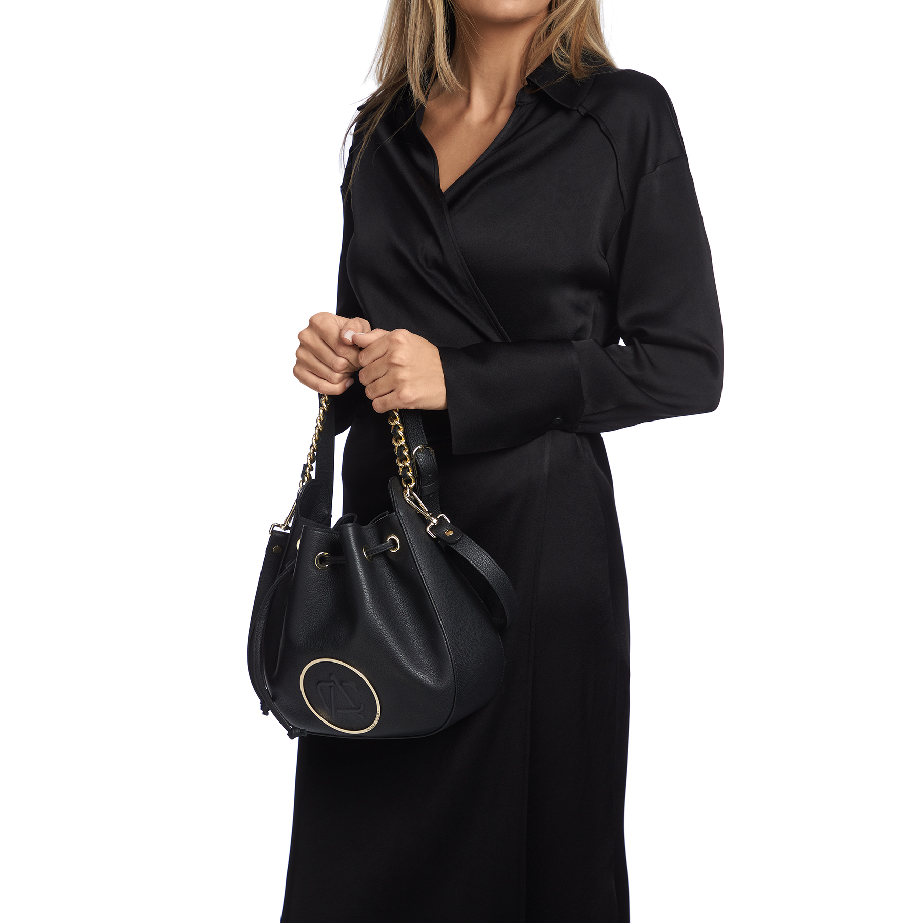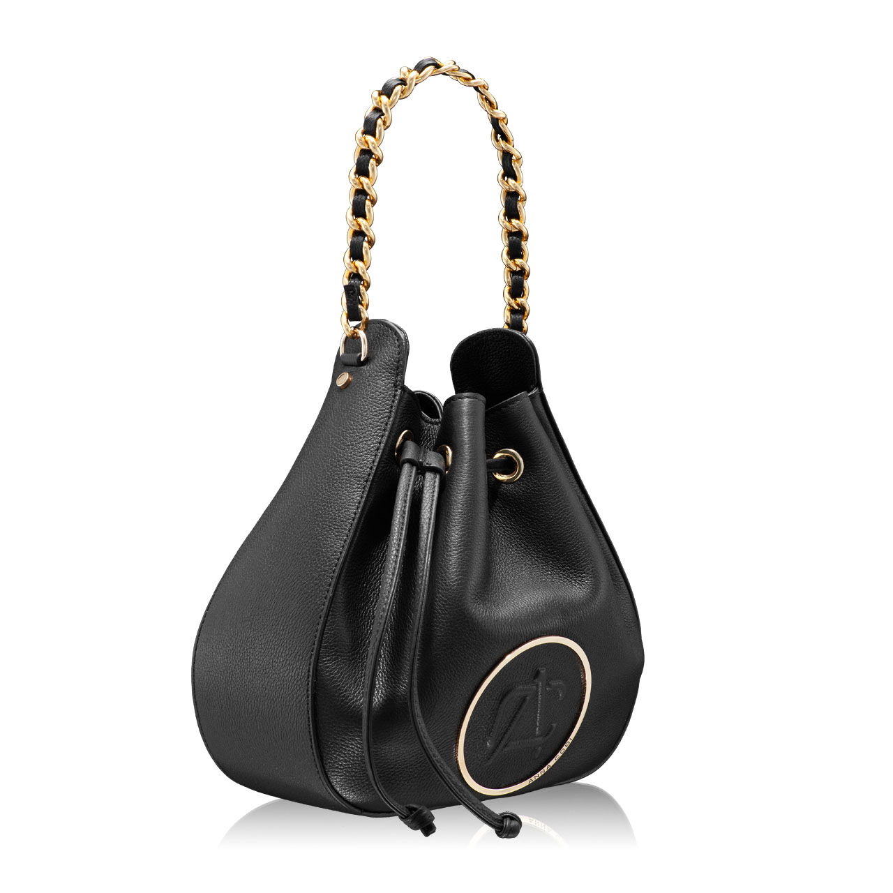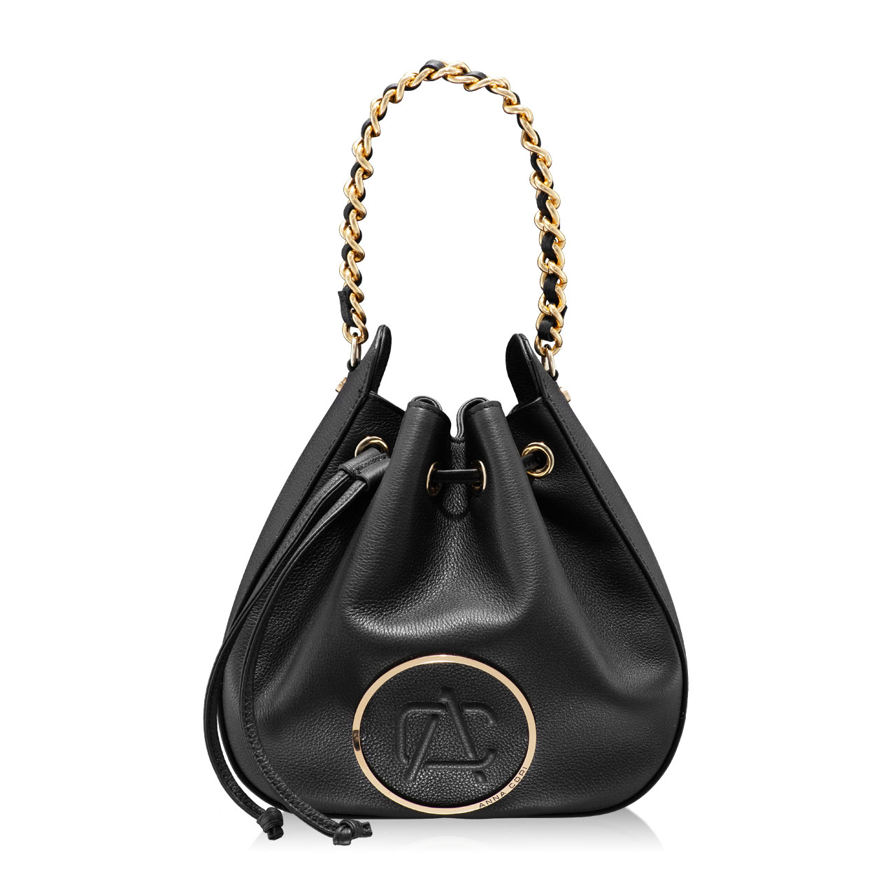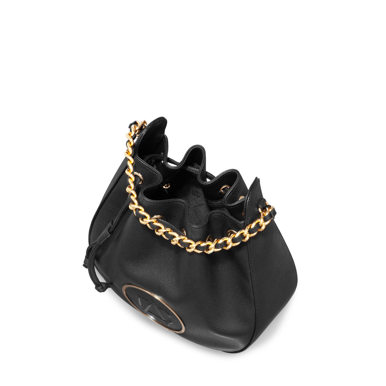 Crafted from soft calf leather, the #THEA bucket bag has a distinctive shape defined by a drawstring closure and gold accessories. It can be carried in the hand through the handle made of metal chain and genuine leather, or it can be worn crossbody through the adjustable and removable leather strap.
