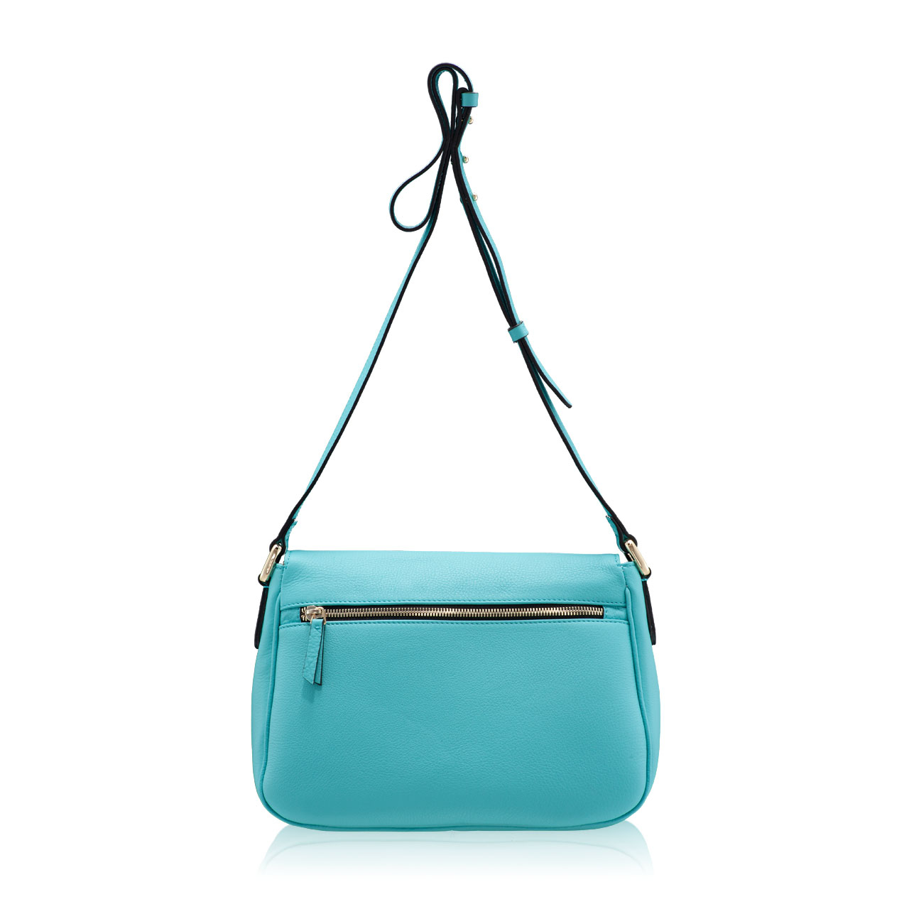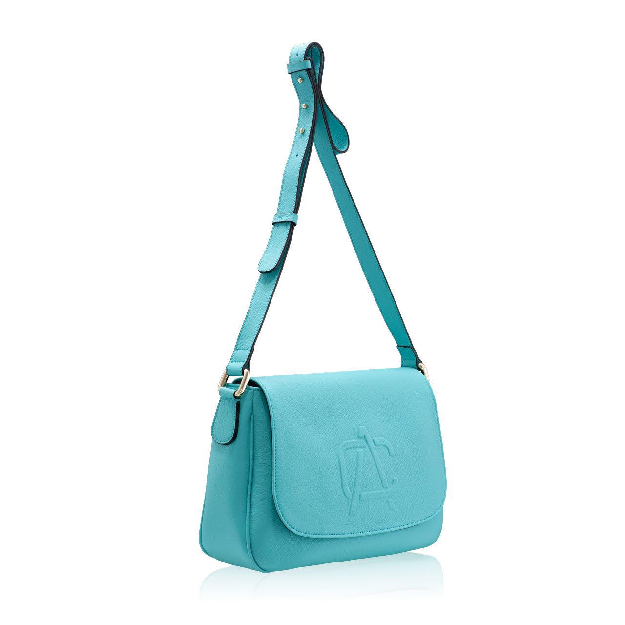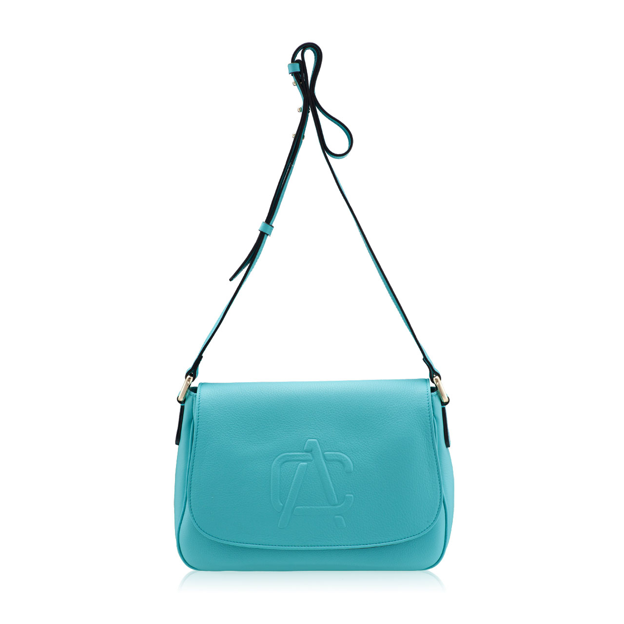 -natural leather-fabric lining-2 compartments-one interior zipper pocket-one exterior zipper pocket-adjustable shoulder strap-magnetic snap closure-embossed Anna Cori monogram