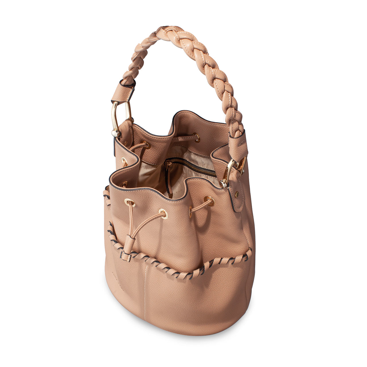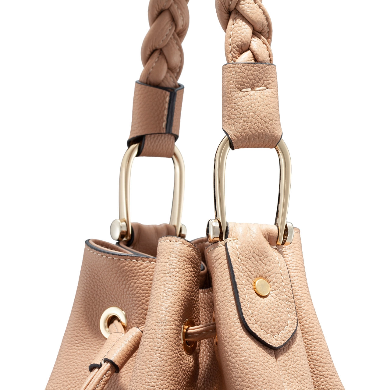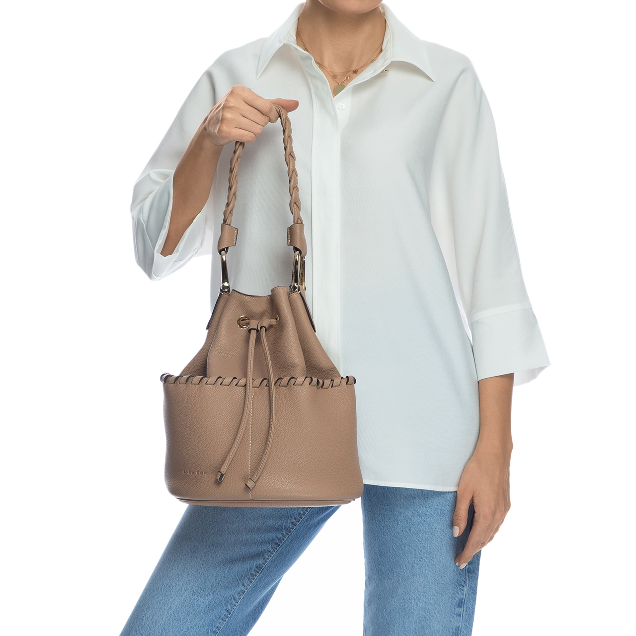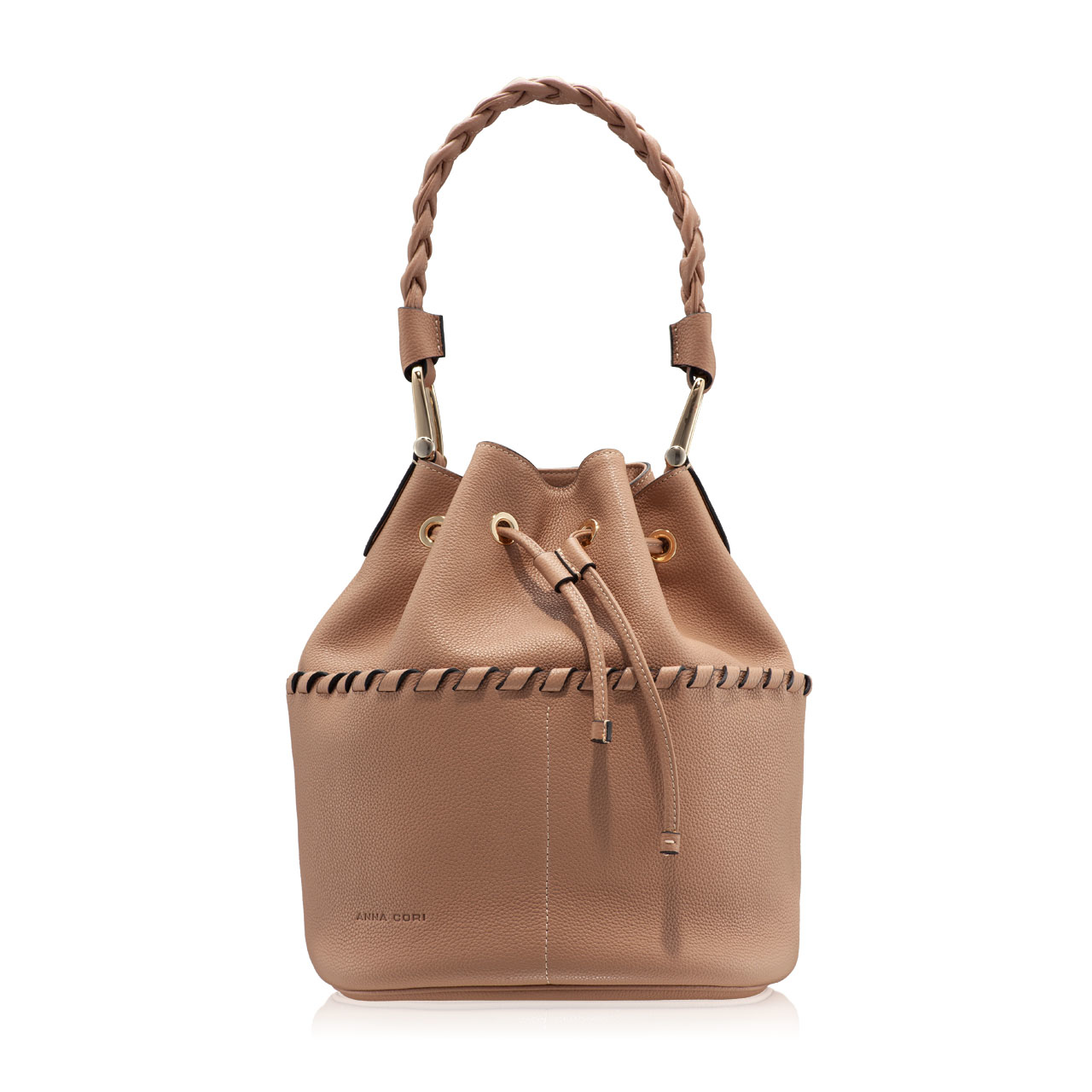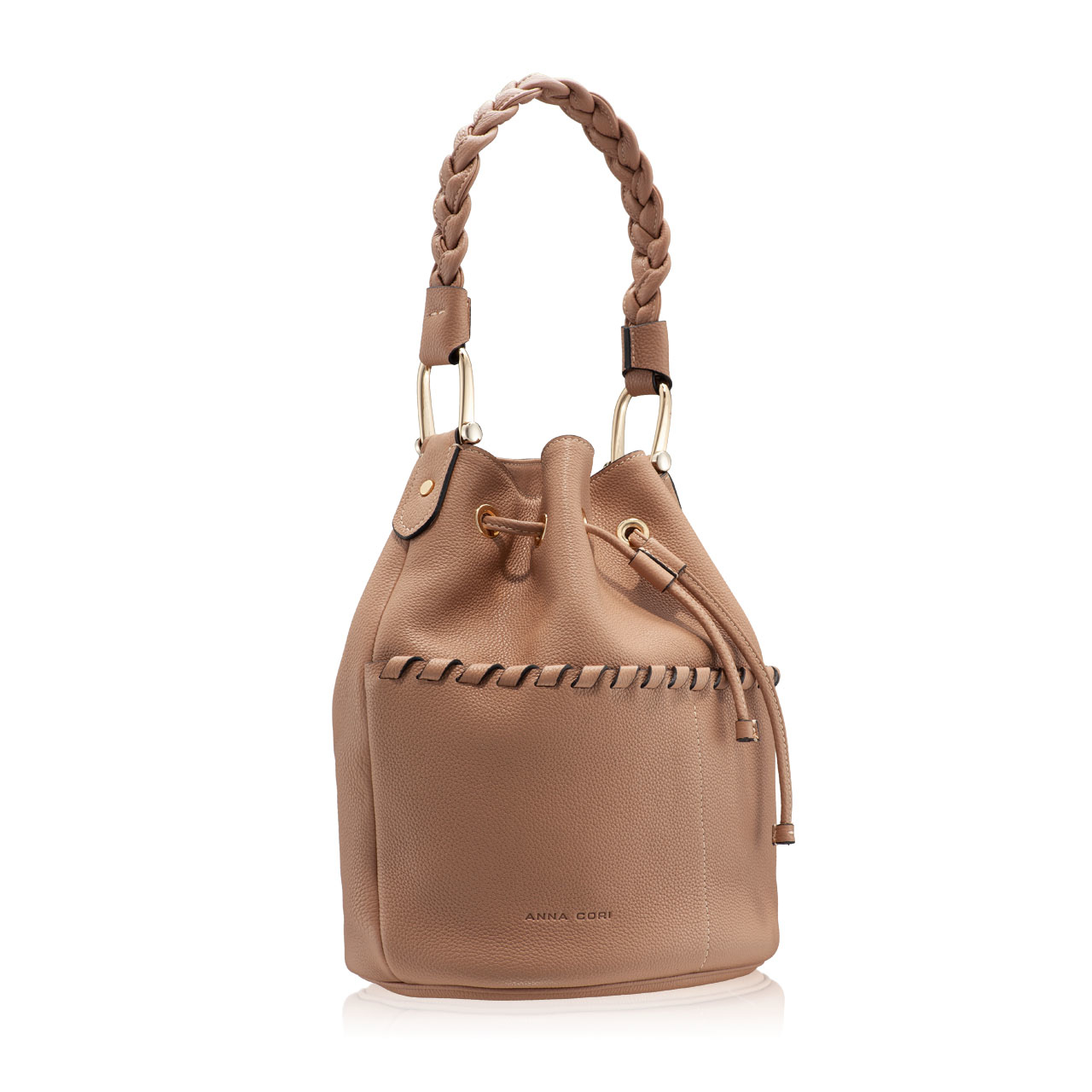 -natural leather-one large compartment-one interior zipper pocket-two exterior pocket-leather cord-engraved ANNA CORI logo-personalised metal accessory-gold color accessory-detachable and adjustable sholder strap