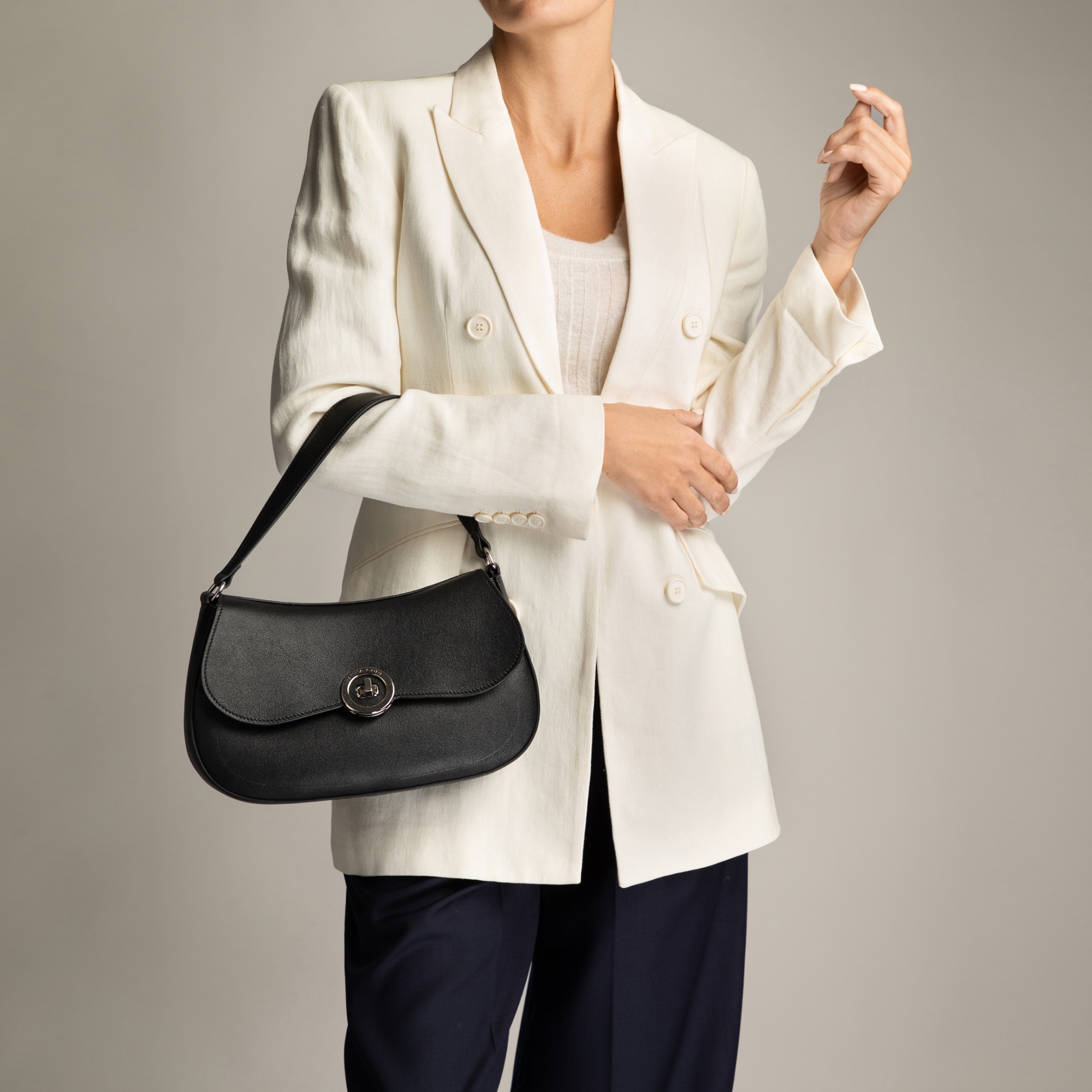 Crafted from high-quality bottalato leather, this handbag features a refined design enhanced by a custom Anna Cori accessory.
