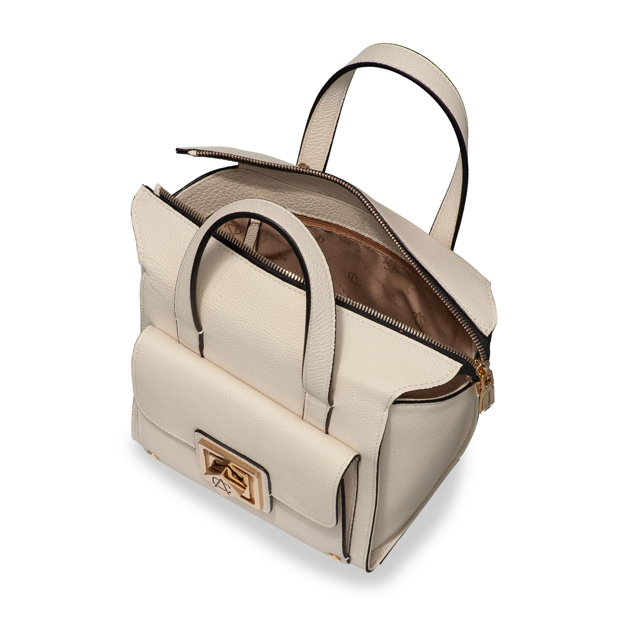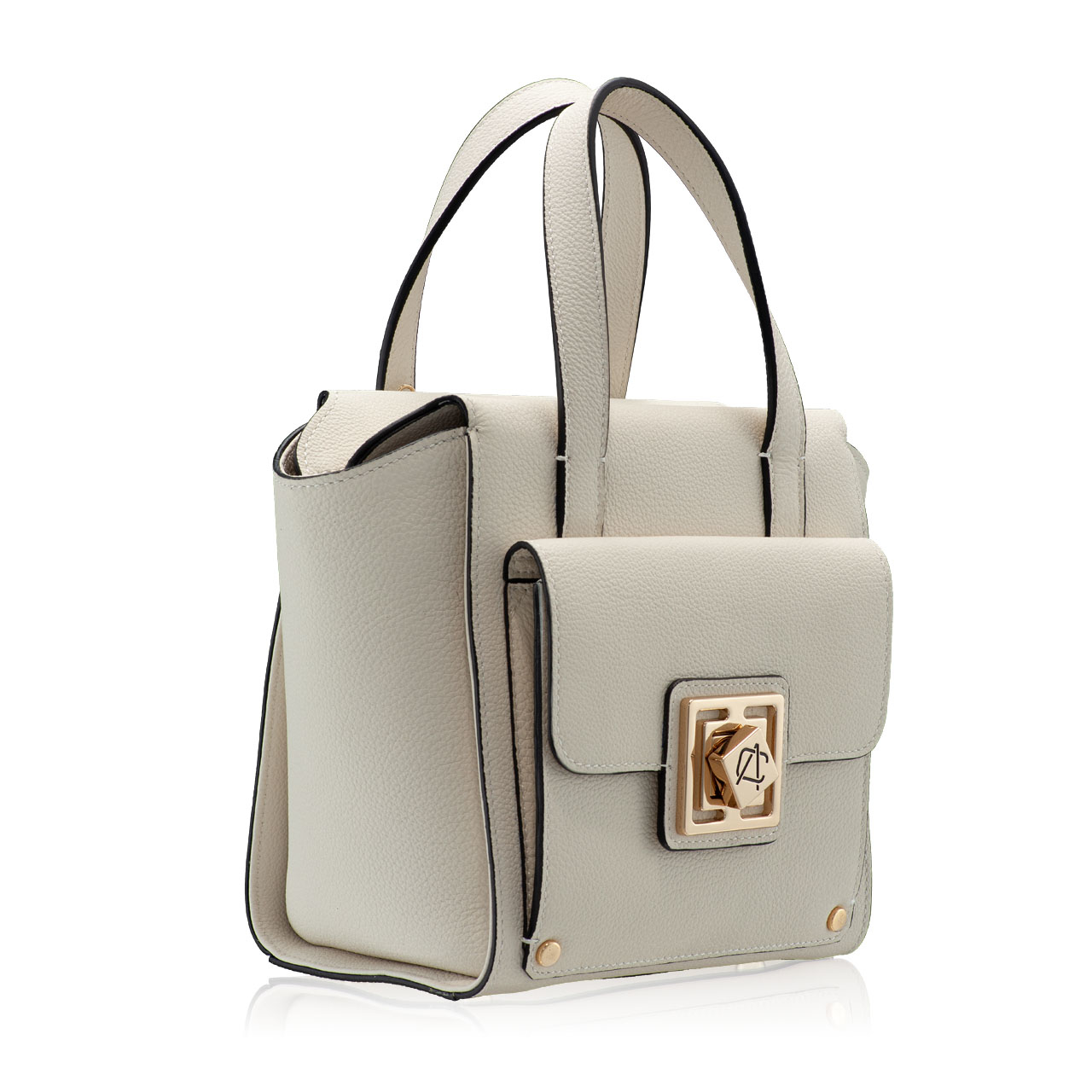 #KRISTY is a bag that takes you out of anonymity thanks to its special shape, suitable both for the office and for free time. Compact and modern, the bag features a front pocket that closes with our new custom Anna Cori monogram closure system. The main compartment is closed with a zipper, and the bag is equipped with a handle, but also with a removable and adjustable shoulder strap.