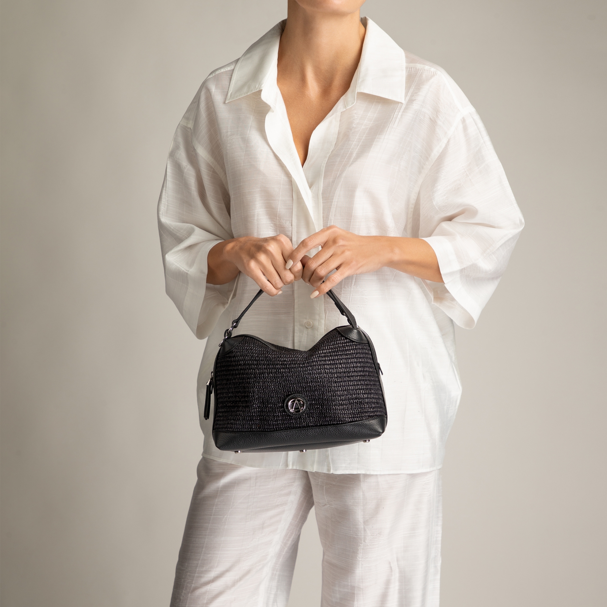 Its compact yet spacious shape makes it the perfect companion for busy city days, weekend getaways, or summer outings with friends. The secure closure system, delicate metallic details, and premium finish reflect the unmistakable Anna Cori quality and timeless style. Ideal for chic summer looks, smart-casual outfits, or relaxed office wear.