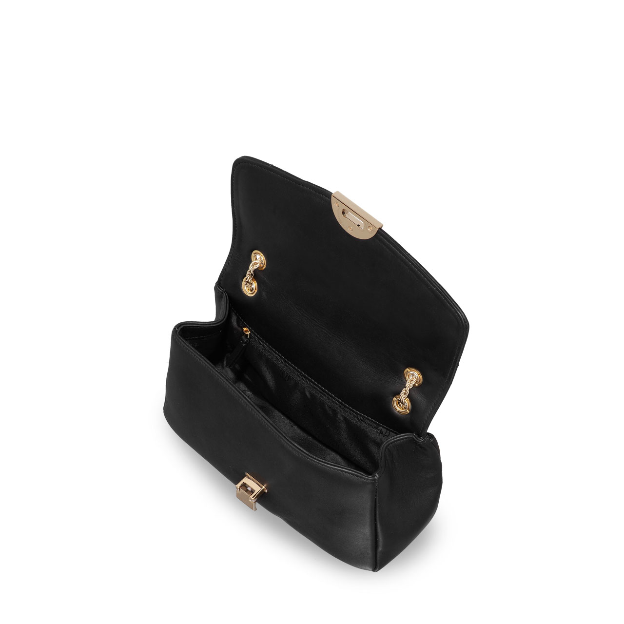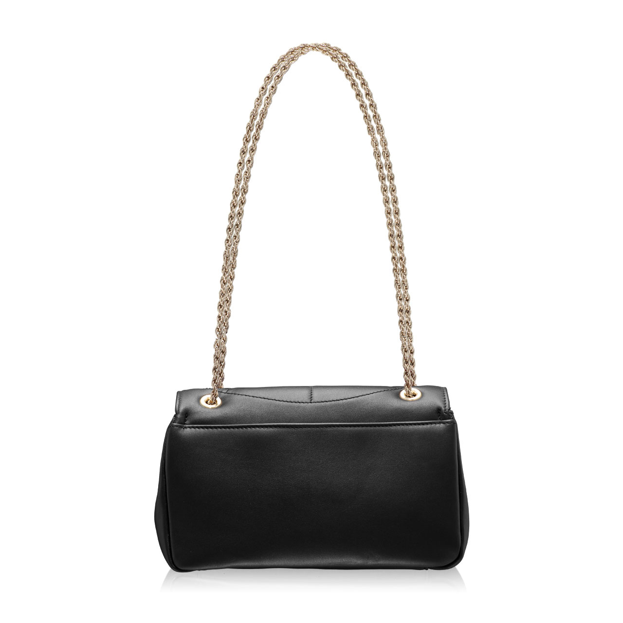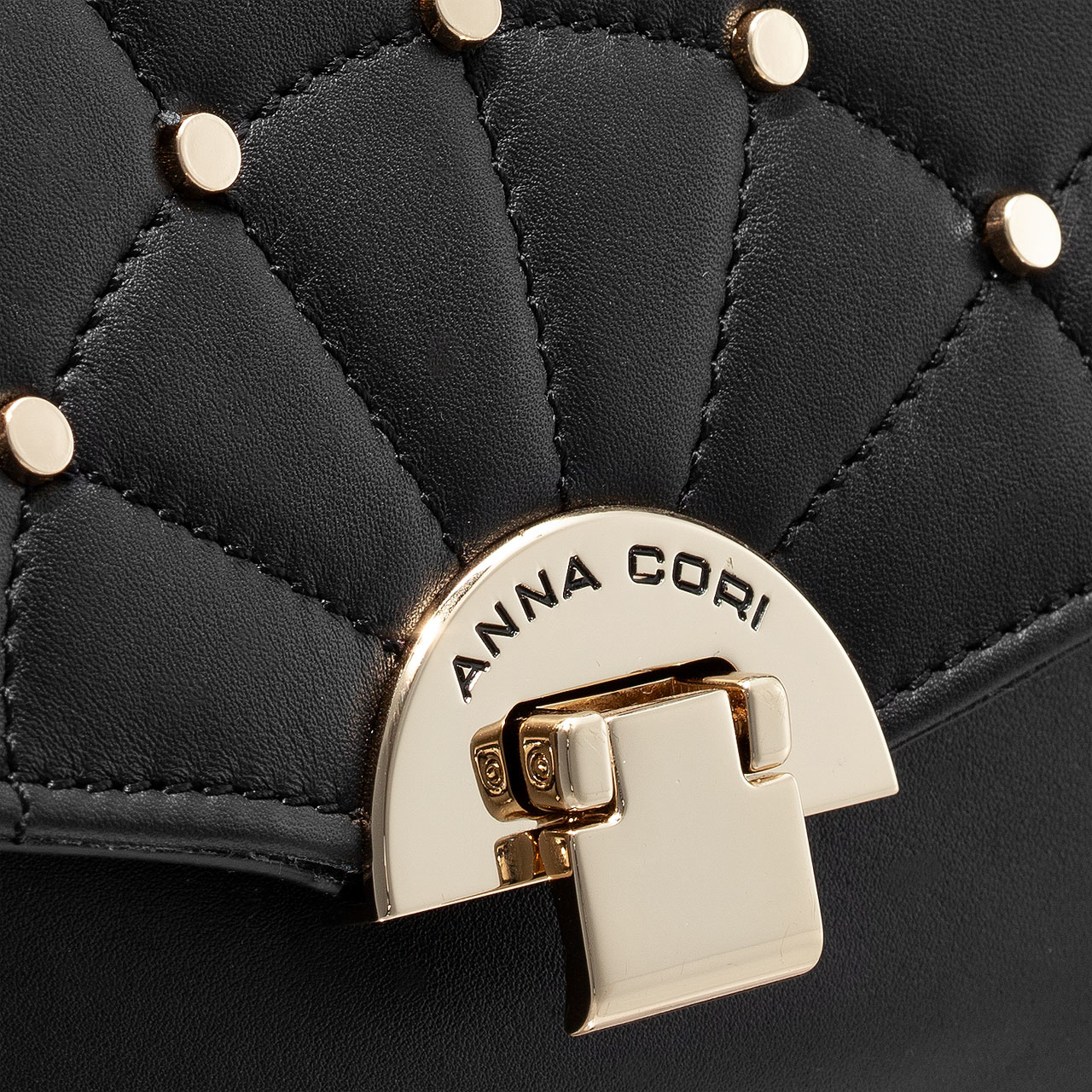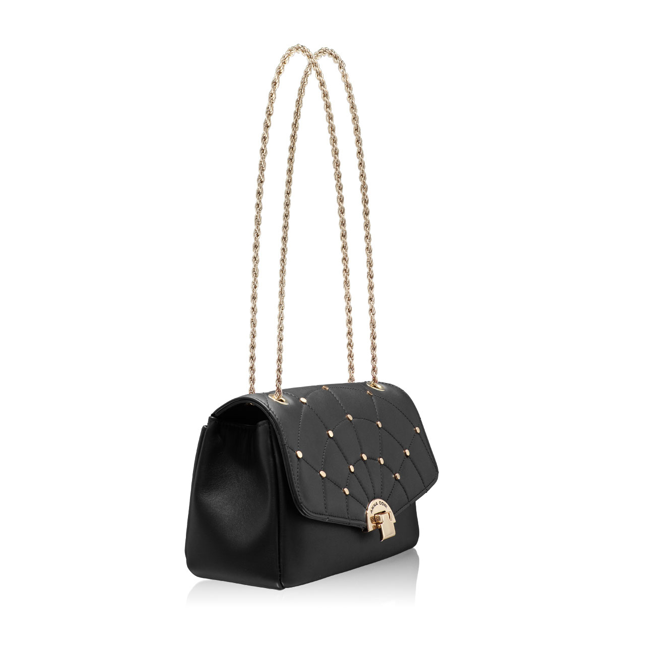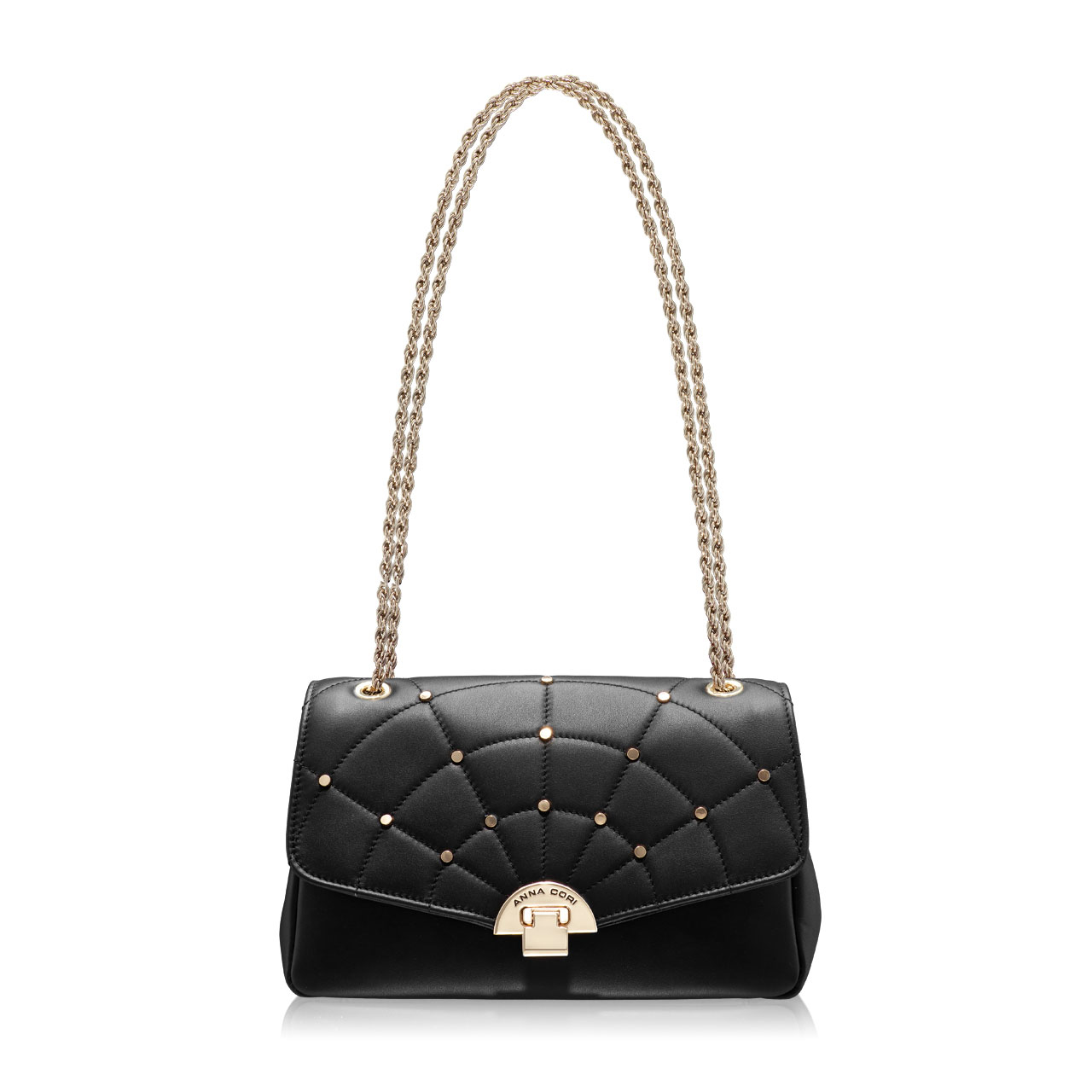 This bag features a metal shoulder chain, is embellished with a unique gold staple pattern and closes with a gold buckle personalized with the Anna Cori logo. The Lesia bag is made of natural leather, in a modern shape, but very roomy and compartmentalized with three pockets.
