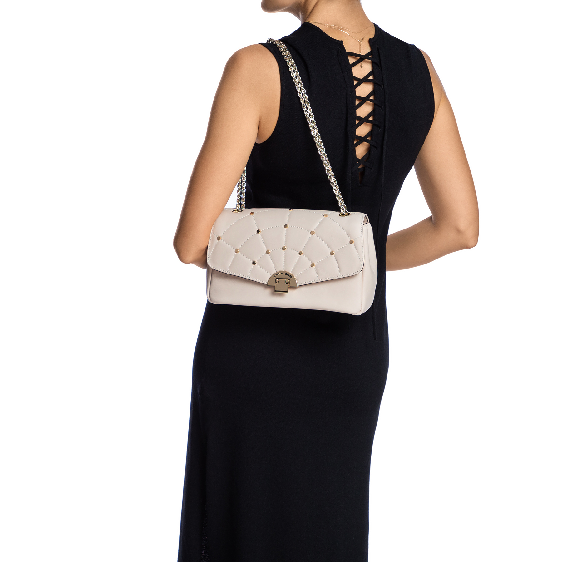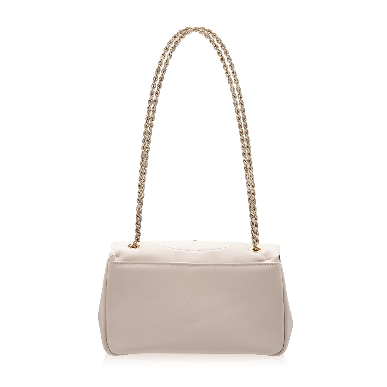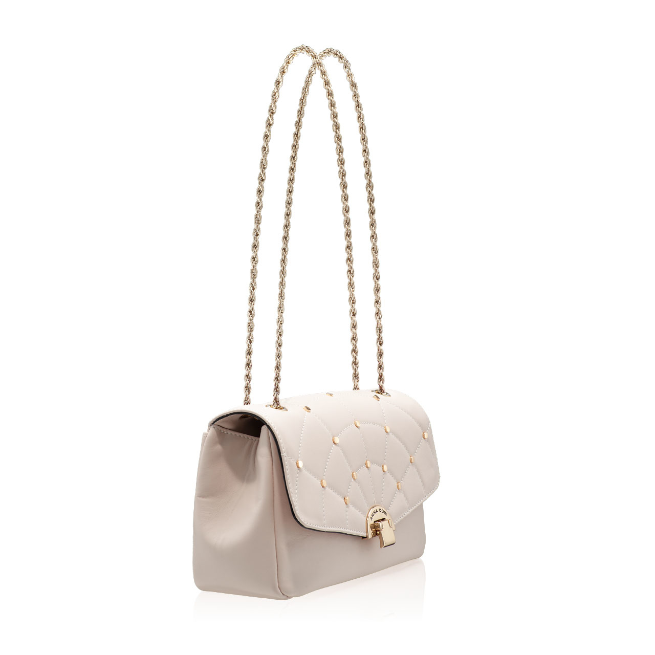 This bag features a metal shoulder chain, is embellished with a unique gold staple pattern and closes with a gold buckle personalized with the Anna Cori logo. The Lesia bag is made of natural leather, in a modern shape, but very roomy and compartmentalized with three pockets.