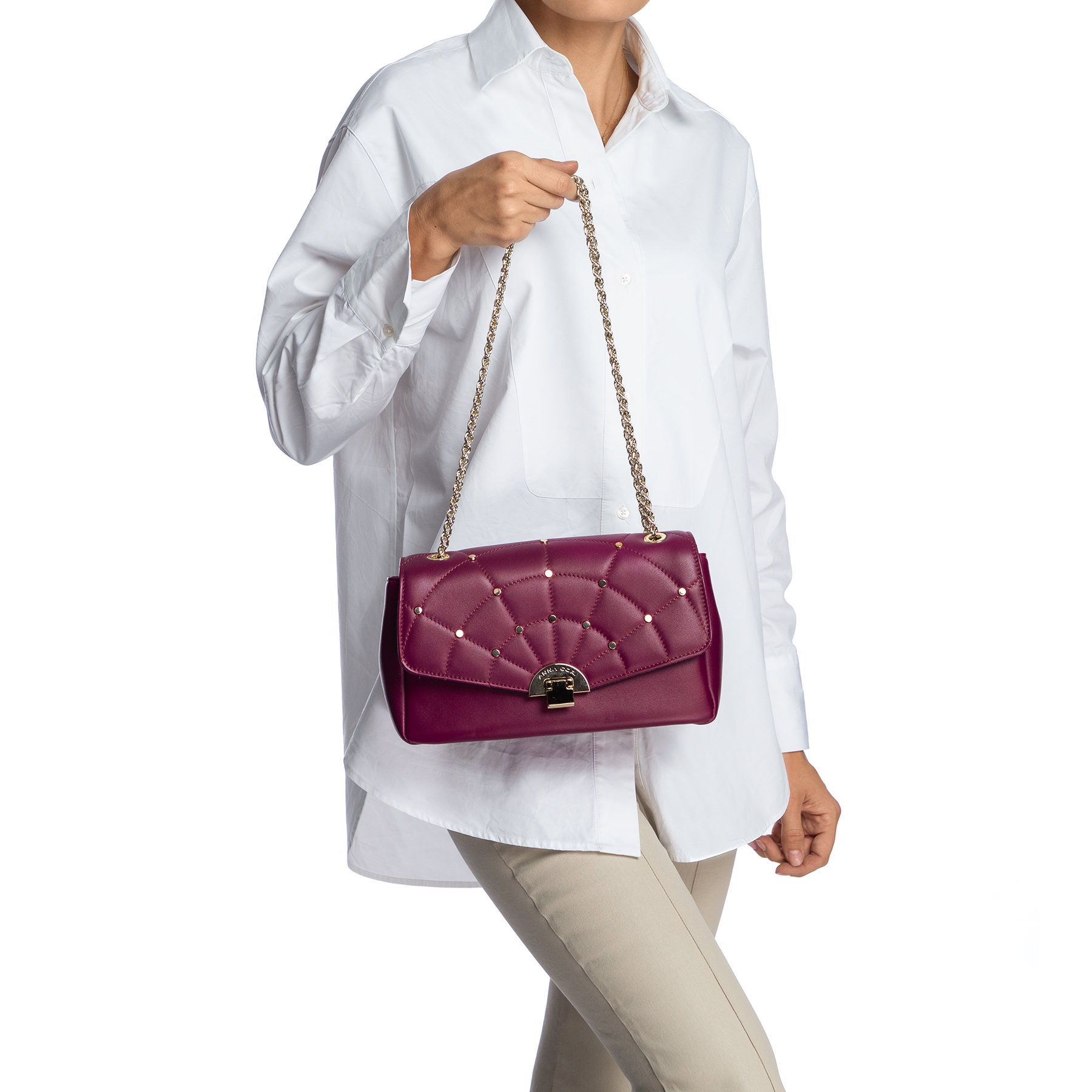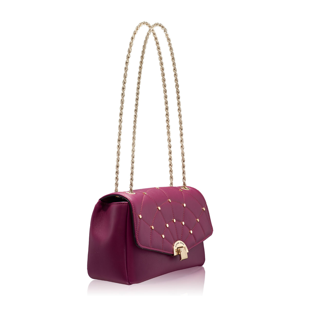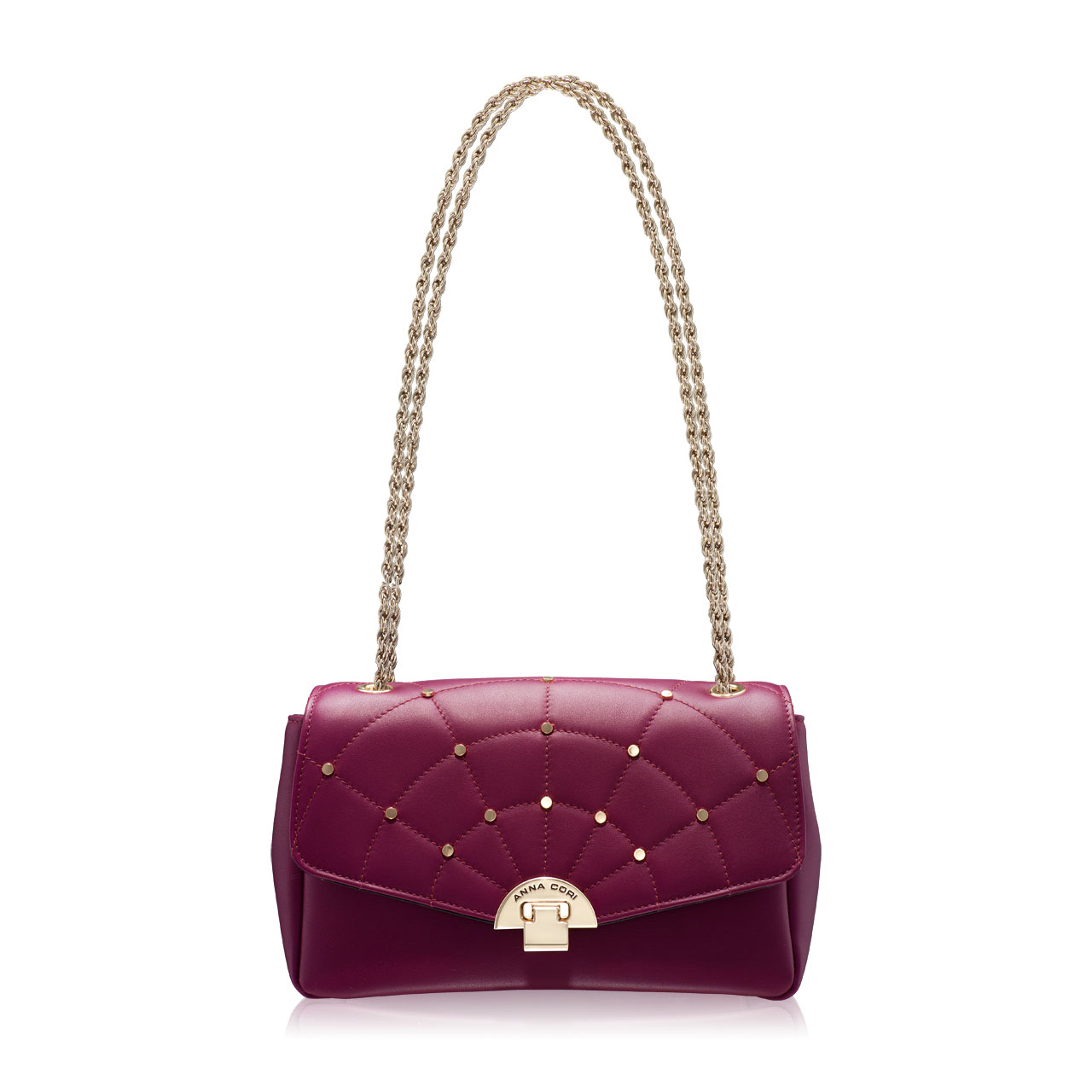 This bag features a metal shoulder chain, is embellished with a unique gold staple pattern and closes with a gold buckle personalized with the Anna Cori logo. The Lesia bag is made of natural leather, in a modern shape, but very roomy and compartmentalized with three pockets.