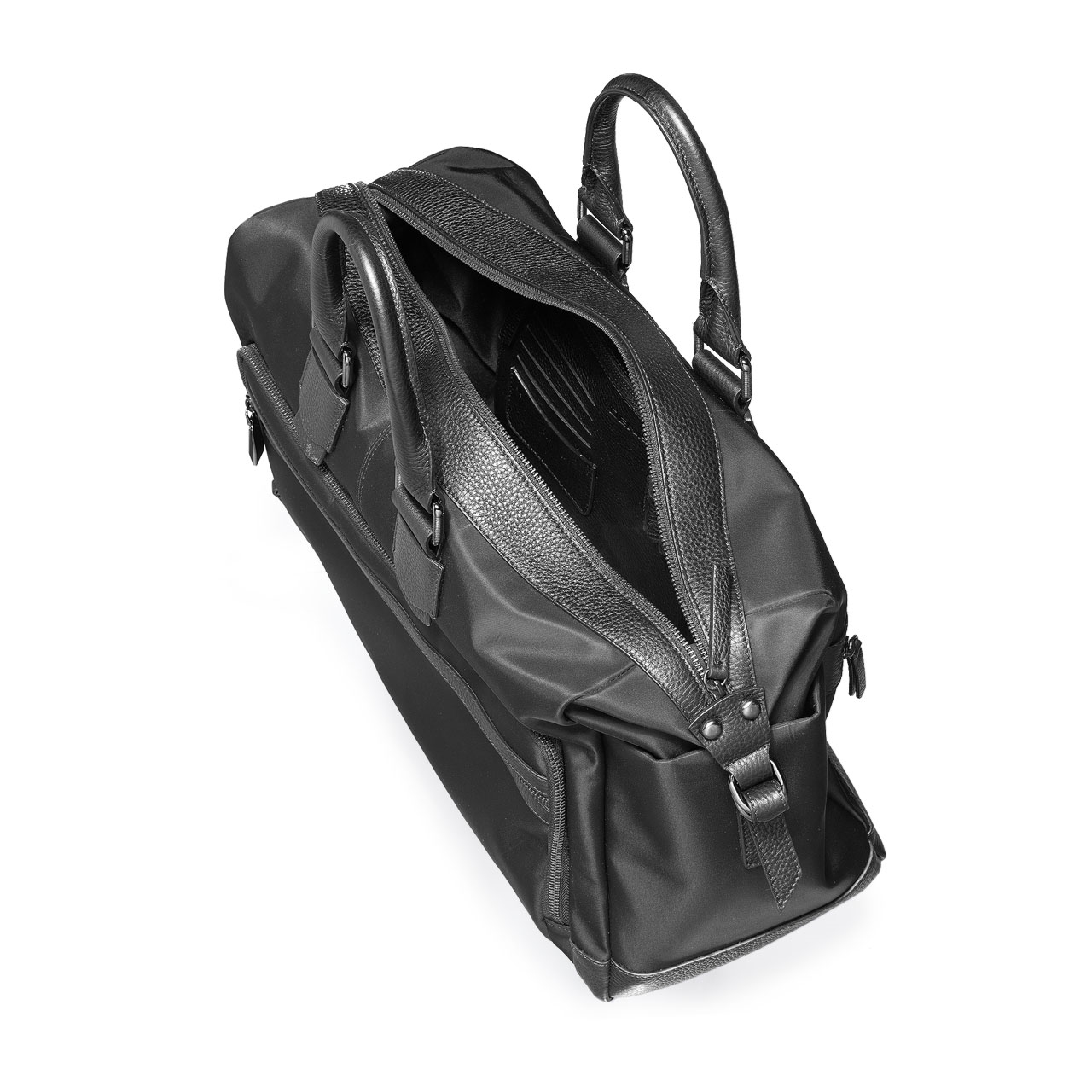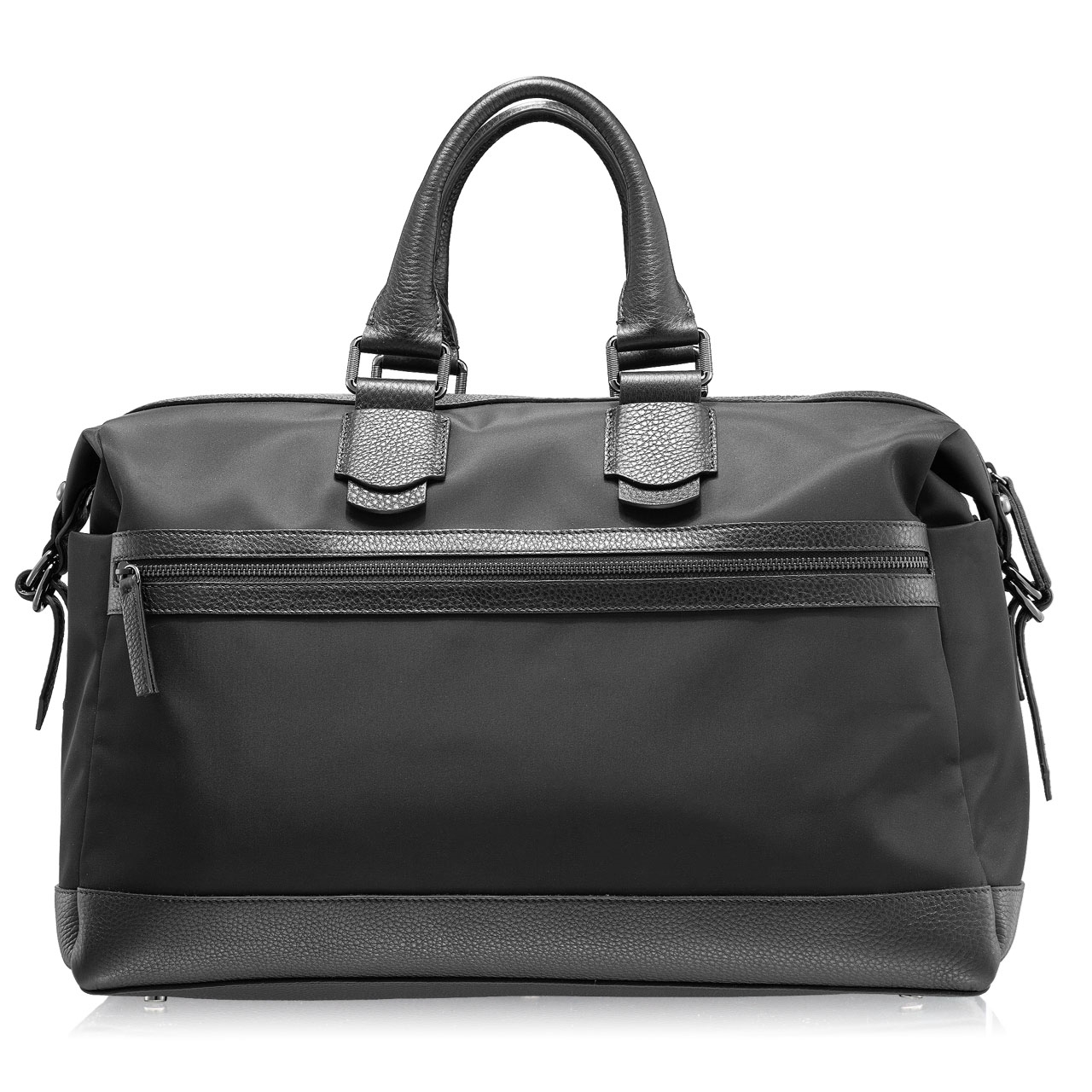 -natural leather-woven fabric-fabric lining-one interior compartment-two interior zipper pockets-one interior pocket-three exterior zipper pockets-two exterior pockets-zipper closure-detachable and adjustable shoulder strap-engraved DENIS logo