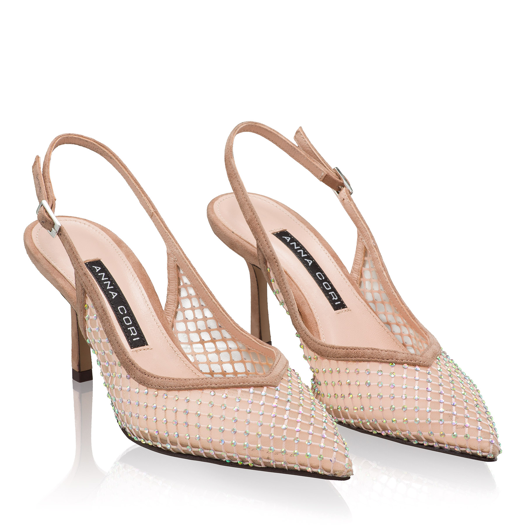 Elegant women's shoes, made of genuine suede leather and textile material, subtly decorated with shiny applications. Ideal for both special events and elegant daytime outfits.