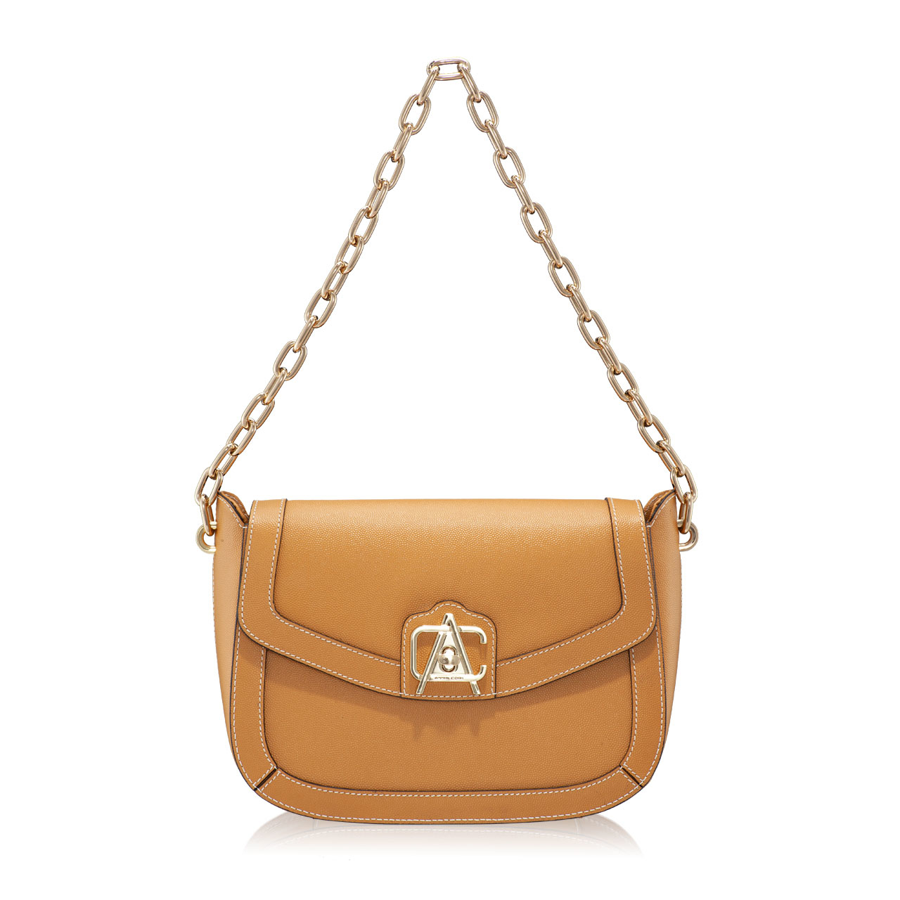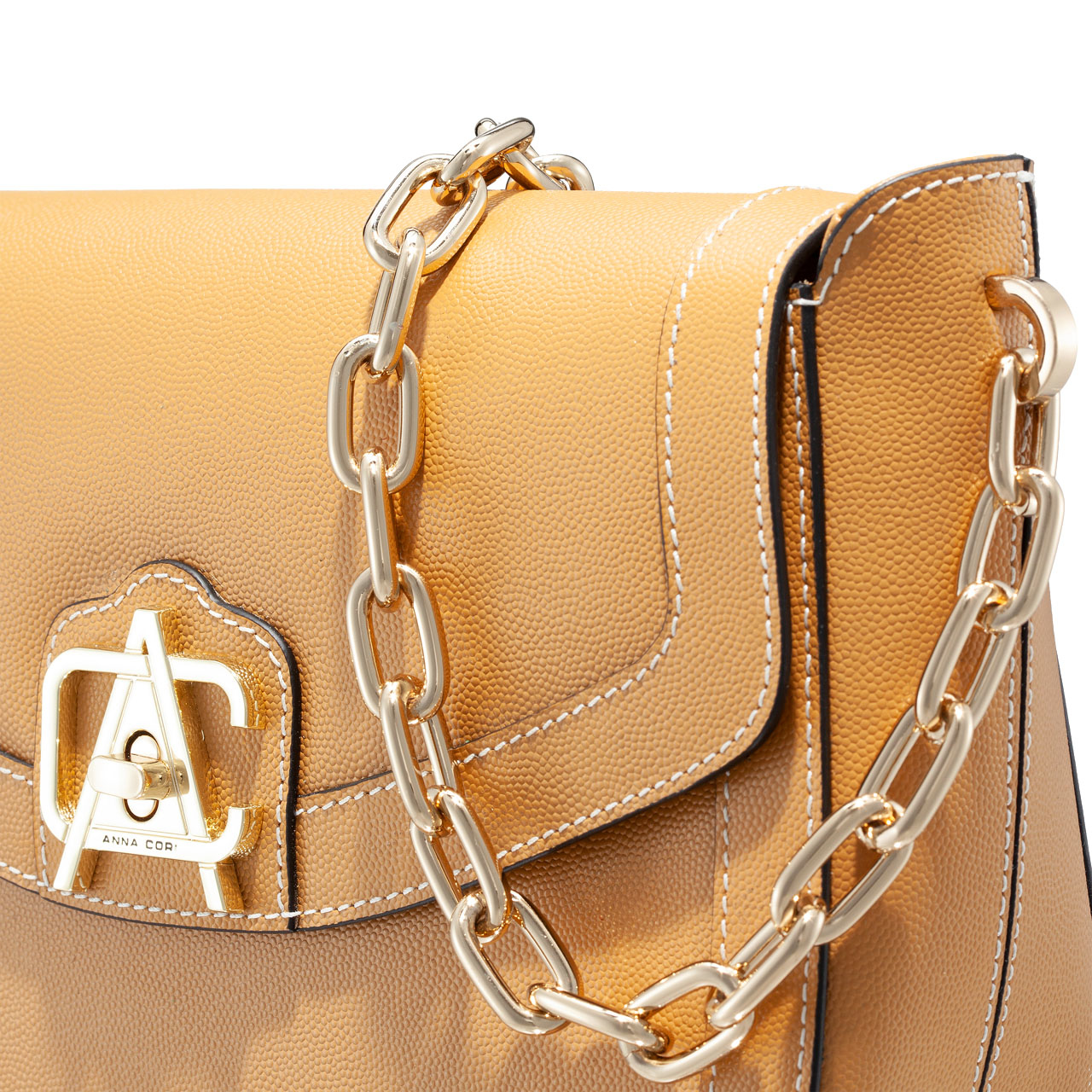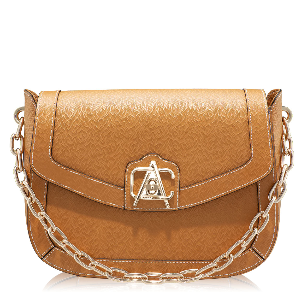 -natural stamped leather-one compartment-two interior pocket-personalised with ANNA CORI monogram-buckle closure-gold color accessory-adjustable and detachable shoulder strap
