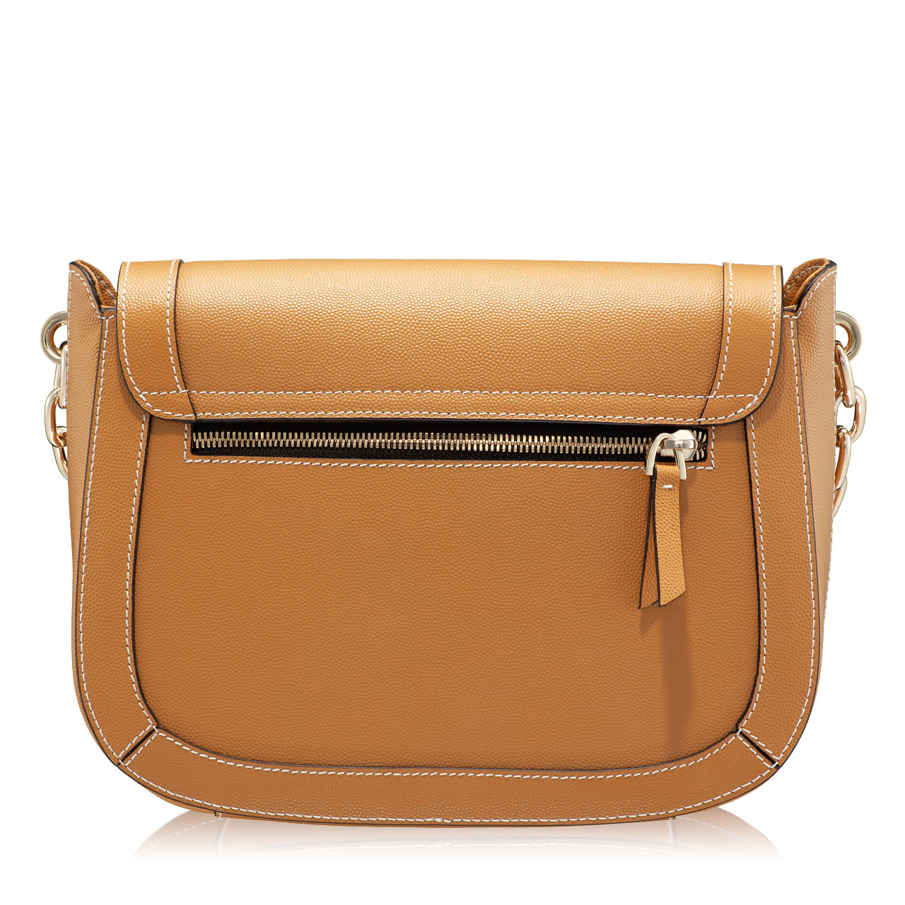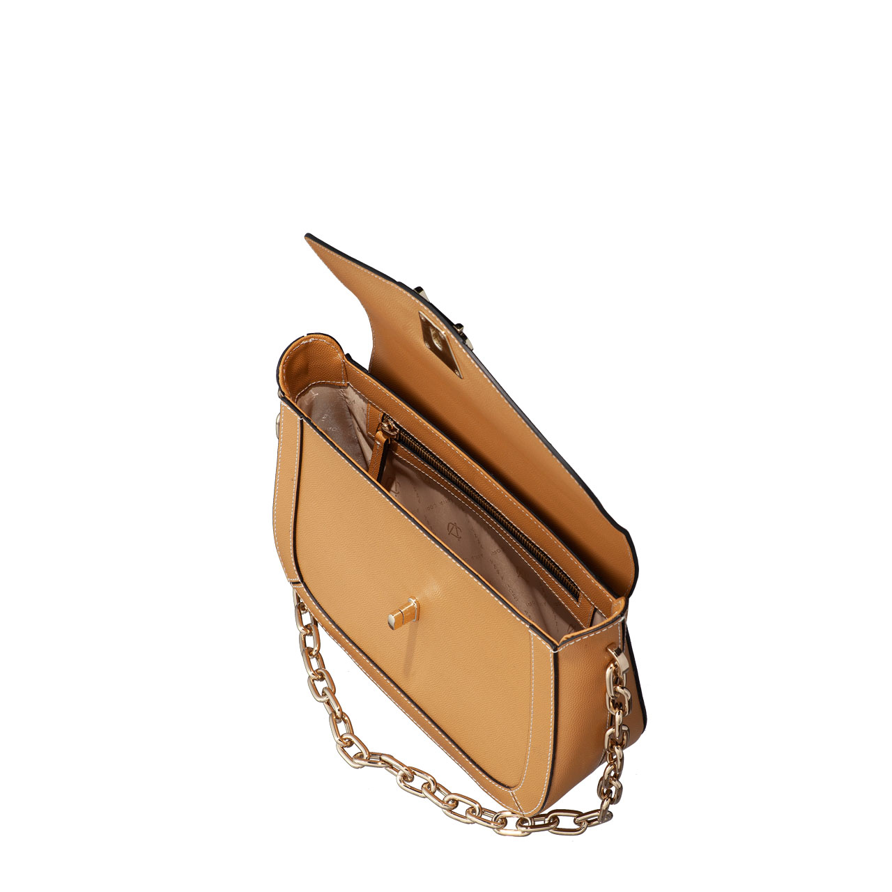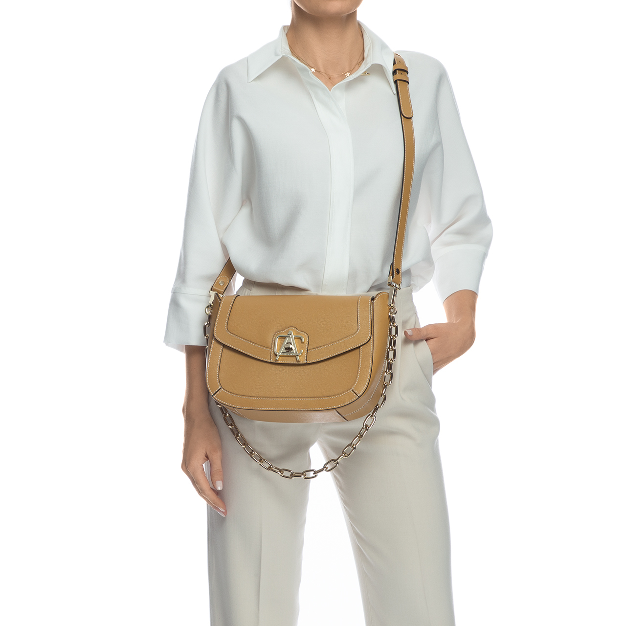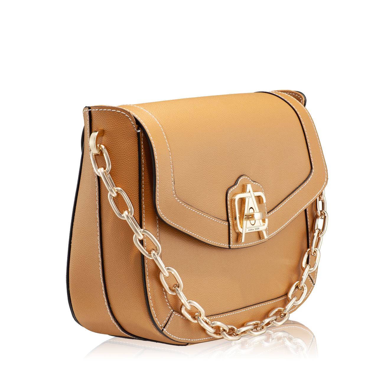 -natural stamped leather-one compartment-two interior pocket-personalised with ANNA CORI monogram-buckle closure-gold color accessory-adjustable and detachable shoulder strap