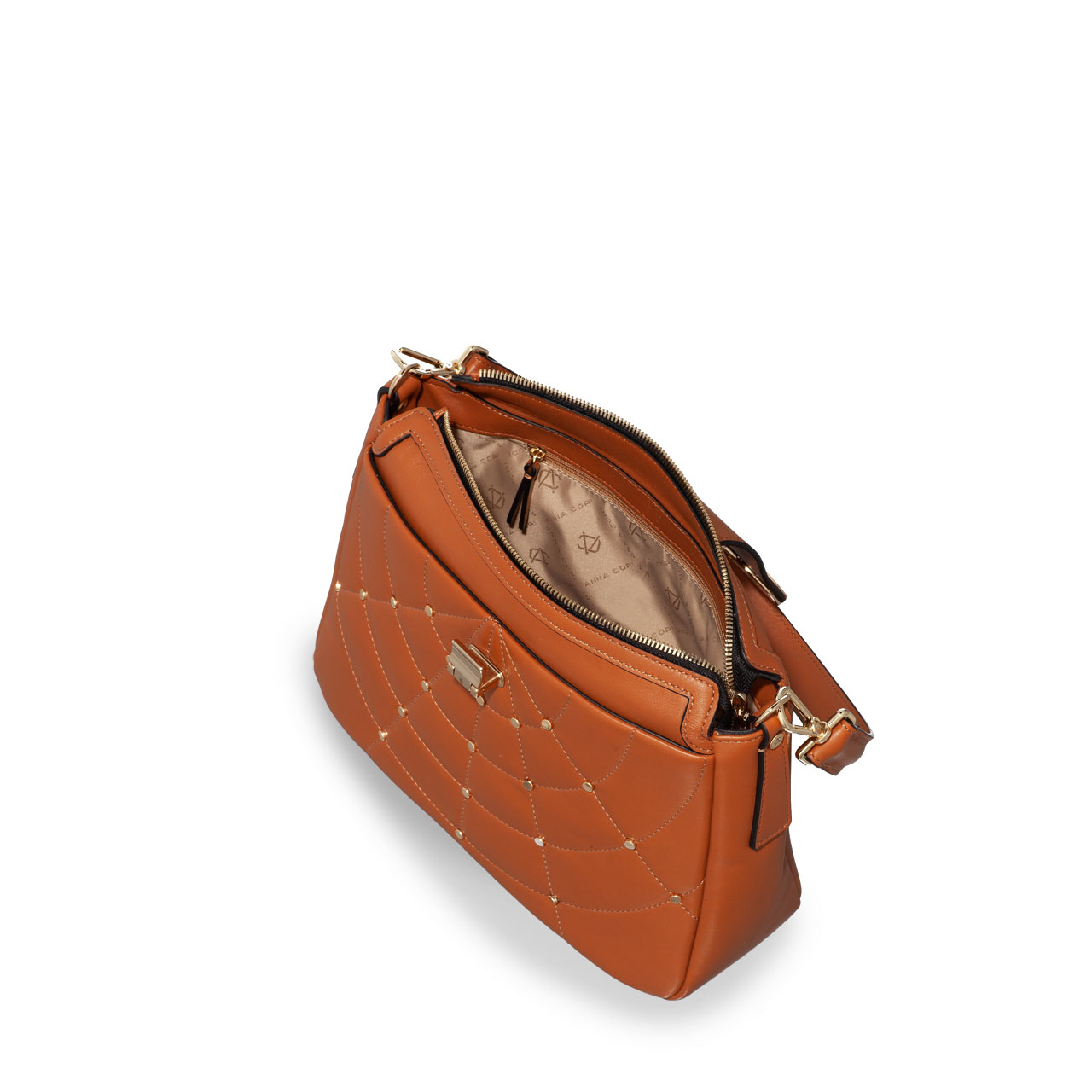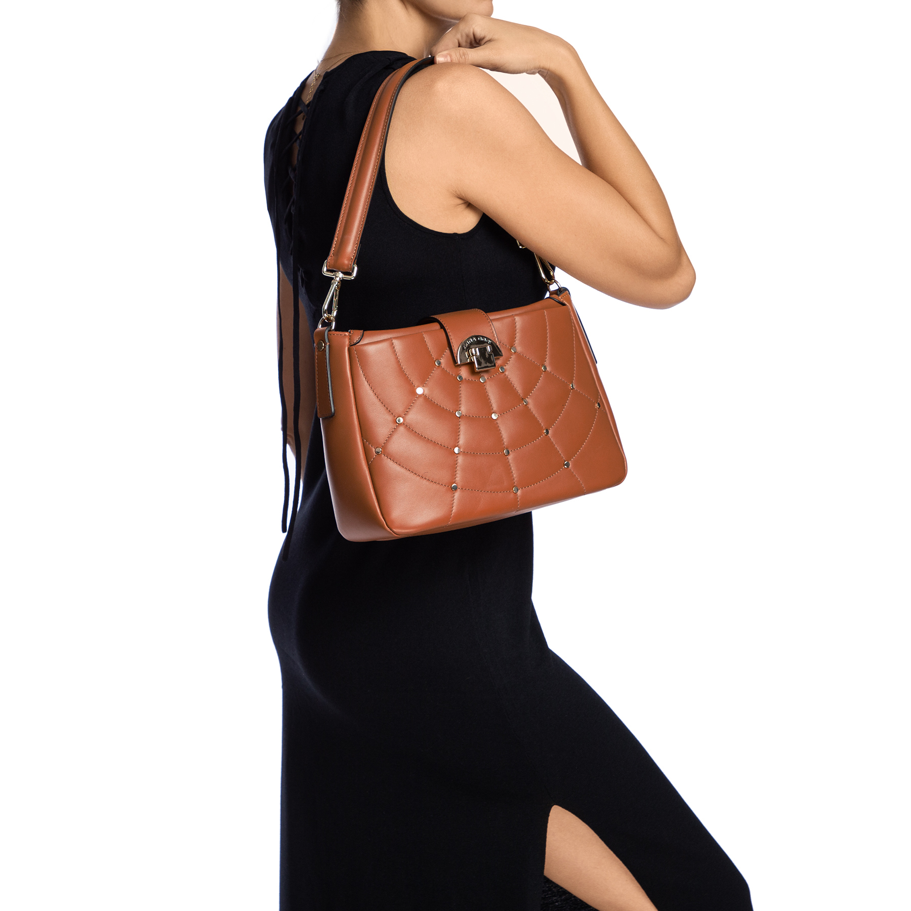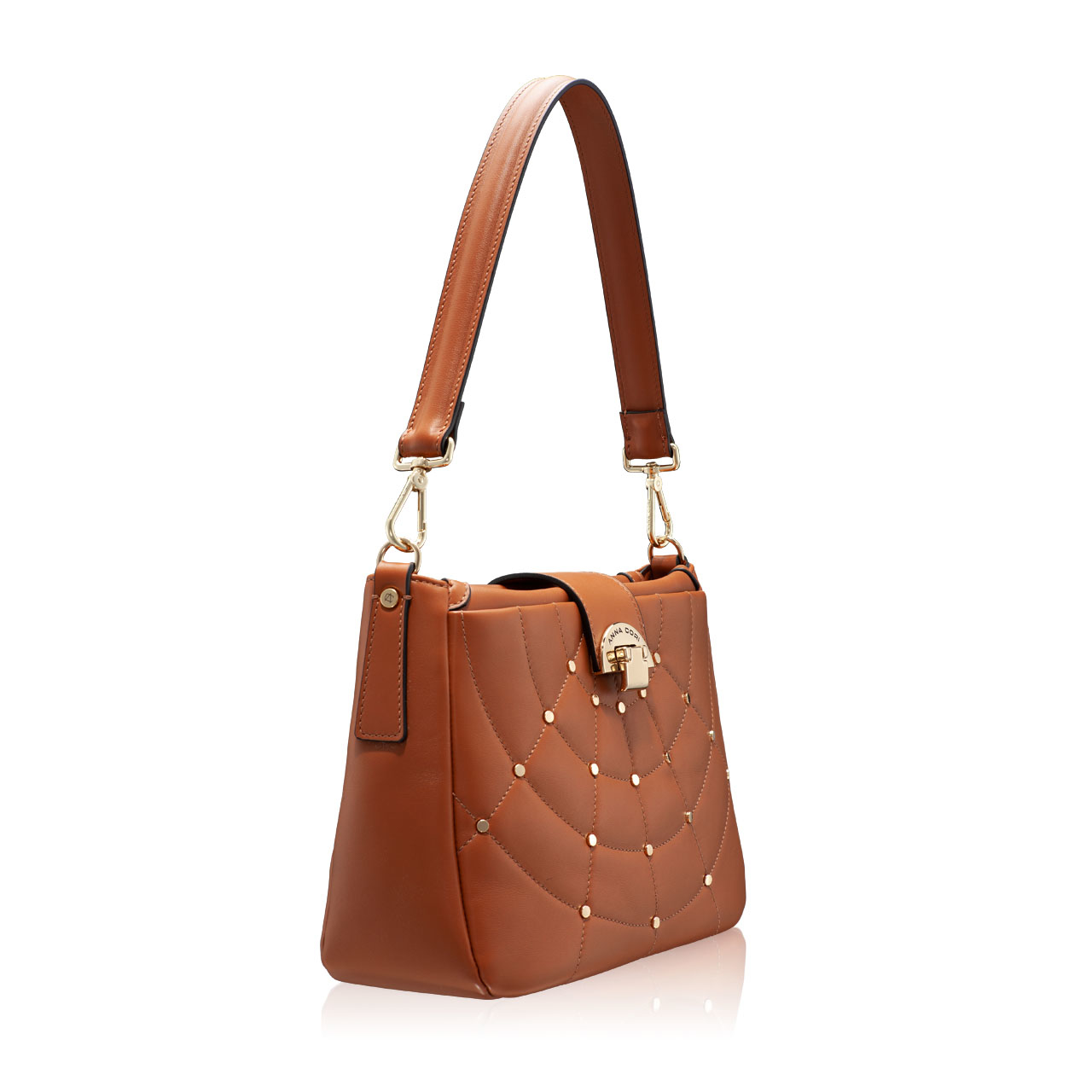 The main feature of this line is the unique pattern made of gold staples and fine stitches. Featuring a detachable genuine leather handle and a removable and adjustable strap, this bag can be worn over the shoulder or across the body. It's a compact bag, but at the same time big enough to carry all your essentials with you and has two outer and two inner pockets.