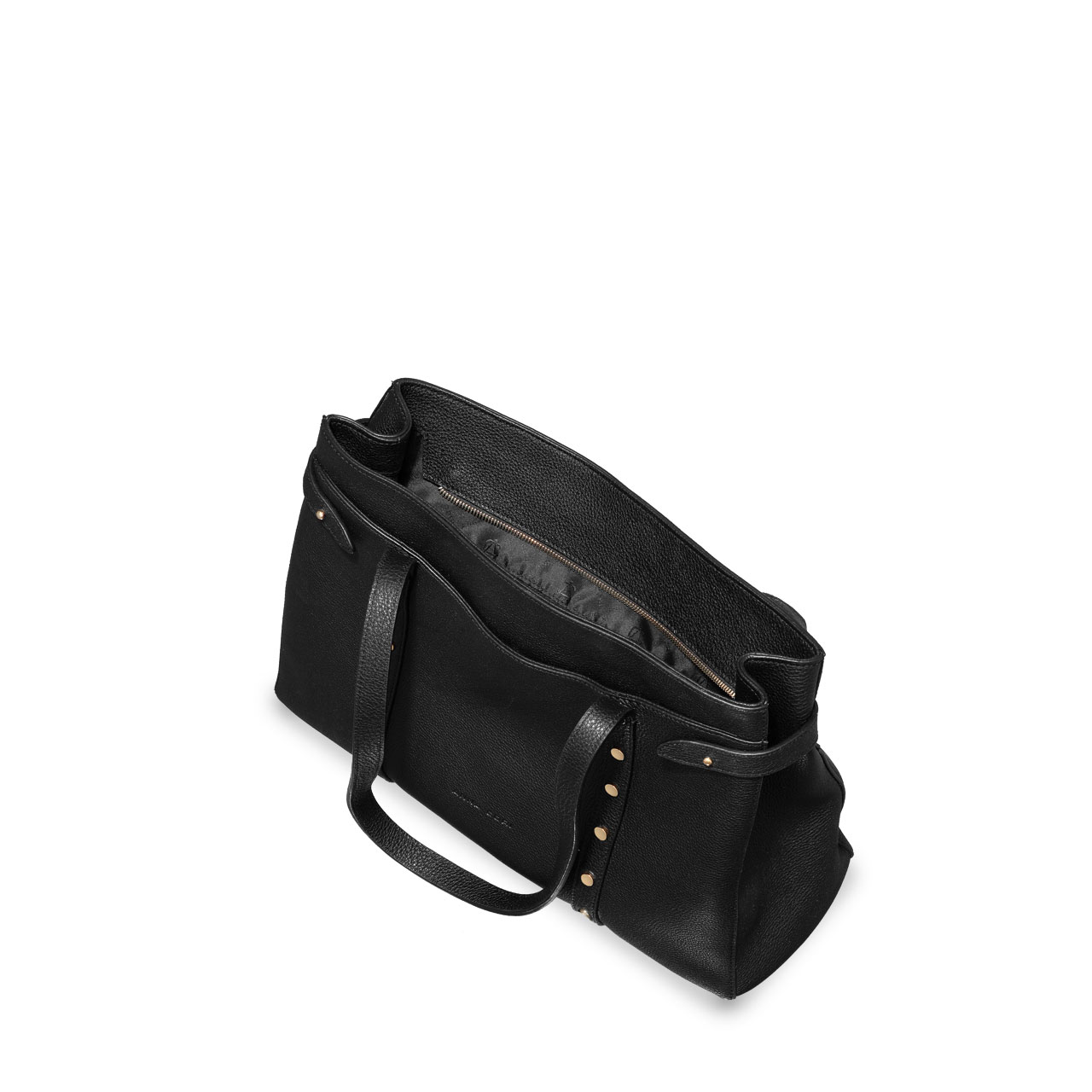 • Exterior: one front pocket with staple and one zipper closure pocket at back