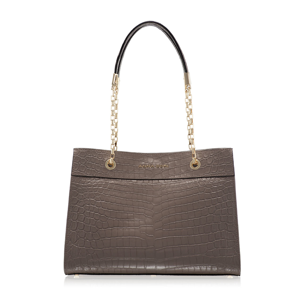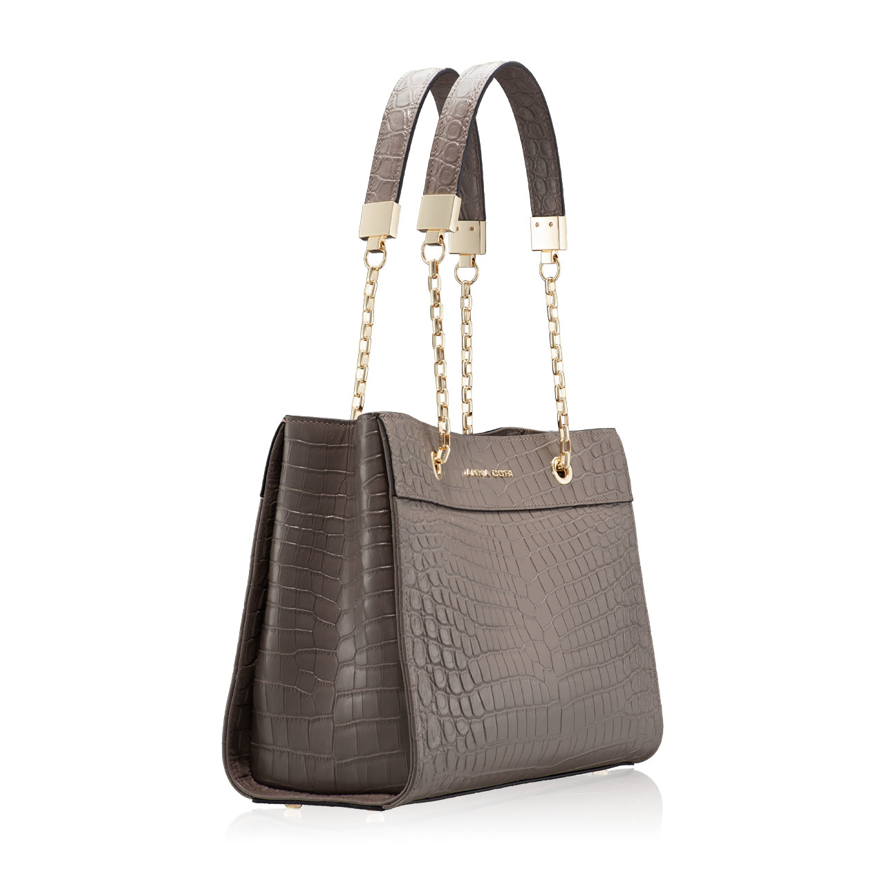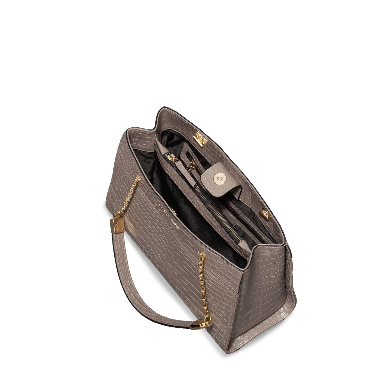 -naturalleather-fabric lining-devided in 2 compartments-2 interior zipper pockets-magnetic top closure-shoulder chain strap