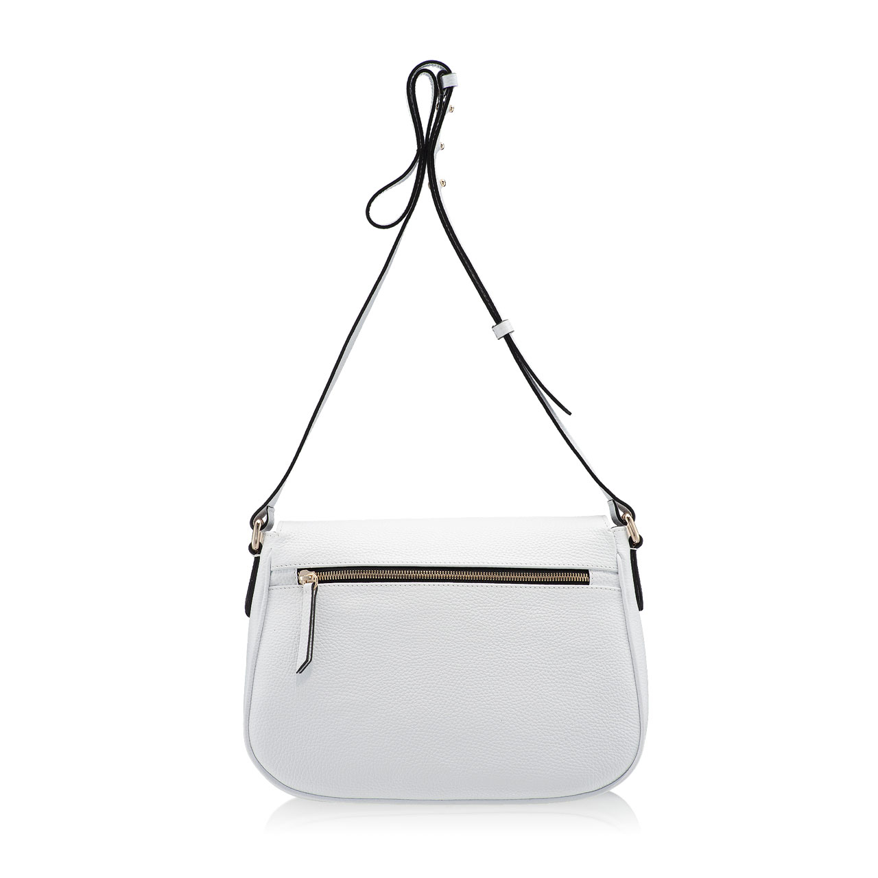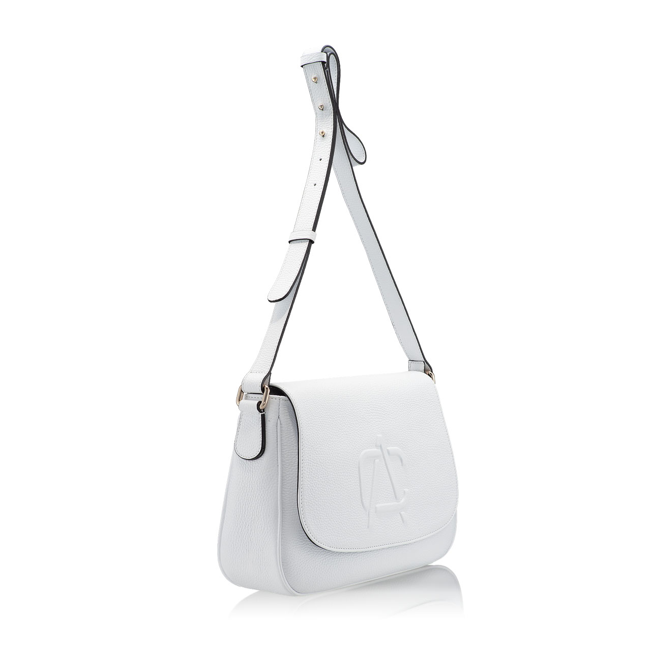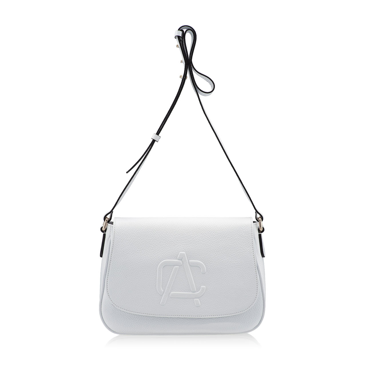 -natural leather-fabric lining-2 compartments-one interior zipper pocket-one exterior zipper pocket-adjustable shoulder strap-magnetic snap closure-Anna Cori monogram