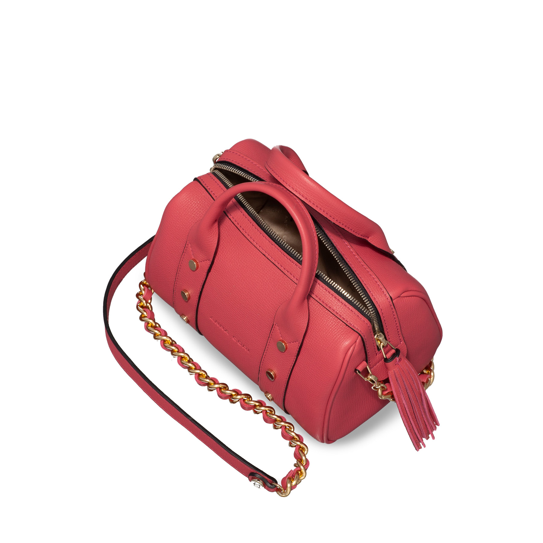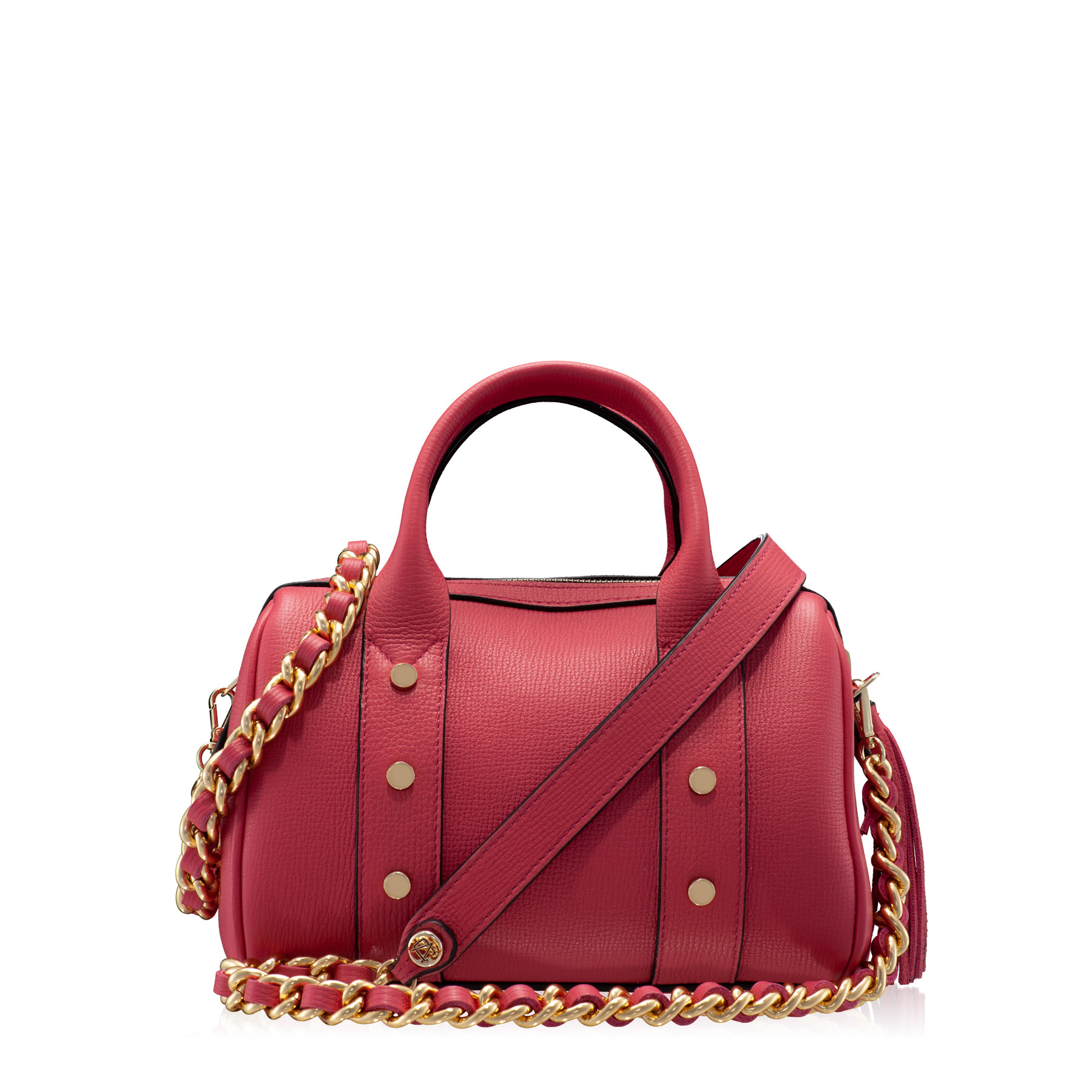 The #PERRY genuine leather bag presents a retro #bauletto style with its special shape. It is accessorized with gold metal staple, genuine leather zipper pulls and a gold metal shoulder chain with genuine leather. It contains one main compartment and two pockets and can be carried by hand or over the shoulder.