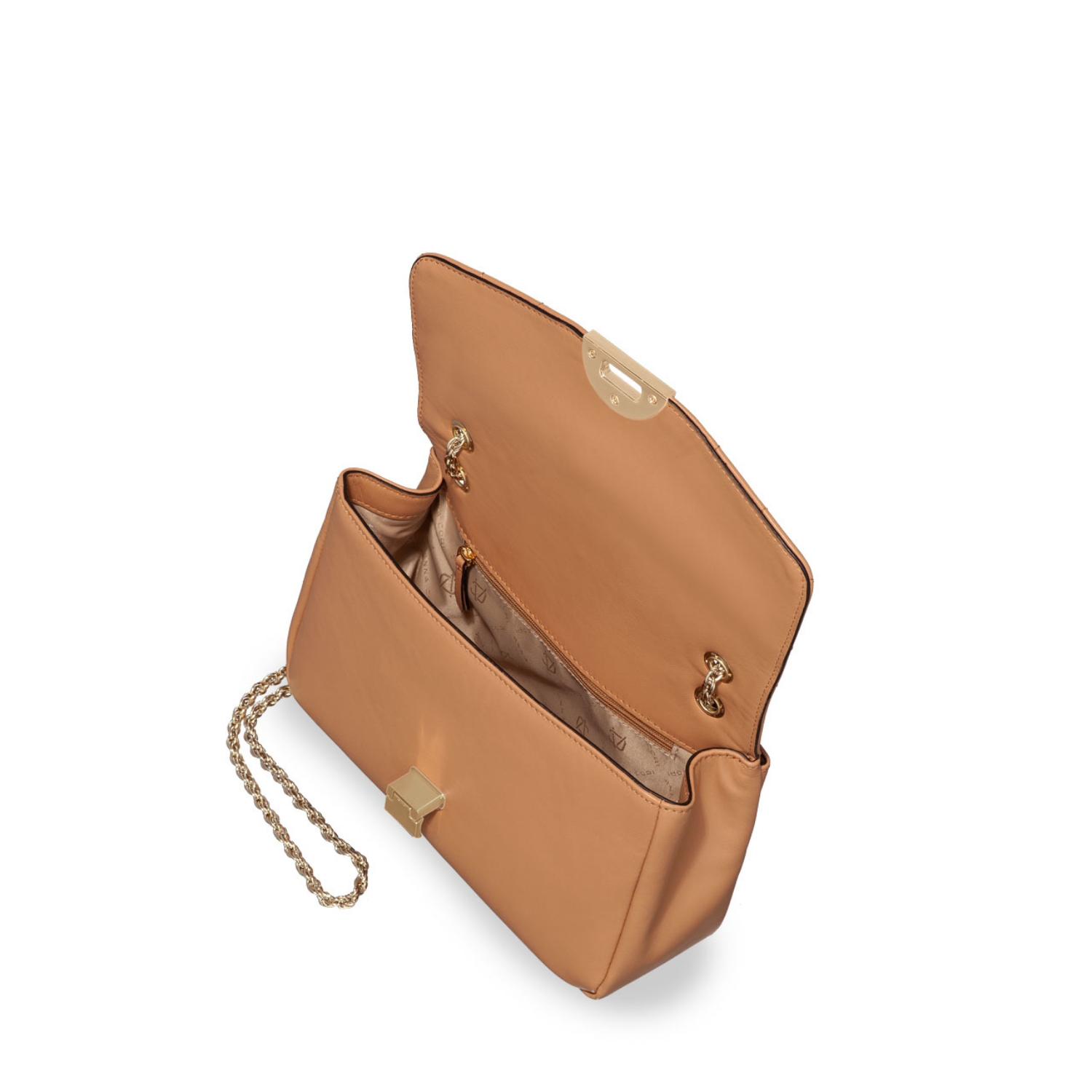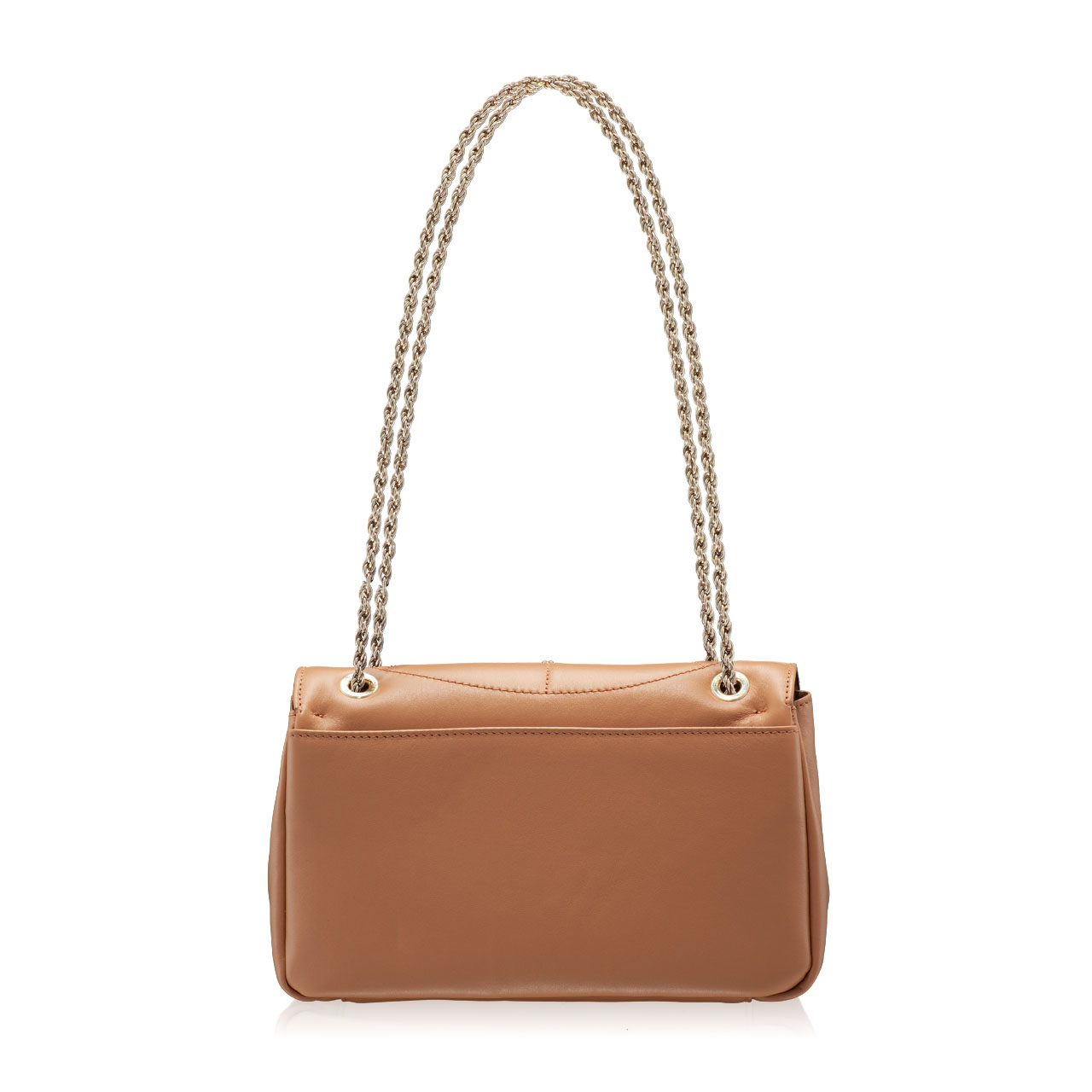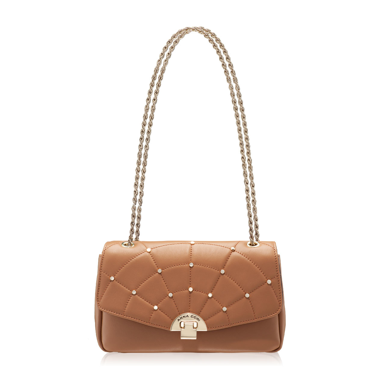 This bag features a metal shoulder chain, is embellished with a unique gold staple pattern and closes with a gold buckle personalized with the Anna Cori logo. The Lesia bag is made of natural leather, in a modern shape, but very roomy and compartmentalized with three pockets.