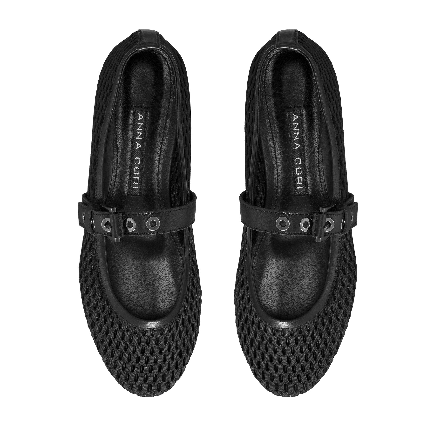 Women's ballet flats made of natural leather and textile material, equipped with a strap and buckle.