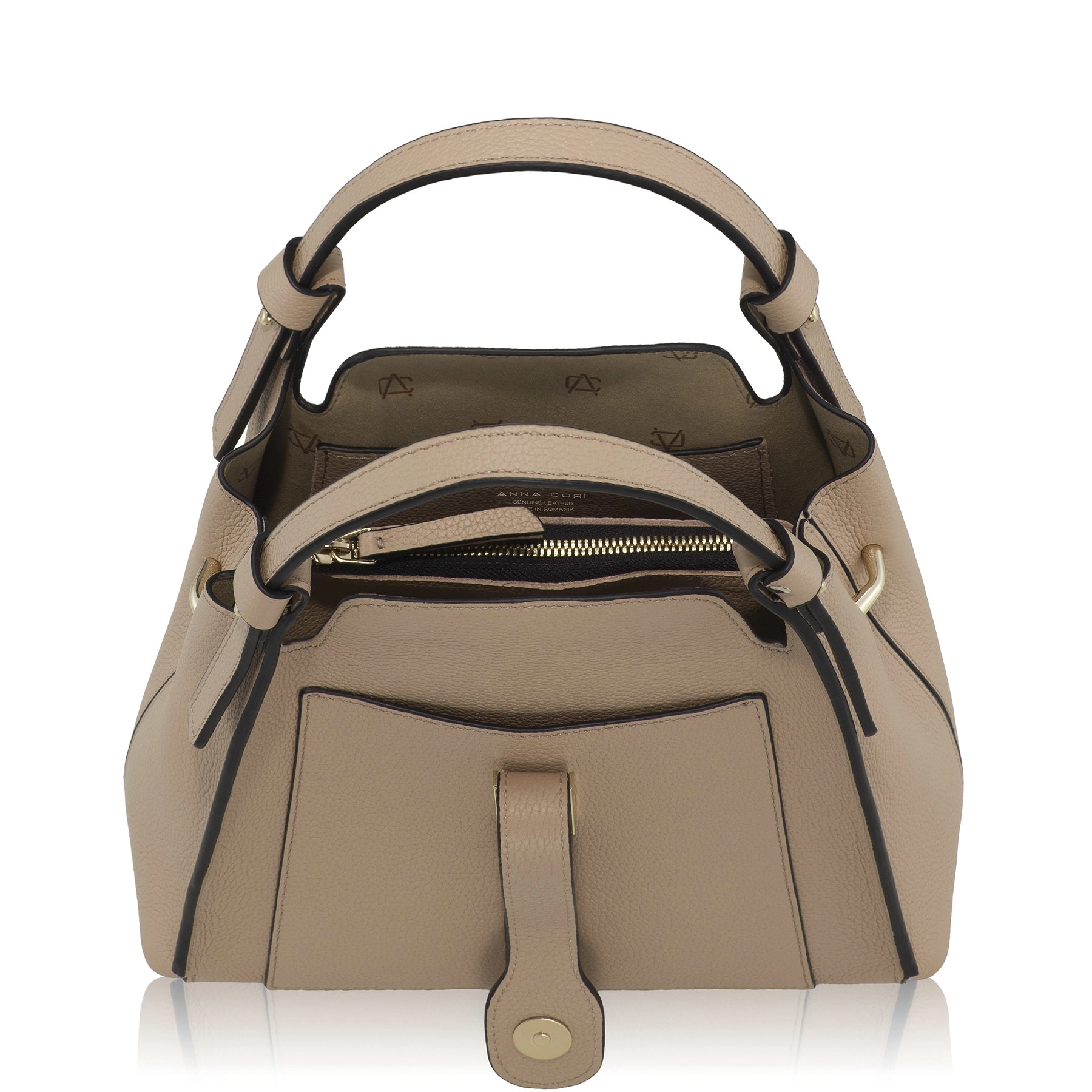 The bag is accessorized with the Anna Cori monogram, and the shoulder strap is both adjustable and detachable.