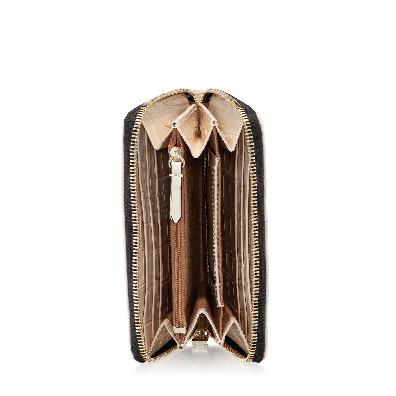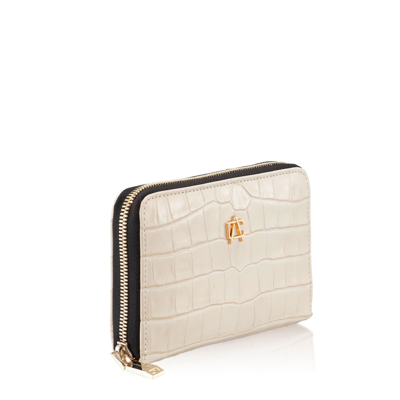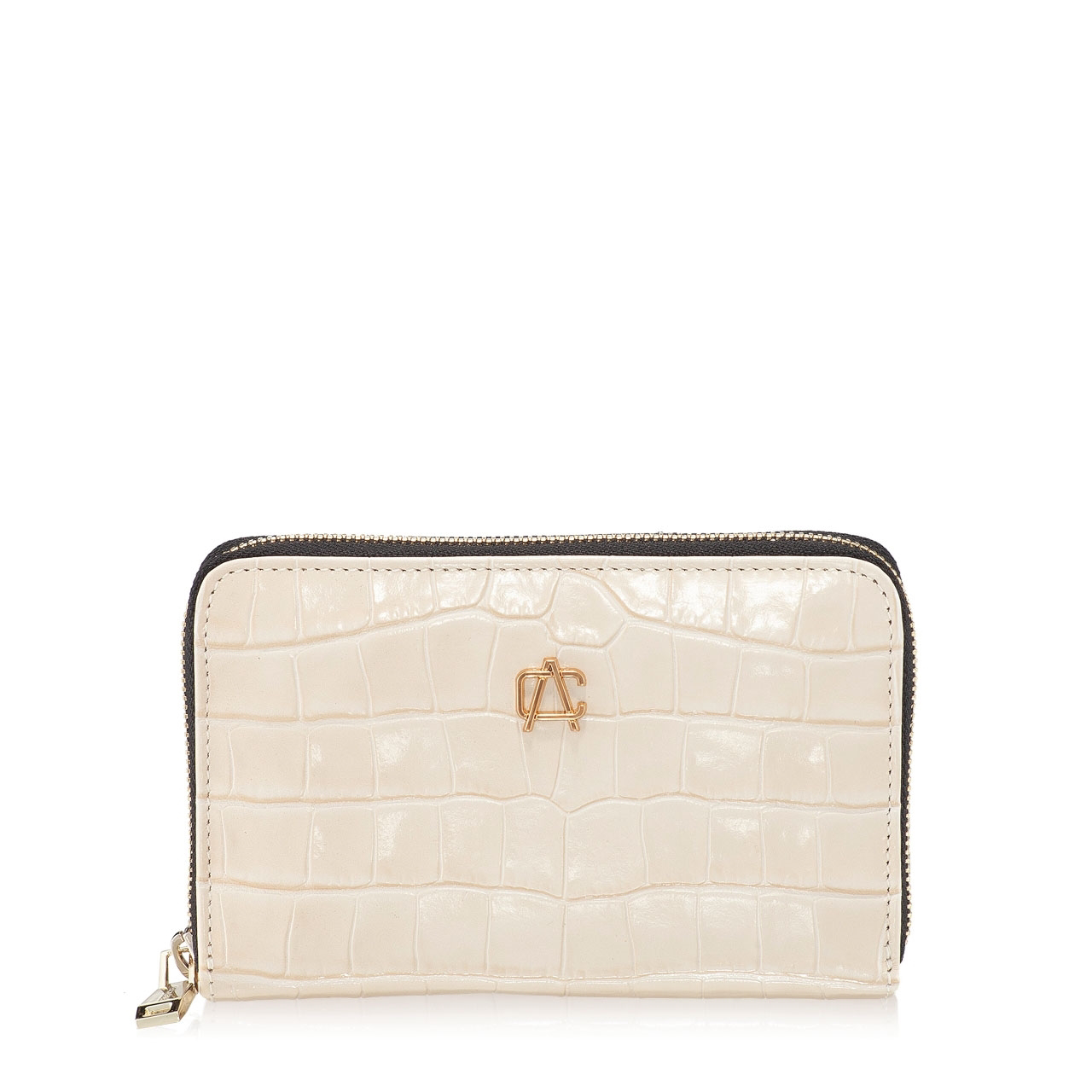 Portofel dama din piele naturala croco, personalizat cu monograma ANNA CORI. Este prevazut cu 3 compartimente, un buzunar cu fermoar pentru monede si 8 spatii pentru carduri.Inchiderea se face cu fermoar.