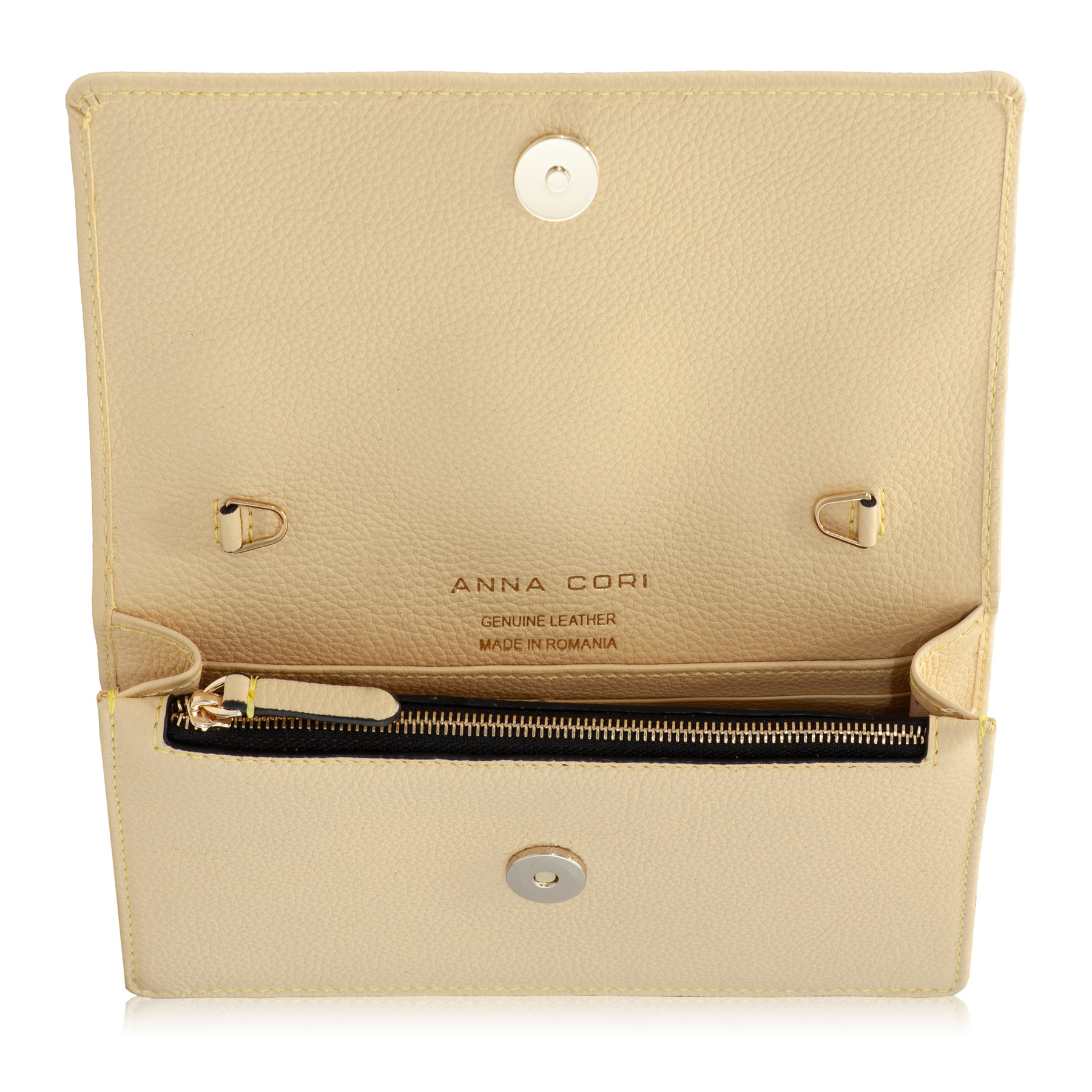Geanta plic #ARNA este un model Icon Anna Cori datorită eleganței de care dă dovadă și diversității nuanțelor în care se regăsește. Este compartimentată într-un mod complex, având două compartimente, un buzunar central cu fermoar și 6 spații pentru depozitare carduri. Monograma Anna Cori din metal auriu adaugă un plus de eleganță.