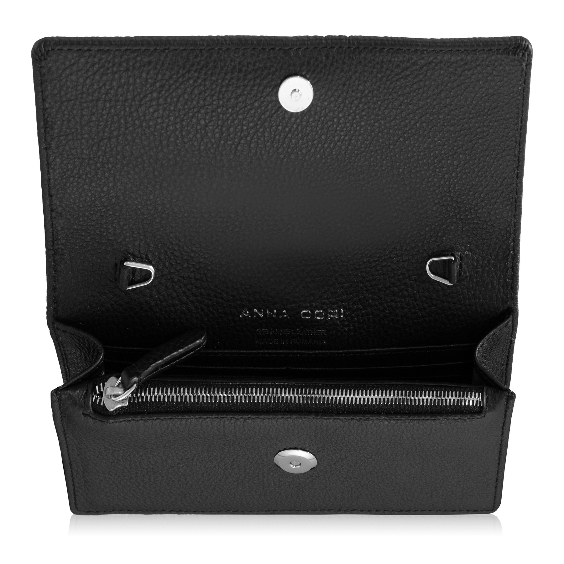 Geanta plic #ARNA este un model Icon Anna Cori datorită eleganței de care dă dovadă și diversității nuanțelor în care se regăsește. Este compartimentată într-un mod complex, având două compartimente, un buzunar central cu fermoar și 6 spații pentru depozitare carduri. Monograma Anna Cori din metal auriu adaugă un plus de eleganță.