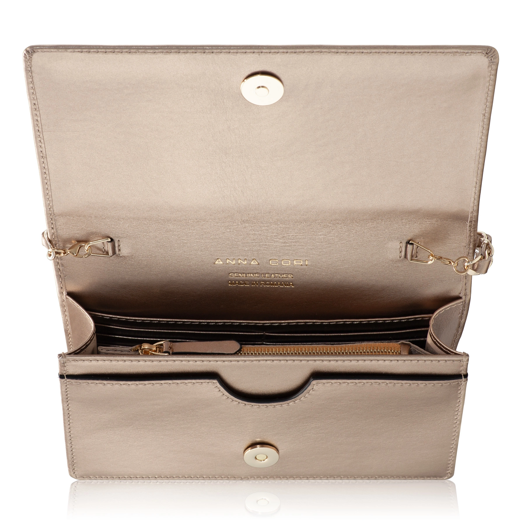 Geanta plic #ARNA este un model Icon Anna Cori datorită eleganței de care dă dovadă și diversității nuanțelor în care se regăsește. Este compartimentată într-un mod complex, având două compartimente, un buzunar central cu fermoar și 6 spații pentru depozitare carduri. Monograma Anna Cori din metal auriu adaugă un plus de eleganță.