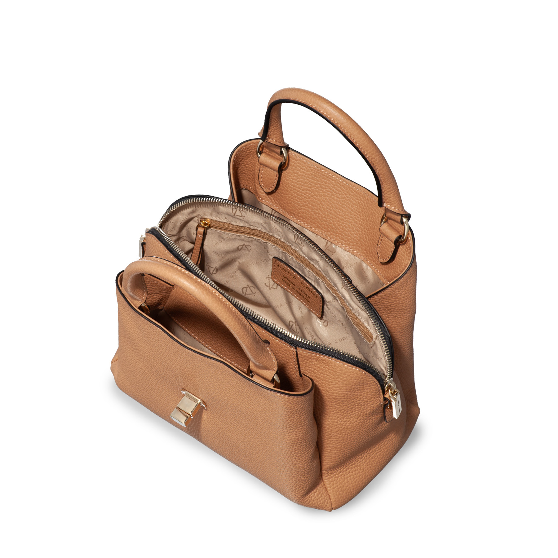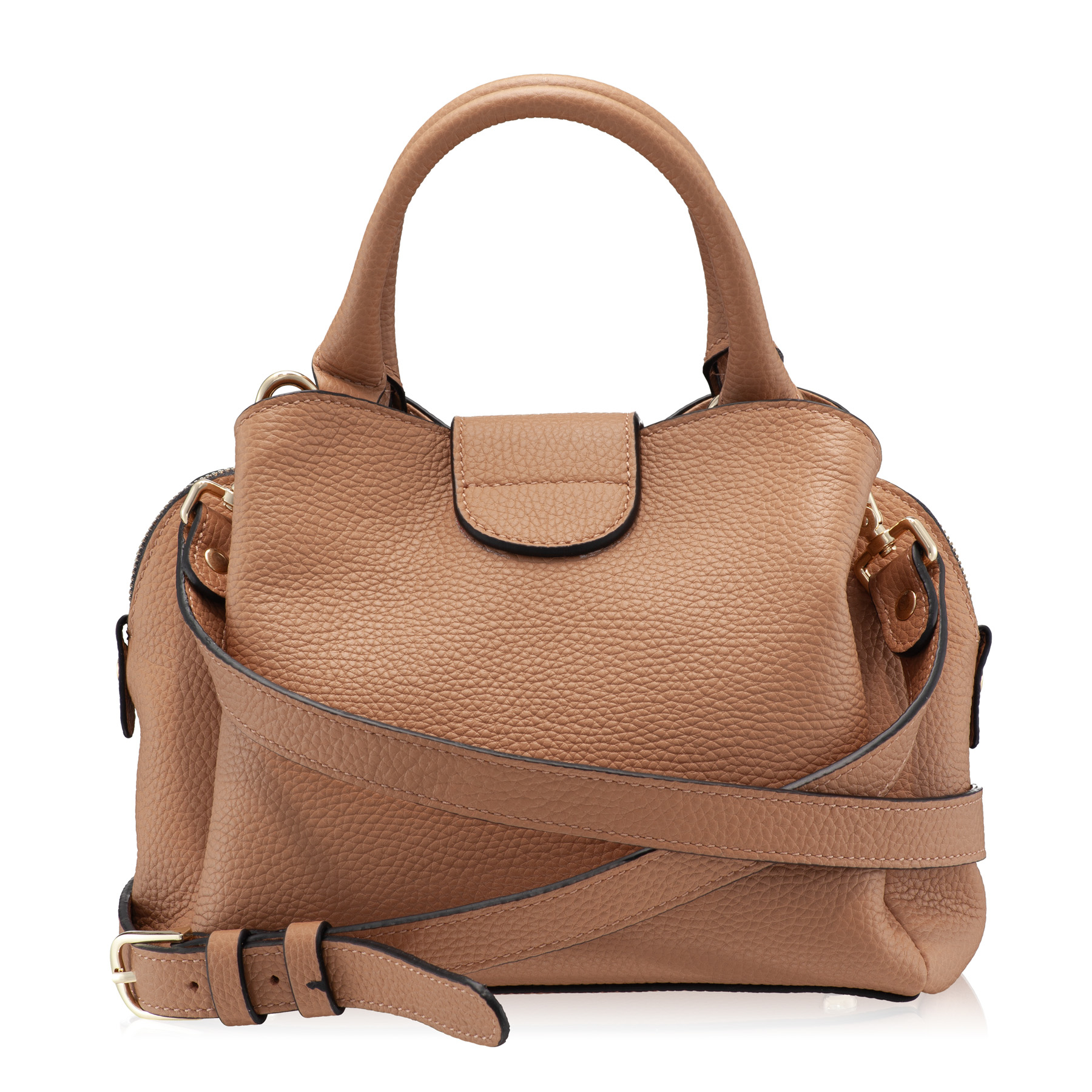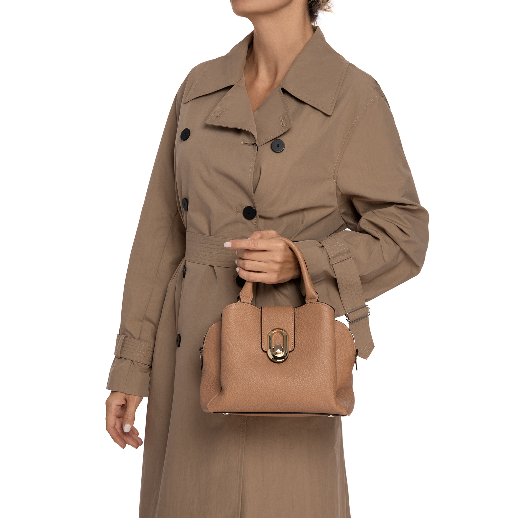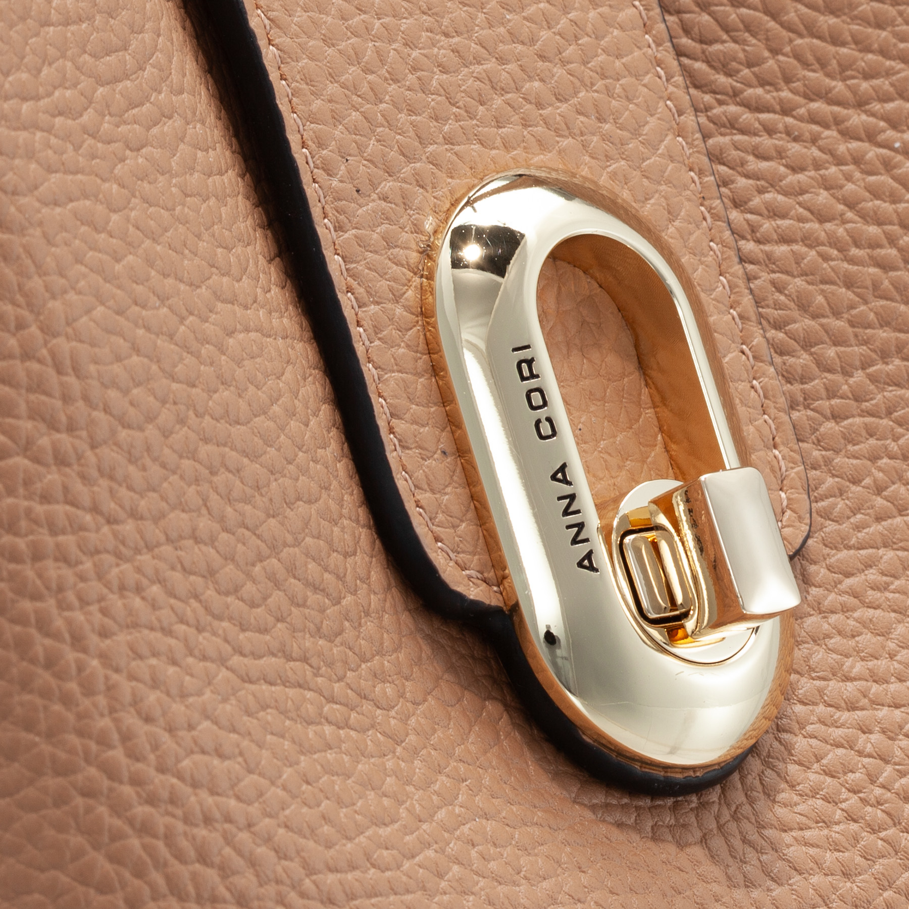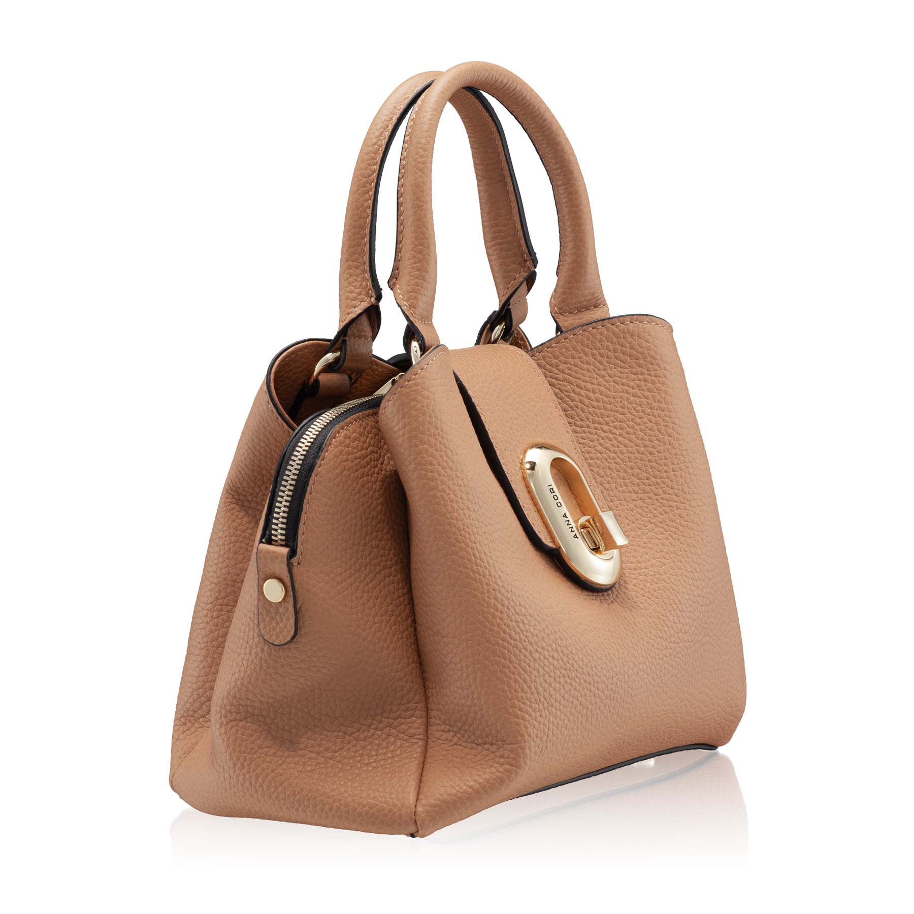 Geanta #Betia este creată într-o formă flexibilă, cu un interior spațios și multe buzunare. Designul ei este accentuat prin catarama de închidere din metal auriu si prin mânerele din piele naturală.