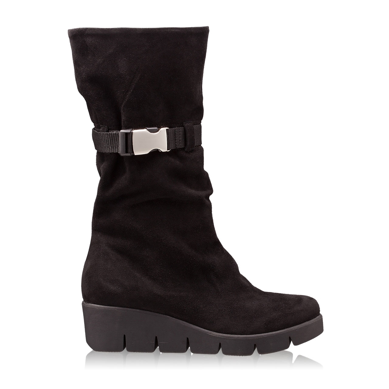 Botine dama din piele intoarsa cu platforma, prevazute cu detaliu lateral.