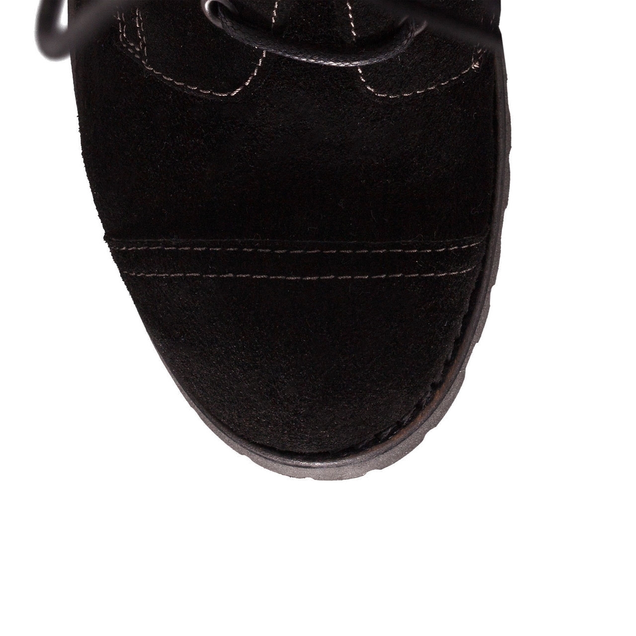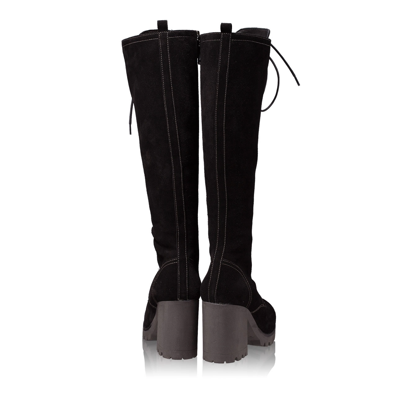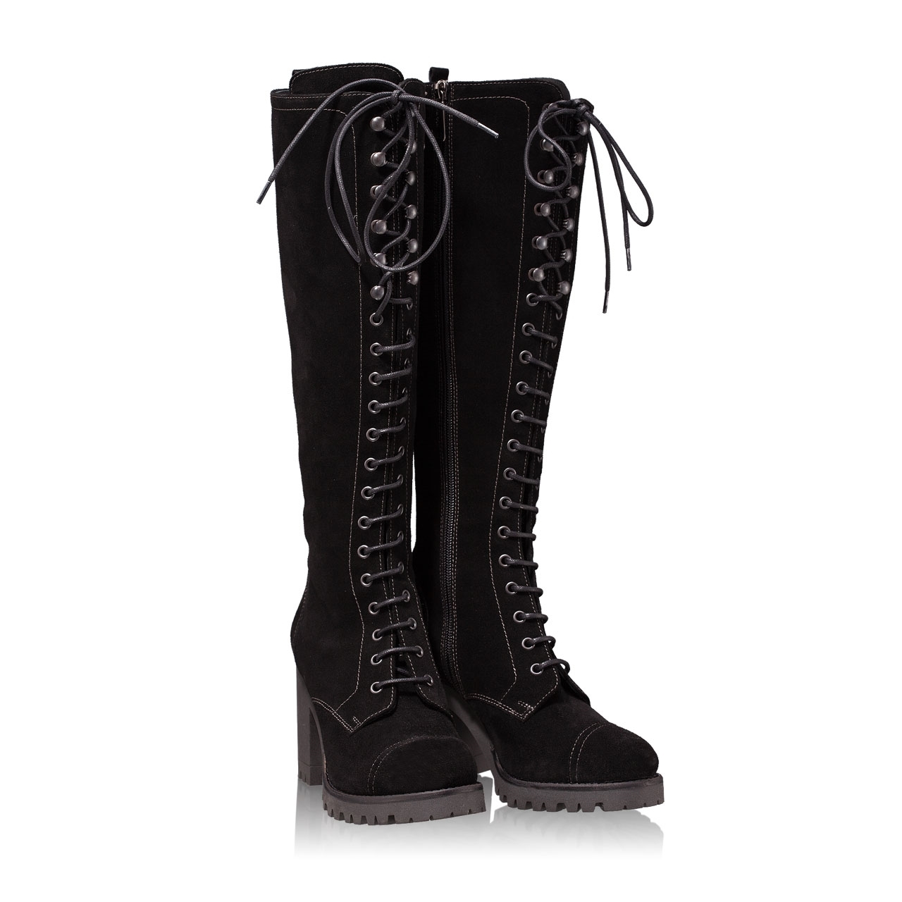 Cizme dama cu toc mediu, din piele intoarsa.Sunt prevazute cu fermoar lateral si cu siret in partea din fata.