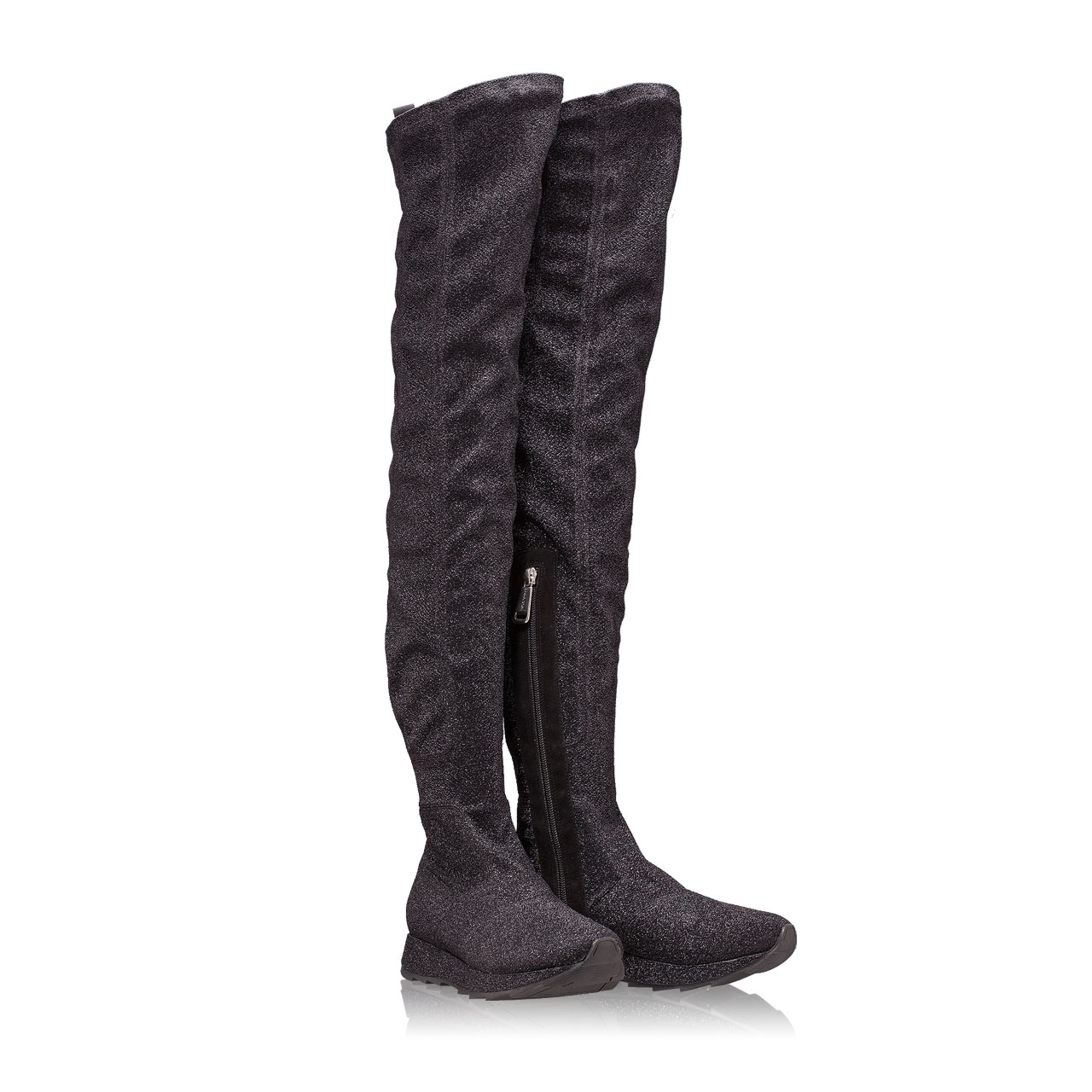 Cizme dama peste genunchi, din material stretch glitter.Inchiderea se face cu fermoar lateral.