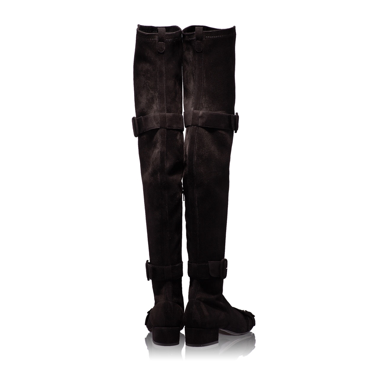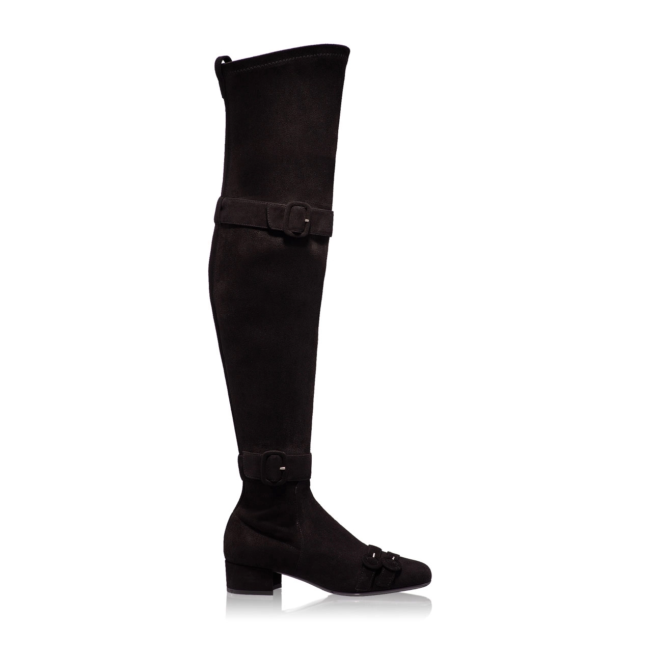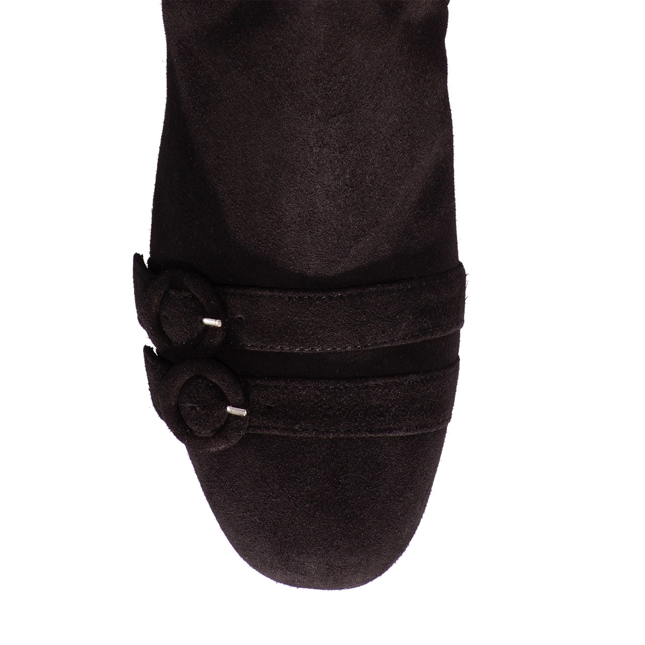 Cizme dama din piele intoarsa si material stretch, accesorizate cu catarame.Inchiderea se face cu fermoar.