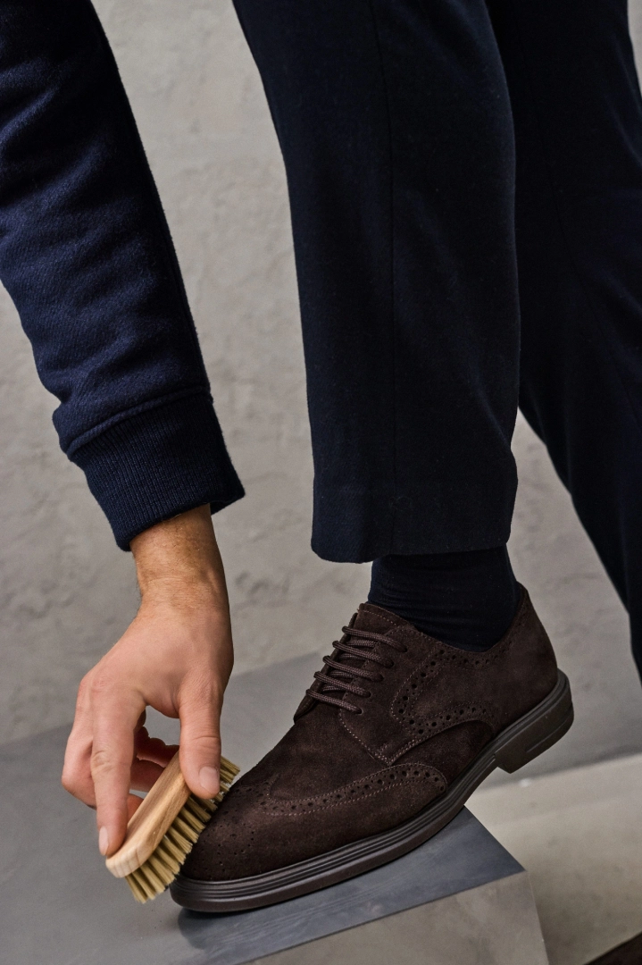 În cazul ghetelor din nabuc sau piele suede folosește o perie multifuncțională, destinată pielii întoarse, pentru a îndepărta reziduurile de la suprafață. Mișcările corecte sunt de ștergere și nu de frecare, pentru a nu deteriora materialul destul de sensibil. Dacă există pete dificile, un produs special conceput pentru piele suede și nabuc este o alegere bună. La final, lasă ghetele la uscat și când sunt complet uscate periază-le cu o perie pentru pielea întoarsă. Opțional, poți folosi un spray de impermeabilizare, care să asigure un plus de protecție pentru ghetele tale.