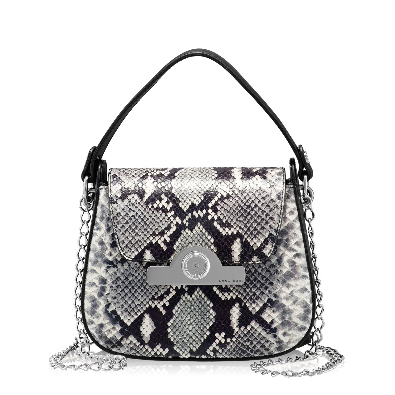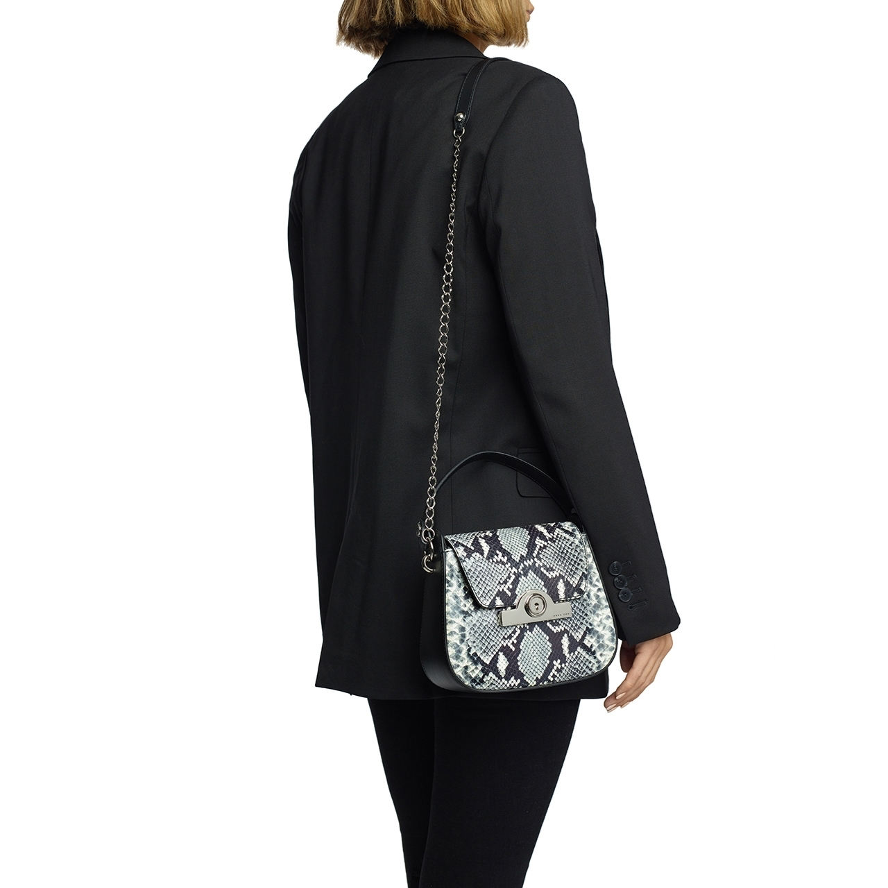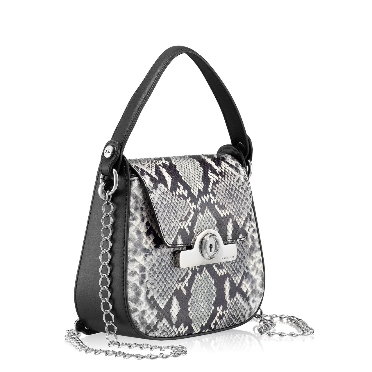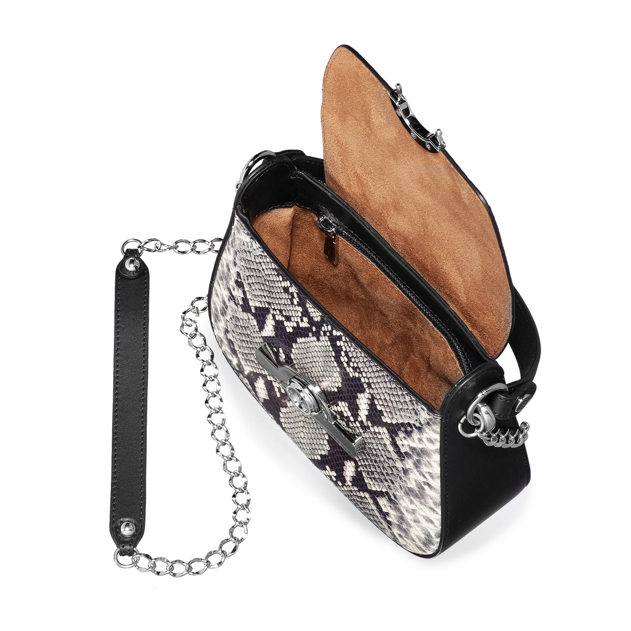 Geanta dama de umar din piele naturala stampata cu accesorii metalice personalizate.?Este prevazuta cu un singur compartiment si un buzunar interior.