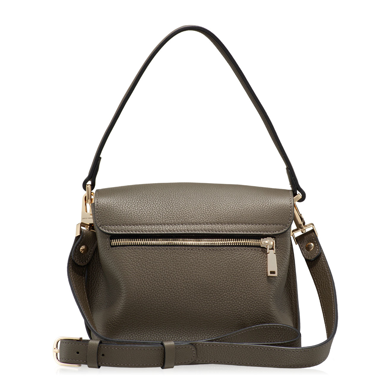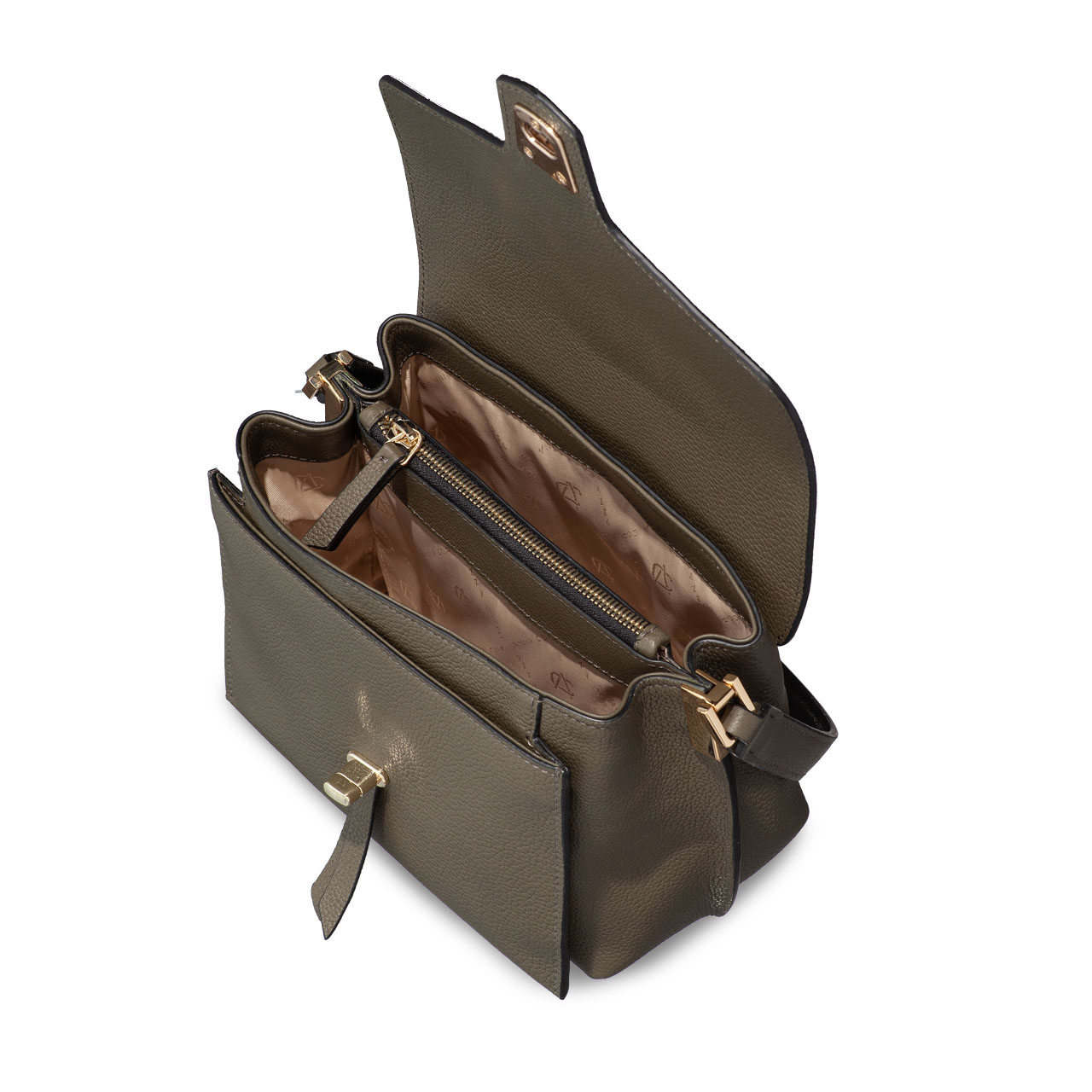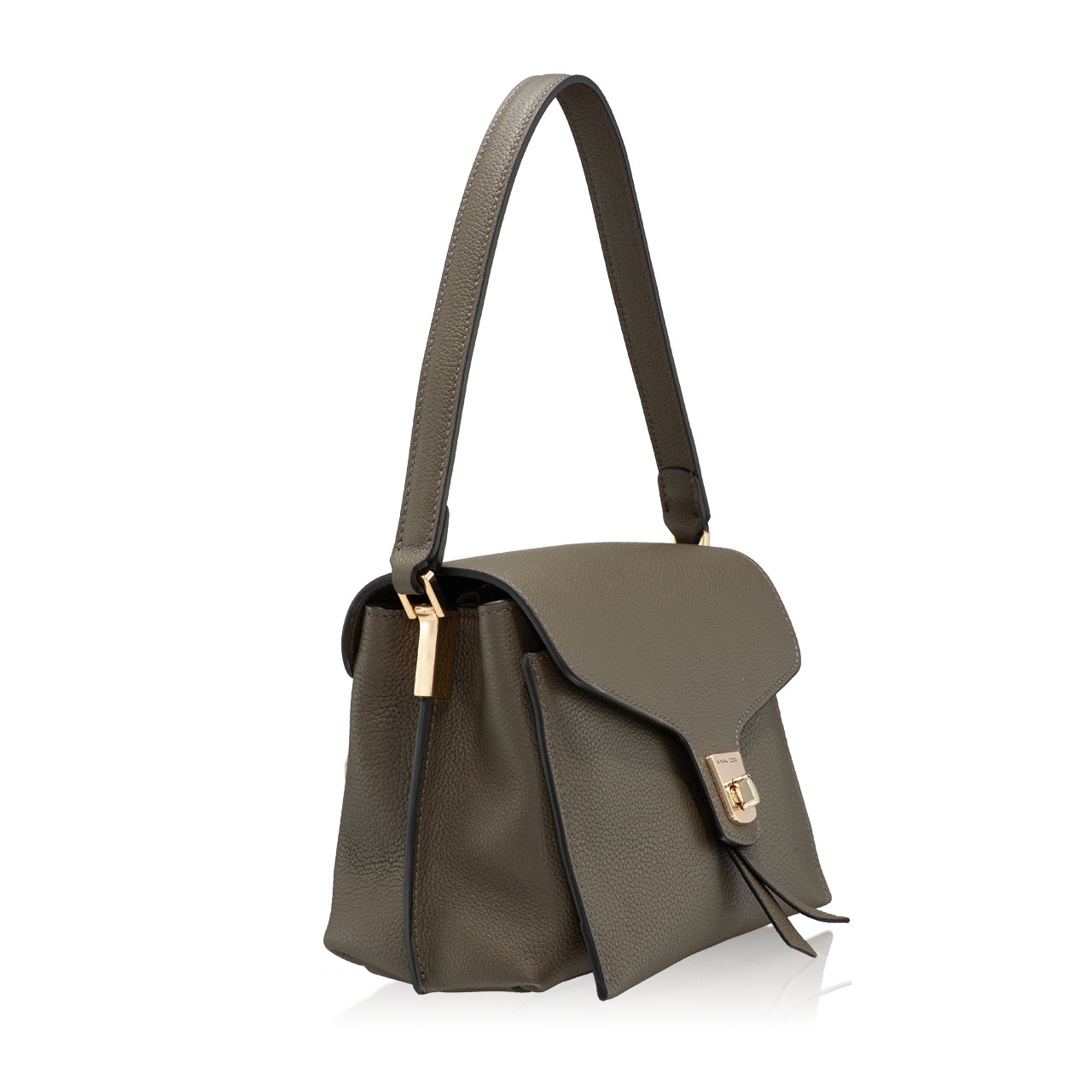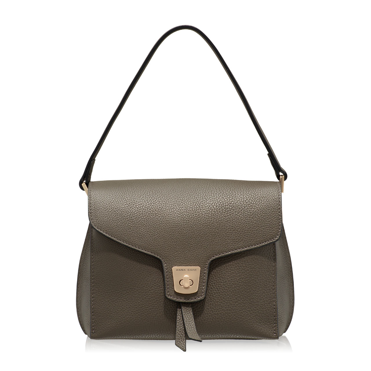 Geanta de mana din piele naturala prevazuta cu accesorii personalizate cu logo-ul Anna Cori.Contine trei compartimente interioare, un buzunar interior cu fermoar si un buzunar exterior cu fermoar.Bareta de umar este ajustabila si detasabila.